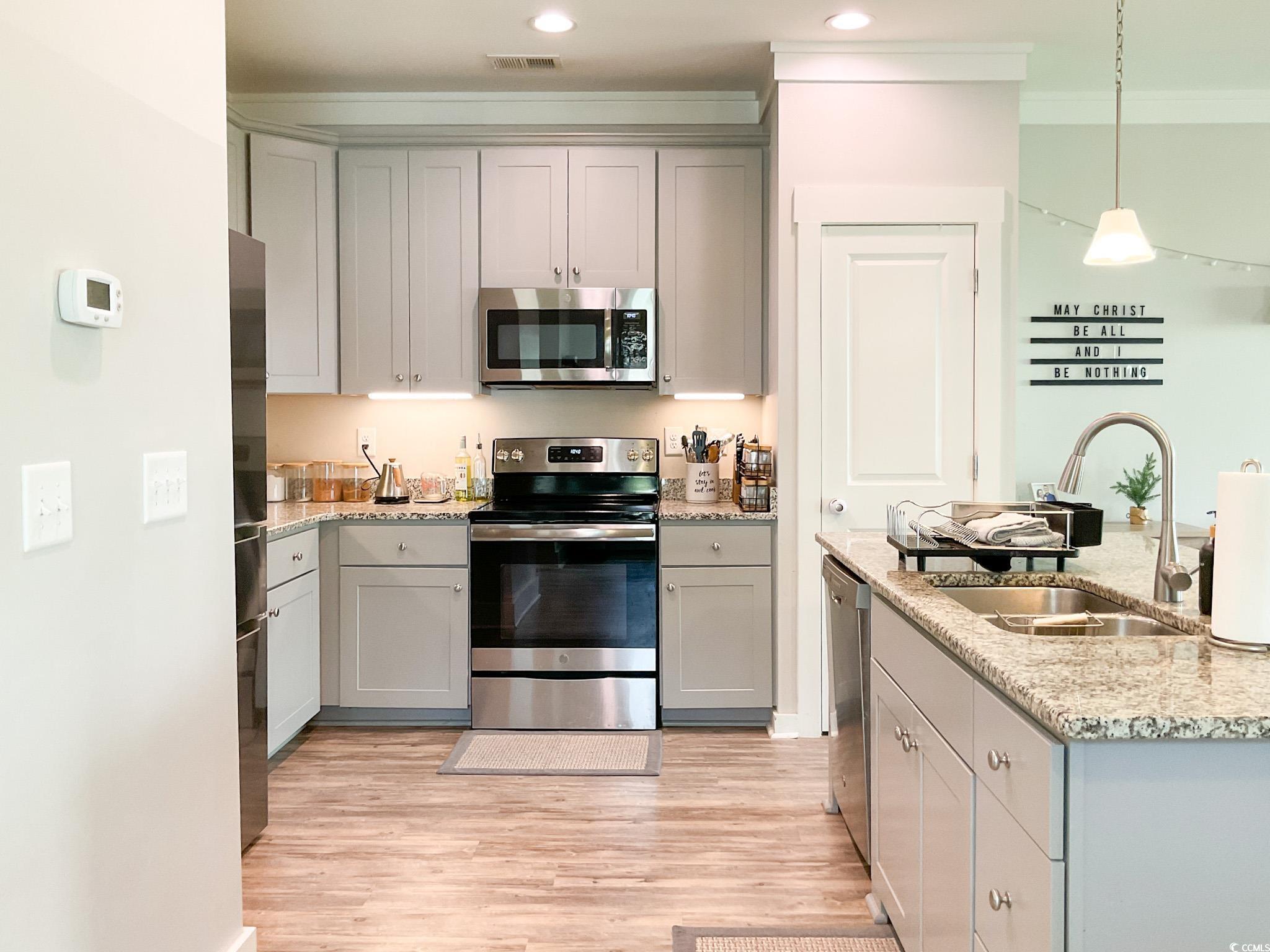 Welcome to 200 Button Willow Street, a move-in-ready 3-bedroom, 2.5-bath end-unit townhome in the desirable Townes at Eastside. Built in 2017 and providing 1,552 square feet, this home features a modern, open-concept layout with granite countertops, stainless steel appliances (all convey except fridge), a walk-in pantry, and a spacious center island in the kitchen. Enjoy luxury vinyl plank flooring downstairs, cozy carpeting upstairs, and an abundance of natural light thanks to the home's end-unit position. Upstairs you'll find a spacious primary suite with a dual vanity and glass shower, two secondary bedrooms, a full bath with tub/shower combo, and a walk-in laundry room. Downstairs also includes a half bath for guests. Storage is plentiful with generous closets and pull-down attic access. Exterior features include a charming stone-accented entry, covered front porch, landscaped front yard, and a private rear patio all maintained by the HOA, which also covers the roof, siding, and lawn care. A smart thermostat, 1-car garage, and concrete driveway complete the package. Conveniently located just 15 minutes from downtown Greenville, 5 miles from I-85, and minutes to BMW, Michelin, shopping, and Eastside High School. This home is perfect for first-time buyers, young professionals, or retirees seeking low-maintenance, affordable living in a quiet, walkable neighborhood. Down payment assistance may be available. Dont miss this excellent opportunity in one of Taylors' most in-demand communities!