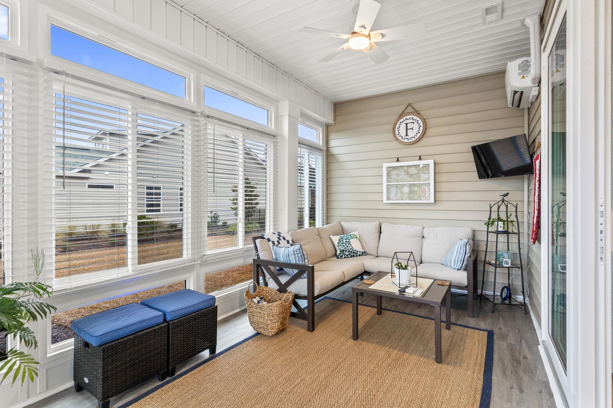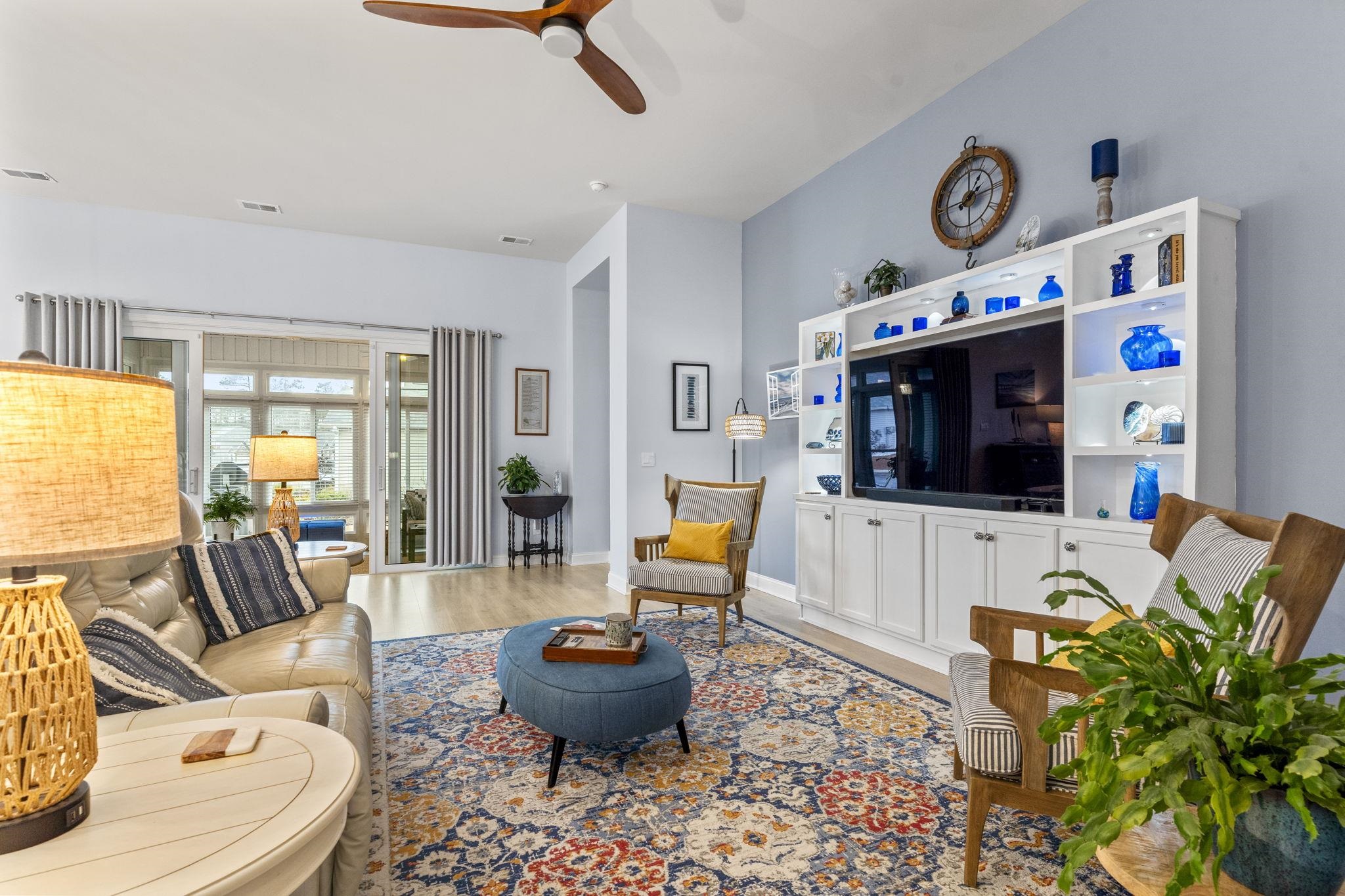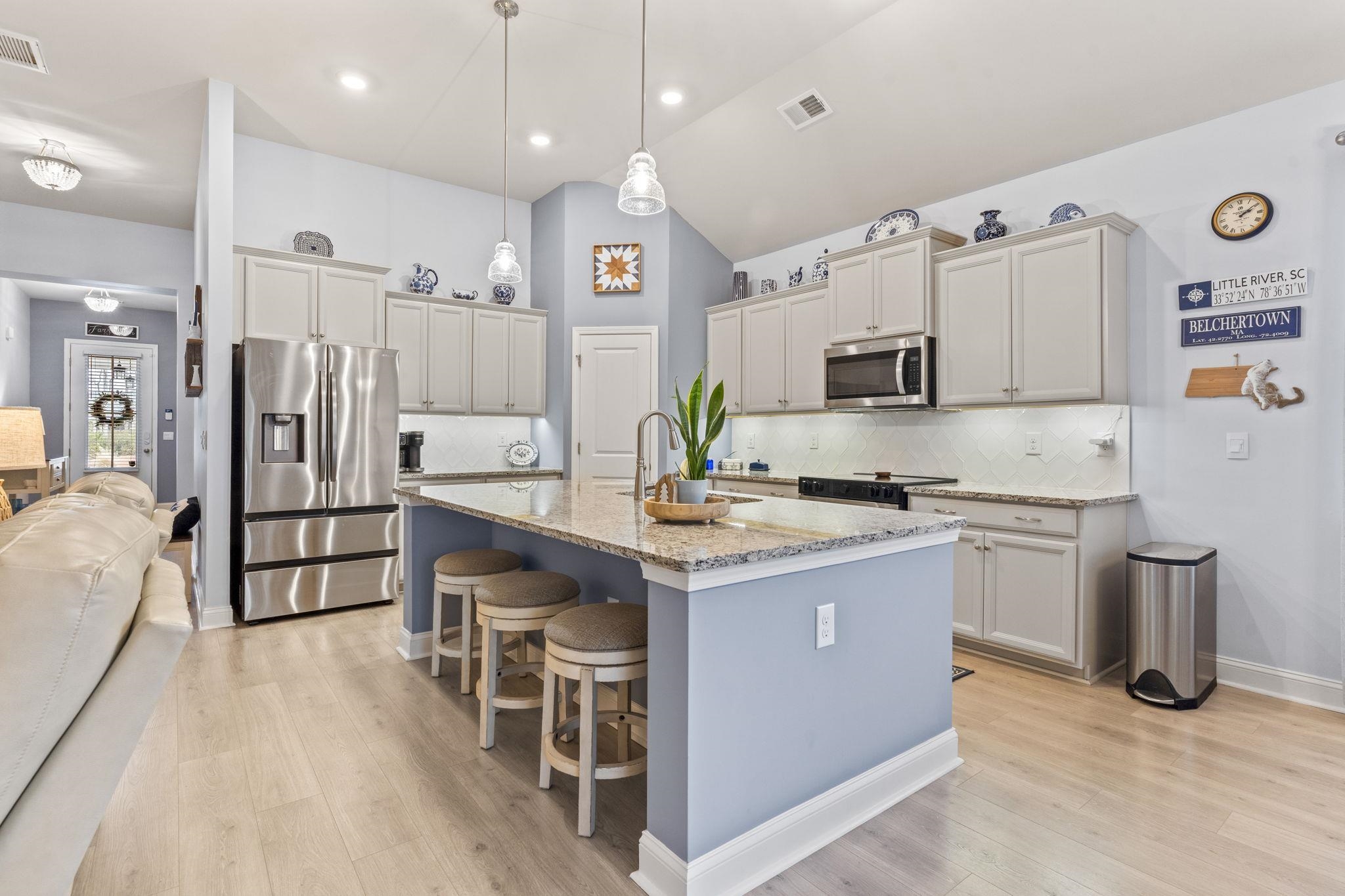 Welcome to the highly desirable Litchfield plan in Heather Glen, where resort-style amenities and thoughtful design come together. Residents enjoy a spacious clubhouse with sweeping verandas, an impressive swimming pool, conditioned fitness center, fenced dog park, playground, and even a charming blueberry garden. This beautiful four-bedroom home offers single-level living, making it both functional and comfortable. The open-concept layout is filled with natural light from abundant windows, while 11-foot ceilings in the main living areas create an airy, welcoming space perfect for entertaining. The home features granite countertops, stainless steel appliances, and durable wide-plank laminate wood flooring throughout the main living areas. The washer and dryer convey, along with an additional two-year-old refrigerator located in the garage. The living room showcases a custom built-in wall unit, and the walk-in pantry includes custom shelving for added storage and organization. The owners suite is privately tucked away at the rear of the home and features a spacious bathroom with a large tiled shower. Enjoy seamless indoor-outdoor living with an extended front porch and a fully enclosed rear porch with glass windows, which is heated and air conditioned for year-round enjoyment. The backyard also features an extended paver patio, perfect for outdoor entertaining, along with an in-ground irrigation system. Situated on a corner lot larger than most in the neighborhood, this home offers upgraded landscaping and added outdoor space. As an added bonus, the property is part of Americas Smart Home program, allowing control of the thermostat, front door light and lock, and video doorbell via smartphone or Alexa. Conveniently located close to shopping, dining, and entertainment, this home truly offers the best of coastal living.