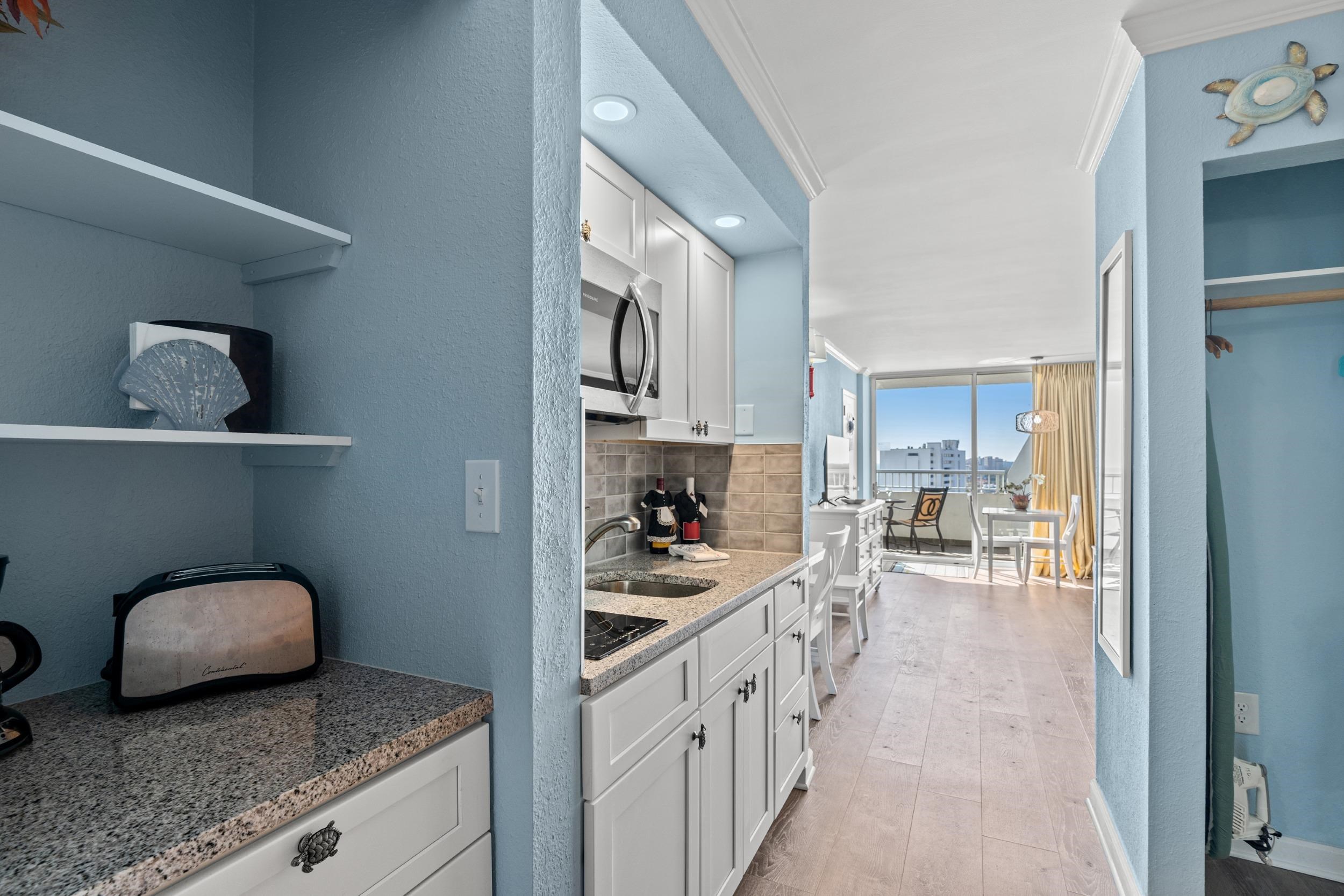 This one that has it all! Top floor penthouse unit with outstanding deep views of the beach and coastline. One of the most beautiful units in Sands Ocean Club. Note, the adjoining unit is also for sale. The condo has an oversized balcony which looks down at the famous Ocean Annies Beach Bar where you can sit out on the balcony and list to the music or enjoy watching the activities. Combine that with a unit that has done a total renovation in 2024 and has achieved 100% 5-star reviews on booking sites. The unit is stunning with premium furnishings and features a very desirable king-sized bed, queen sleeper sofa, a work desk, eating table, flat-screen TV, and tile flooring throughout. The kitchenette has been remodeled with new appliances, full sized refrigerator, and granite countertops. The bathroom has a new tiled walk-in shower, vanity, and toilet. Beautiful paint, and the ceiling redone to remove the popcorn! Resort amenities include outdoor and indoor pools, indoor whirlpool, fitness center, laundry facility, restaurant, gift shop, grocery store, an indoor lounge bar, and more! The resort is located very centrally to great restaurants, shopping, outdoor and indoor activities, and of course numerous golf courses. A wonderful unit to use yourself or as an investment with solid rental income numbers! Note that the adjoining unit, with interconnecting door, is also available for sale. Buying both expands rental opportunities as you can rent both separately as efficiency units, or rent them combined as a two-bedroom unit for better rental returns. Discount provided to any buyer who purchases both units together. Owners self manage and will be glad to provide our advice on rental opportunities and leads for maximizing the rental income.