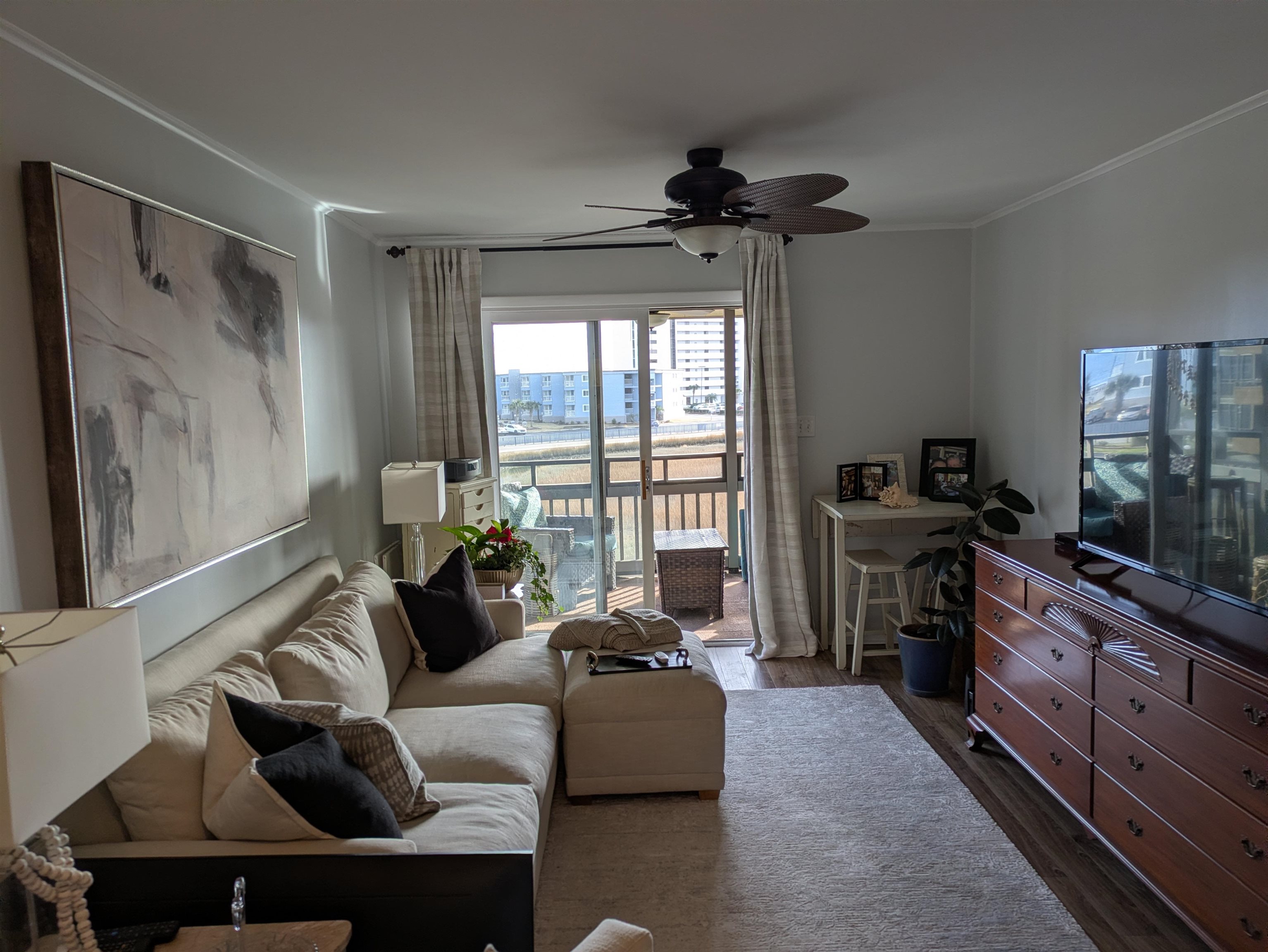 Top floor condo with dramatic view or ocean and swash, quiet and secure! Both screened porches face West for stunning sunsets! Walk across the street to the beach. See photos! Features include smooth ceilings with upgraded fans, central air (only found on 3rd floor units), private porches from living room and master bedroom, Kitchen with window and bar top, master tiled shower, tiled floors in baths, large living area fits a 92"" sofa, TV on porch and stacked washer and dryer! Outdoor storage closet for your beach chairs and fishing poles. Abundant parking, great pool and picnic decks!