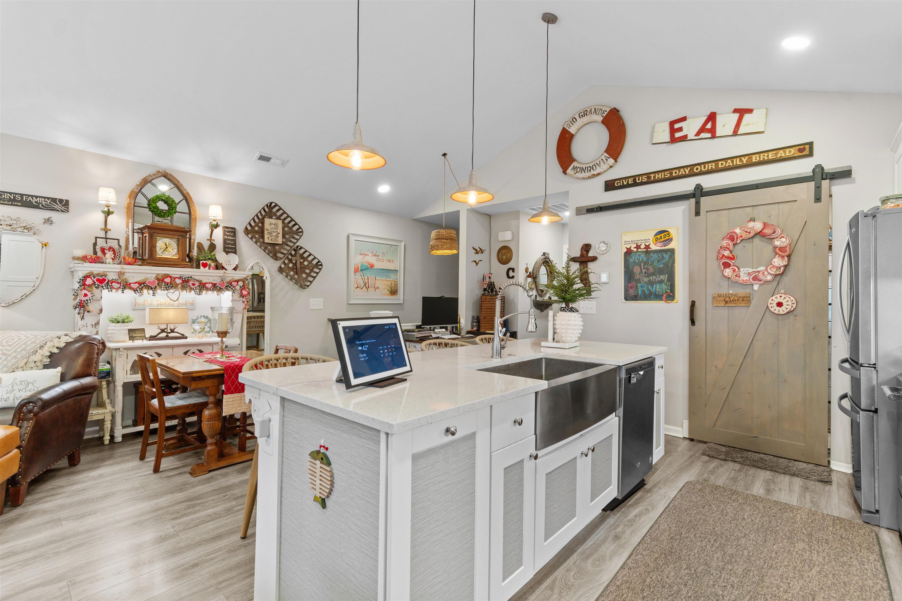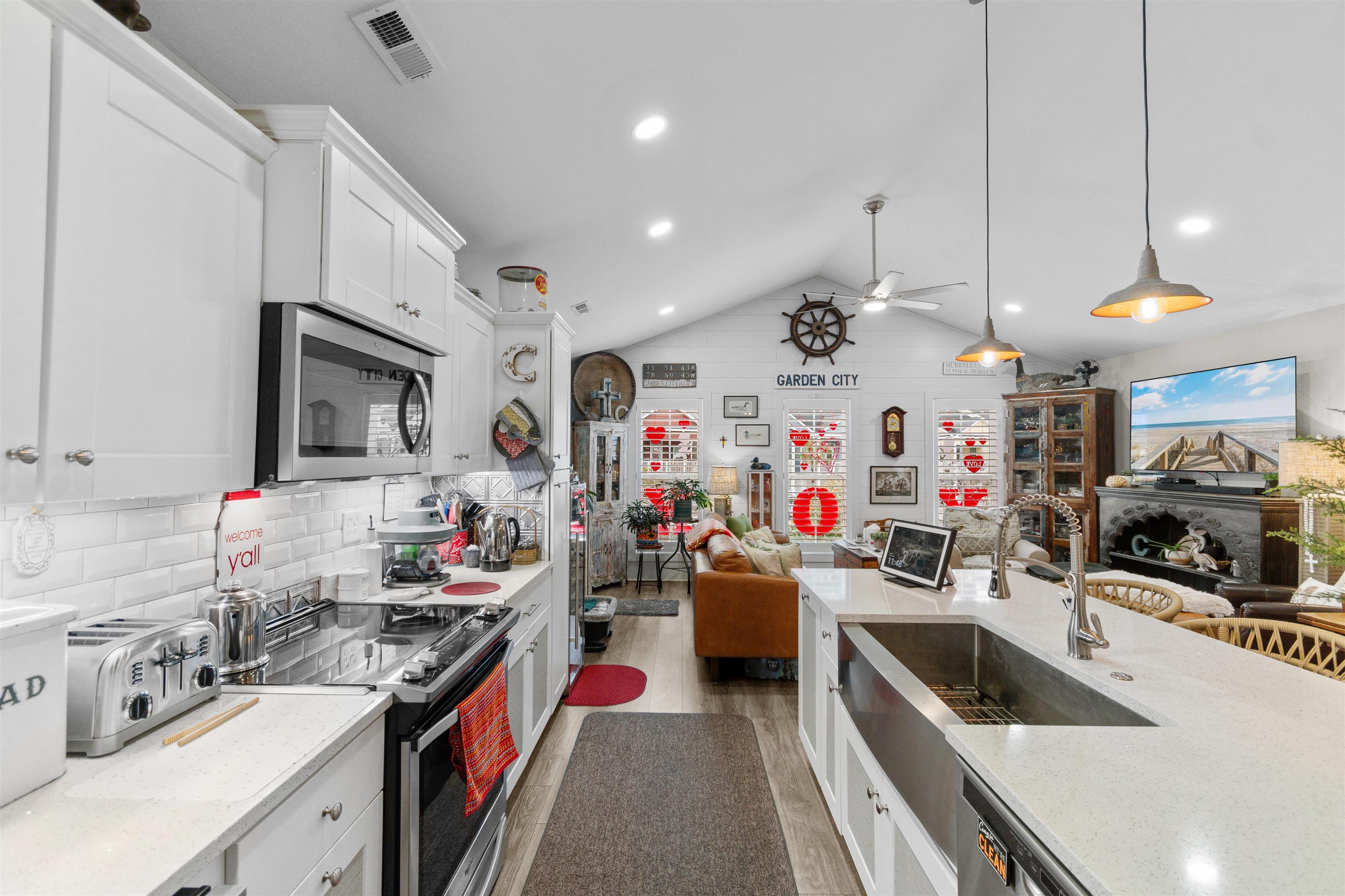 Built in 2020, this well-maintained raised beach home offers 3 bedrooms and 2.5 bathrooms in a prime Murrells Inlet location, just a golf cart ride to the beach and one mile from the Garden City Pier. The first floor includes two bedrooms and a full bathroom, while the upper level features the primary suite with en suite bath, along with the main living areas, dining space, and a convenient half bath. The living space is bright and welcoming, highlighted by vaulted ceilings in the great room, kitchen, and primary bedroom. The open layout features laminate flooring throughout the main living areas with tile flooring in wet areas. The kitchen includes white cabinetry, quartz countertops, a subway tile backsplash, a farmhouse sink, stainless steel appliances, a built-in ice maker, and a large center island. Shiplap accents throughout the home, plantation shutters on the second level, and a barn door to the walk-in laundry room add warmth and coastal character. Enjoy outdoor living on the private backyard Trex deck, with access from the side door or side pathway. Parking under the home provides flexible space, with additional off-street parking beside and in front of the home. Community amenities include a pool, and the HOA includes exterior insurance. Located in desirable Murrells Inlet, close to beaches, dining, and coastal attractions, this move-in-ready home offers a well-balanced blend of comfort, style, and coastal lifestyle.
