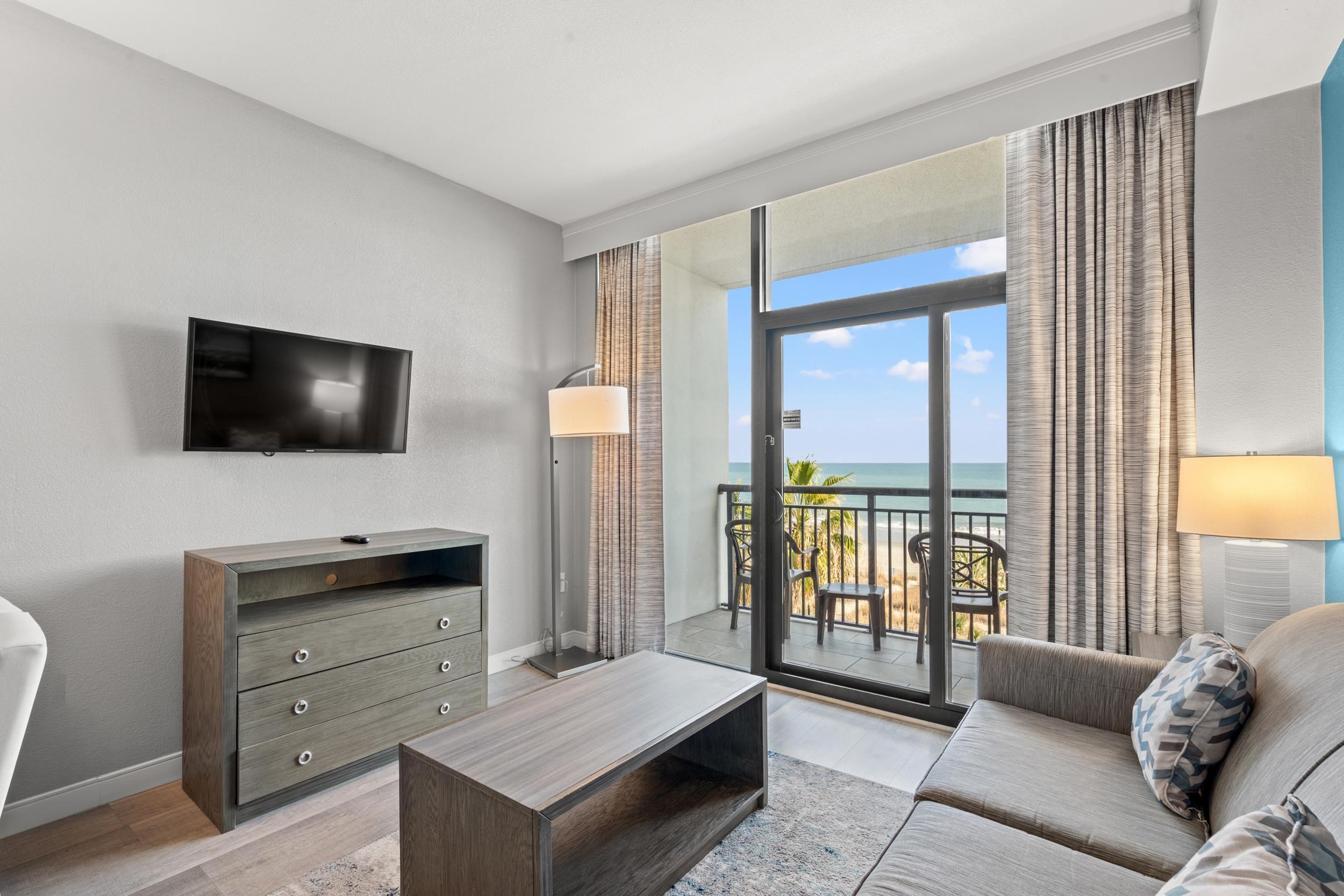 Step into a beautifully custom-designed 1-bedroom oceanfront condo at the award-winning Breakers Resort, voted one of Myrtle Beach's top destinations two years in a row. Thoughtful upgrades throughout include new luxury vinyl plank flooring, fresh paint, modern lighting, a new stove, and ungraded furnishings, creating a clean, contemporary coastal feel. The private oceanfront balcony offers a front-row seat to breathtaking sunrises and soothing ocean sounds-your daily escape just steps from the sand. Inside, enjoy a fully equipped kitchen and full bath, ideal for extended stays or short-term rentals, along with a spacious living area designed for both relaxation and entertaining. The unit comfortably sleeps up to six guests, making it a proven high-demand rental when you're not enjoying it yourself. The amenities include indoor and outdoor water features including an indoor lazy river, hot tubs, indoor and outdoor swimming pools, an indoor water park, a giant pirate ship with outdoor slides, an ocean front pool deck and fitness center. This is the perfect condo for a vacation home, second home or a vacation rental. The Breakers Resort is conveniently located close to shopping, restaurants and Broadway at The Beach. Don't miss out on this one - schedule your showing today!