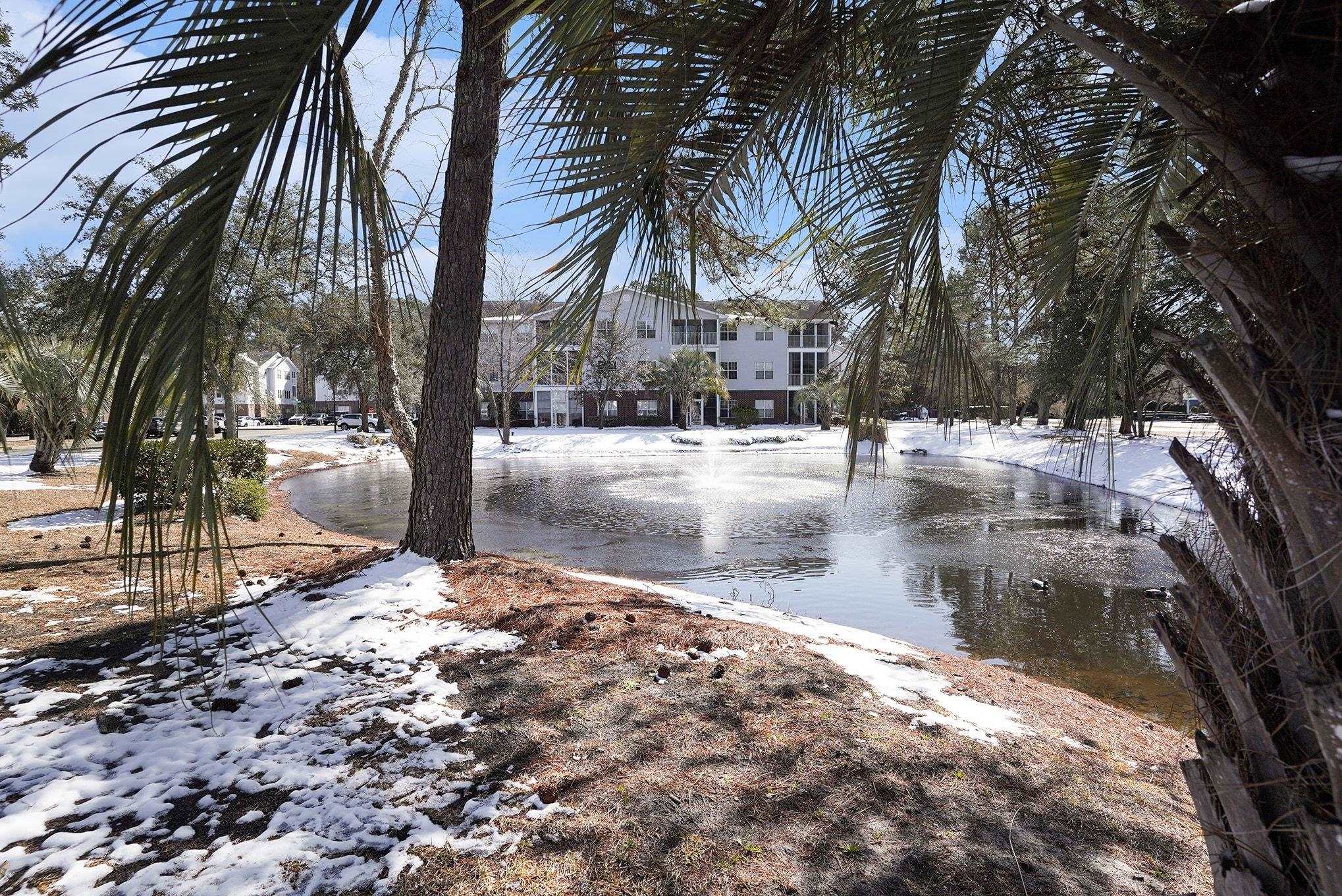 This top-floor end unit condominium offers elevator access and features two bedrooms and two bathrooms. The bright and airy residence includes vaulted ceilings and hardwood flooring throughout. The kitchen is finished with tile flooring, granite countertops, abundant cabinetry, a glass mosaic tile backsplash, and stainless steel appliances. A laundry area is conveniently located off the kitchen. A sliding door fully retracts into the wall, opening the living room to the balcony and creating a seamless indoor-outdoor living space. The large screened-in porch overlooks a quiet wooded area. The primary bedroom features vaulted ceilings and an ensuite bathroom with a double vanity and a fiberglass shower with a glass enclosure. Bay Meadows is ideally located just minutes from Myrtle Beach beaches, golf courses, shopping, and dining. The community is also conveniently close to Coastal Carolina University, Conway Medical Center, restaurants, shopping, and entertainment, making this property an excellent choice for a primary residence, vacation home, or investment opportunity.