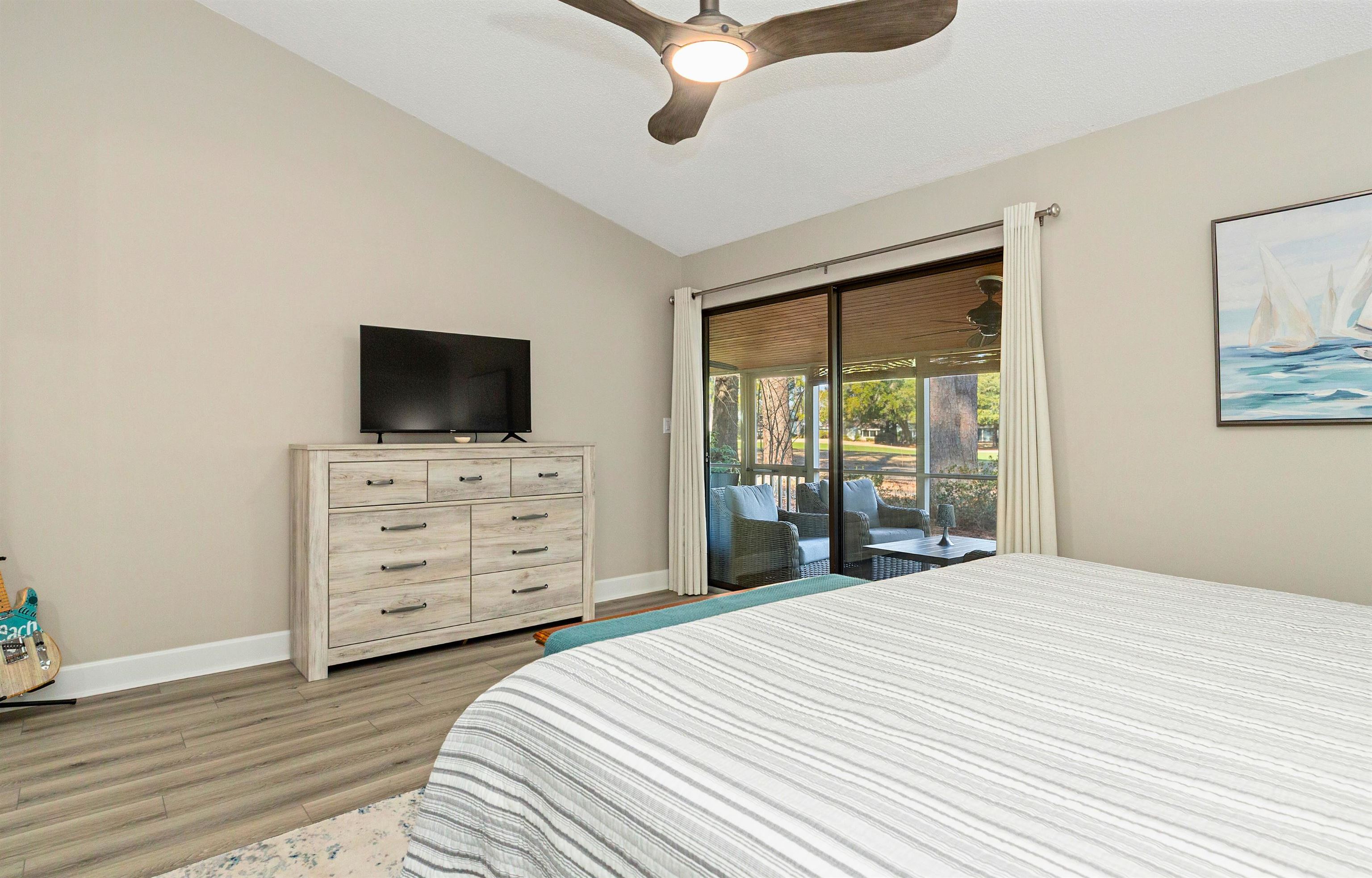 PrimaryBedroom: CeilingFans, LinenCloset, MainLevelPrimary, VaultedCeilings, WalkInClosets