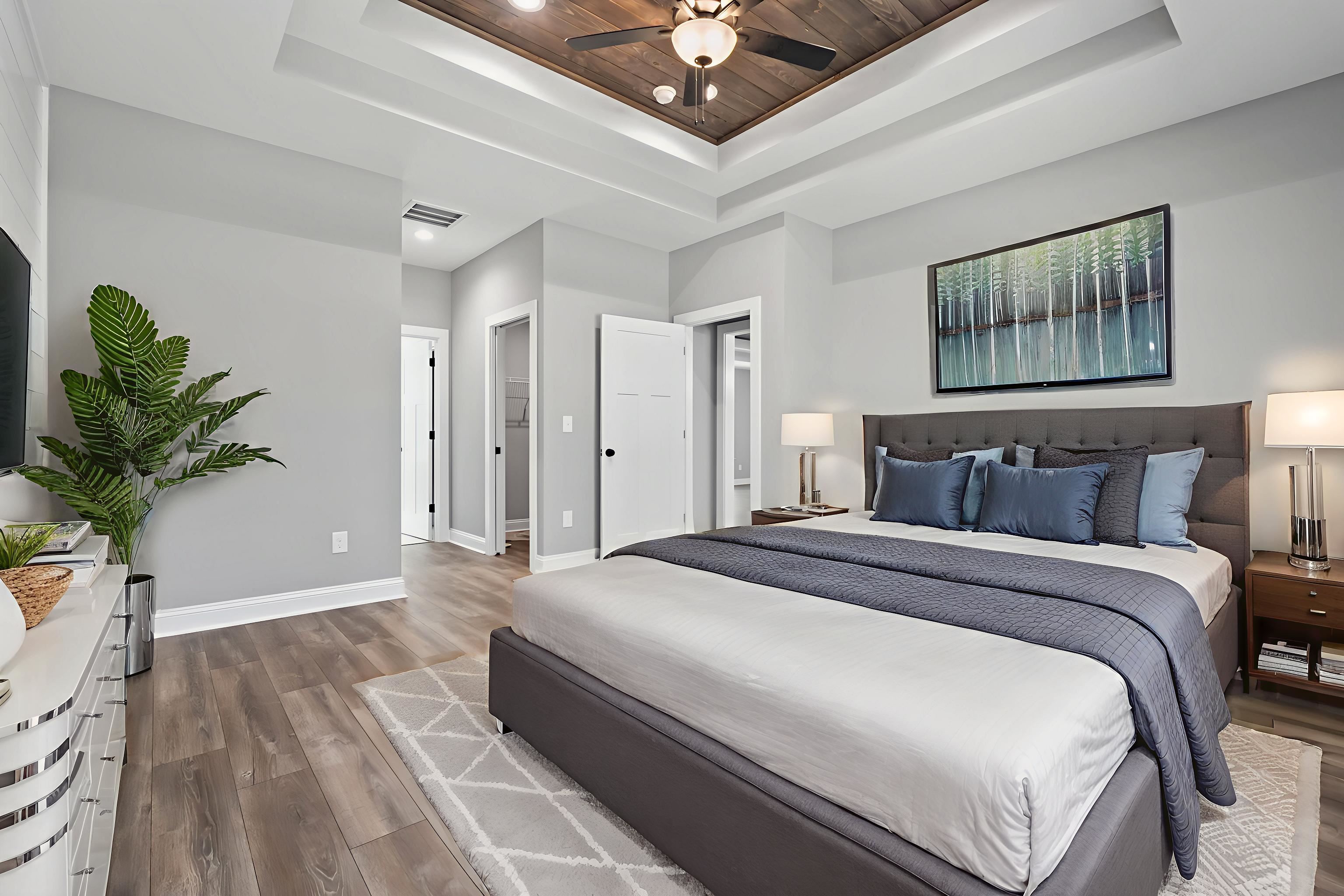 PrimaryBedroom: BeamedCeilings, TrayCeilings, CeilingFans, MainLevelPrimary, WalkInClosets