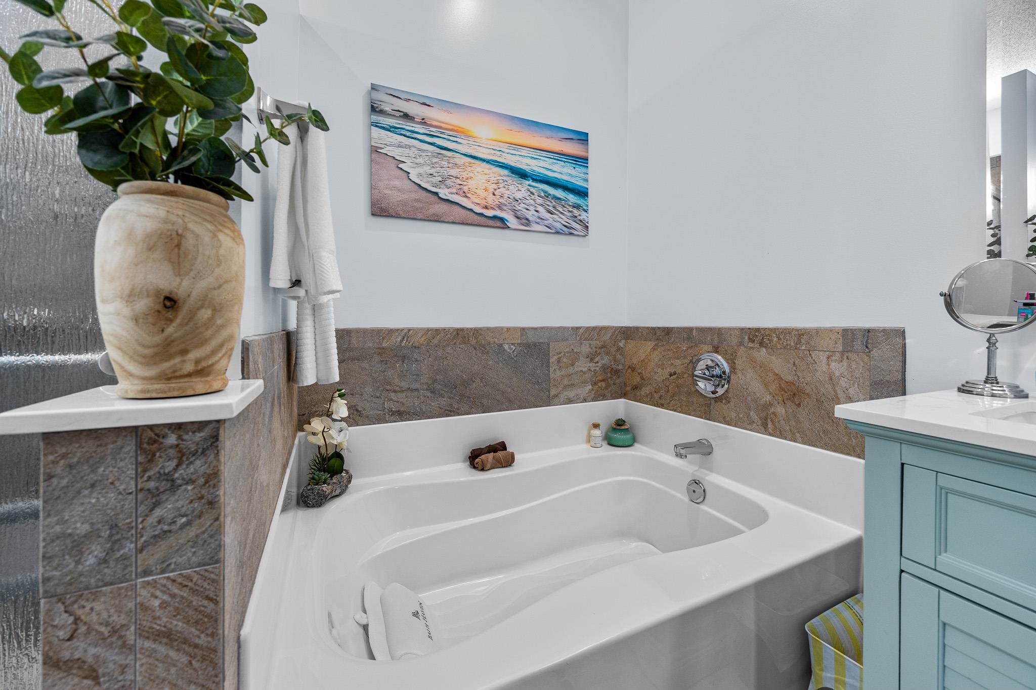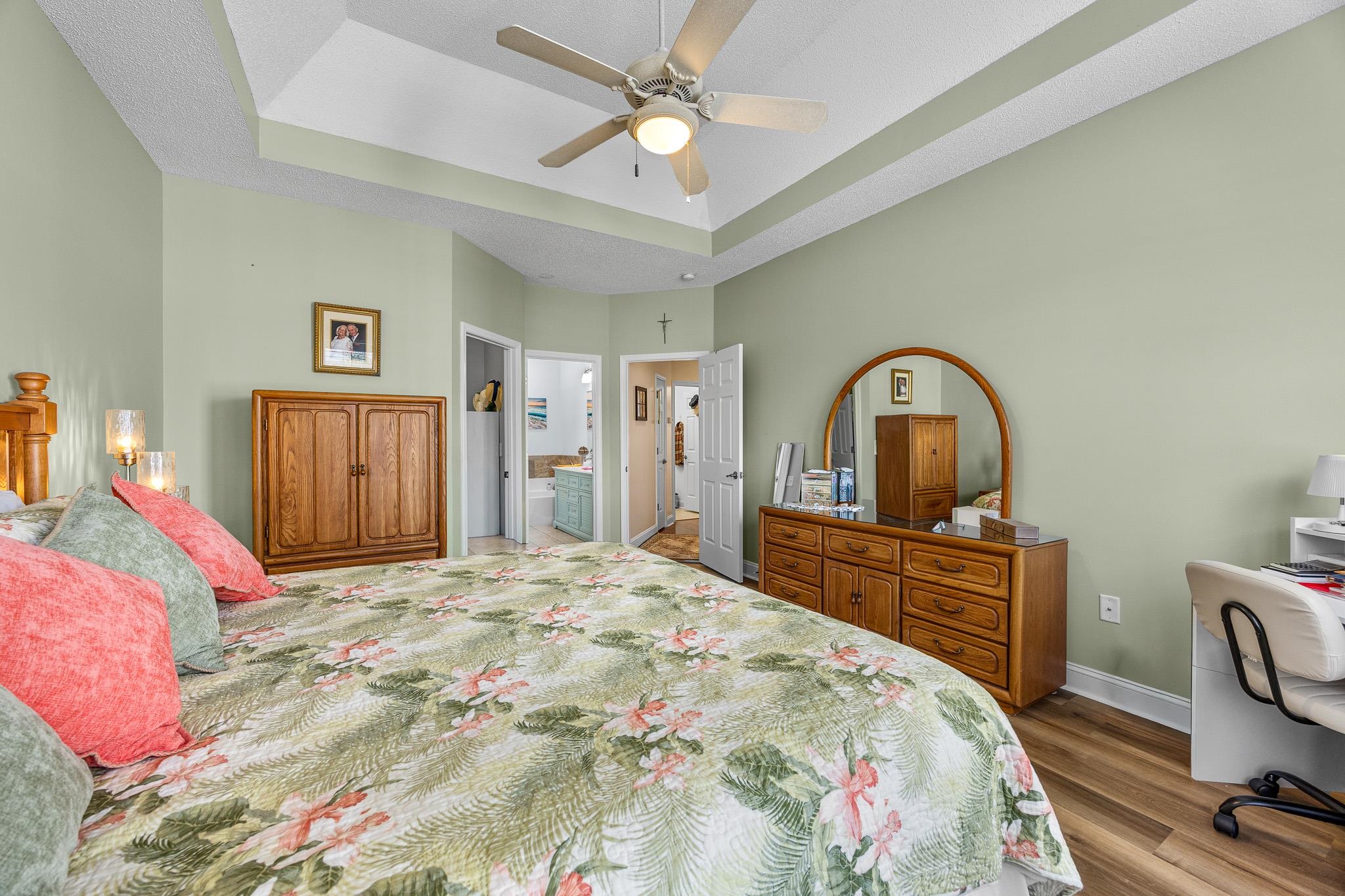 Interior Features: Attic, TrayCeilings, CeilingFans, DualSinks, GardenTubRomanTub, MainLevelPrimary, PullDownAtticStairs, PermanentAtticStairs, SplitBedrooms, SeparateShower, Vanity, WalkInClosets, WindowTreatments, BreakfastBar, BedroomOnMainLevel, BreakfastArea, EntranceFoyer, SolidSurfaceCounters