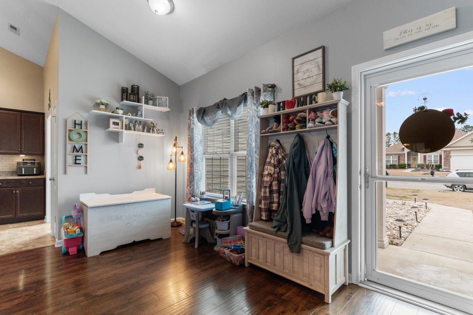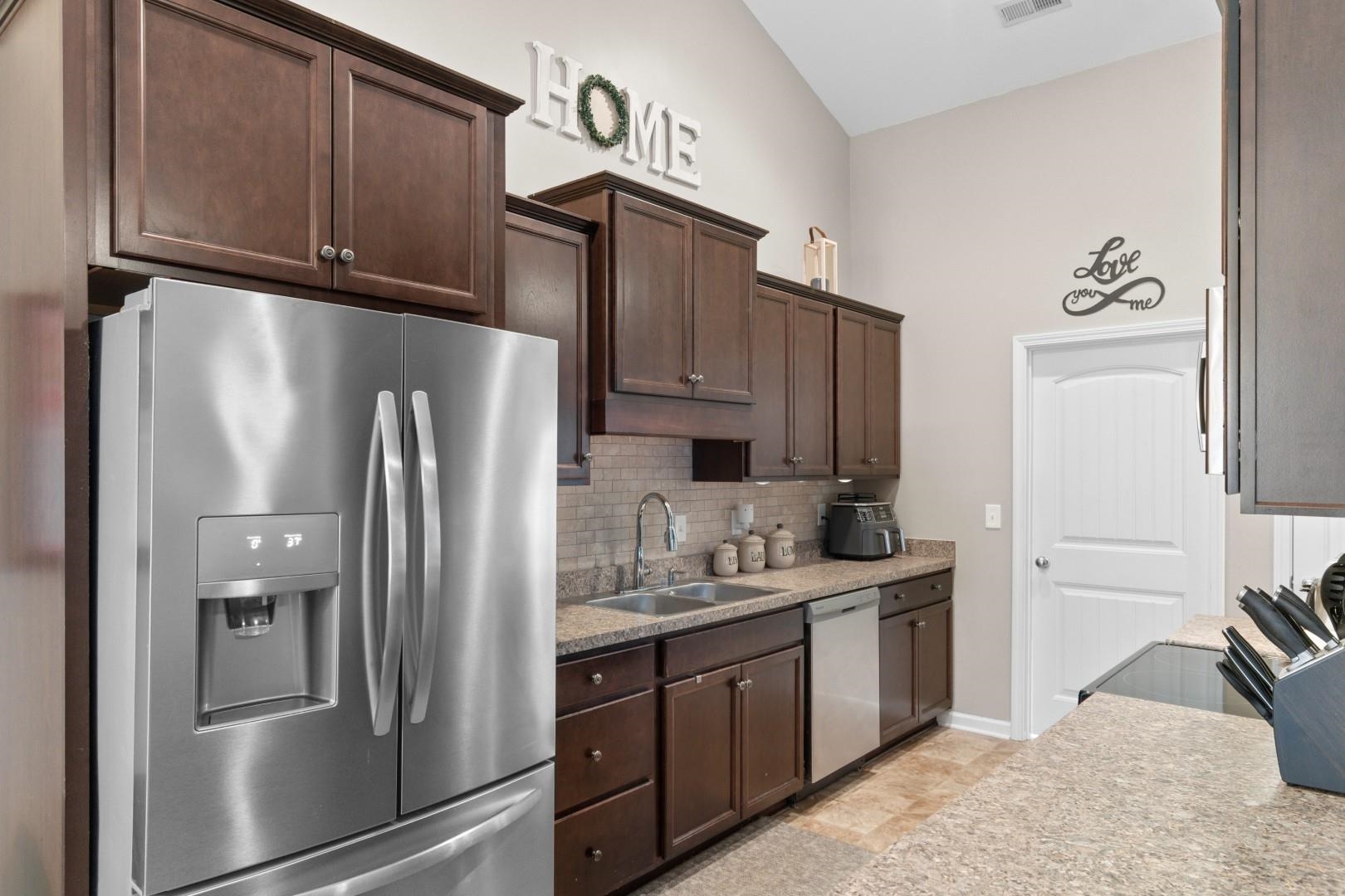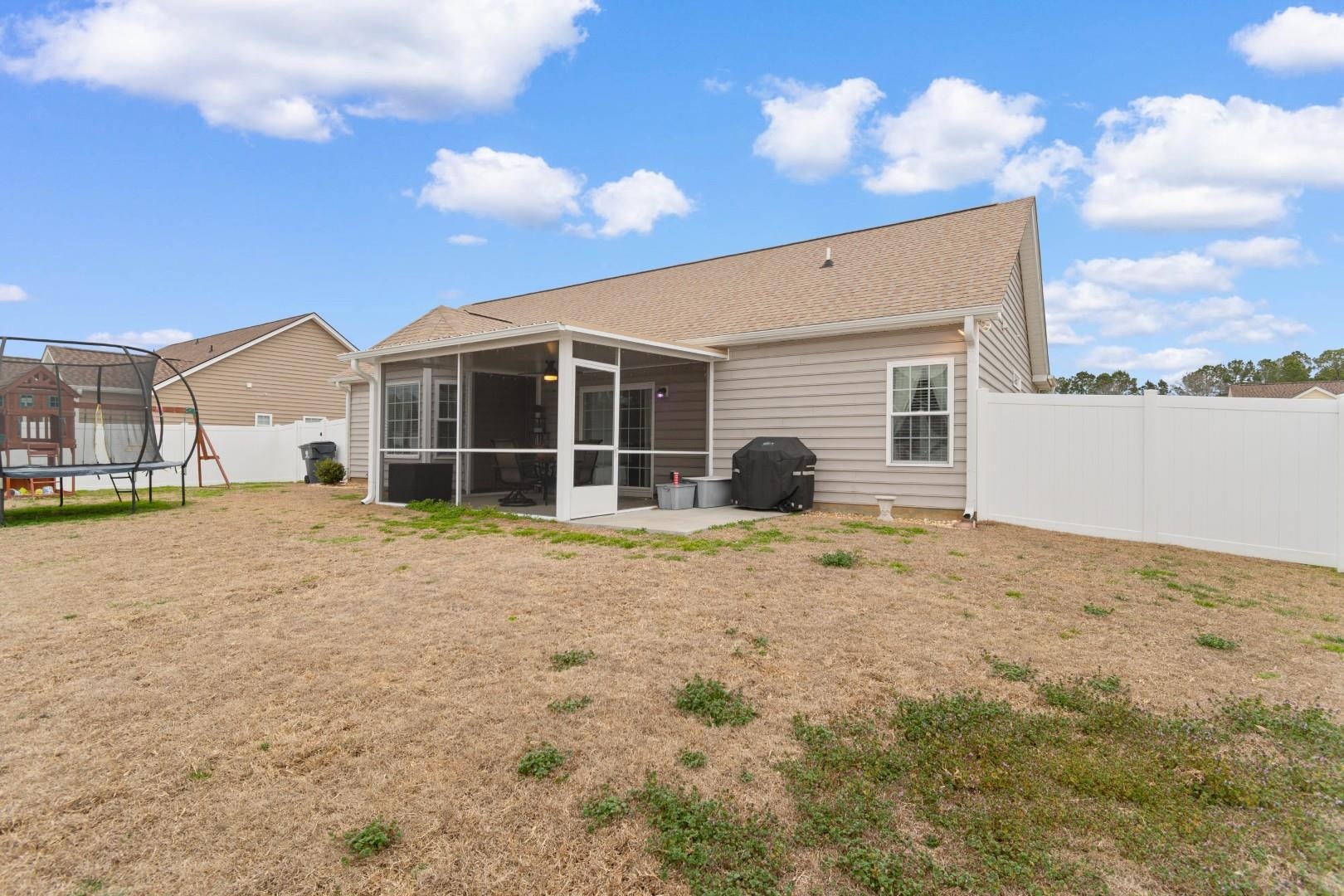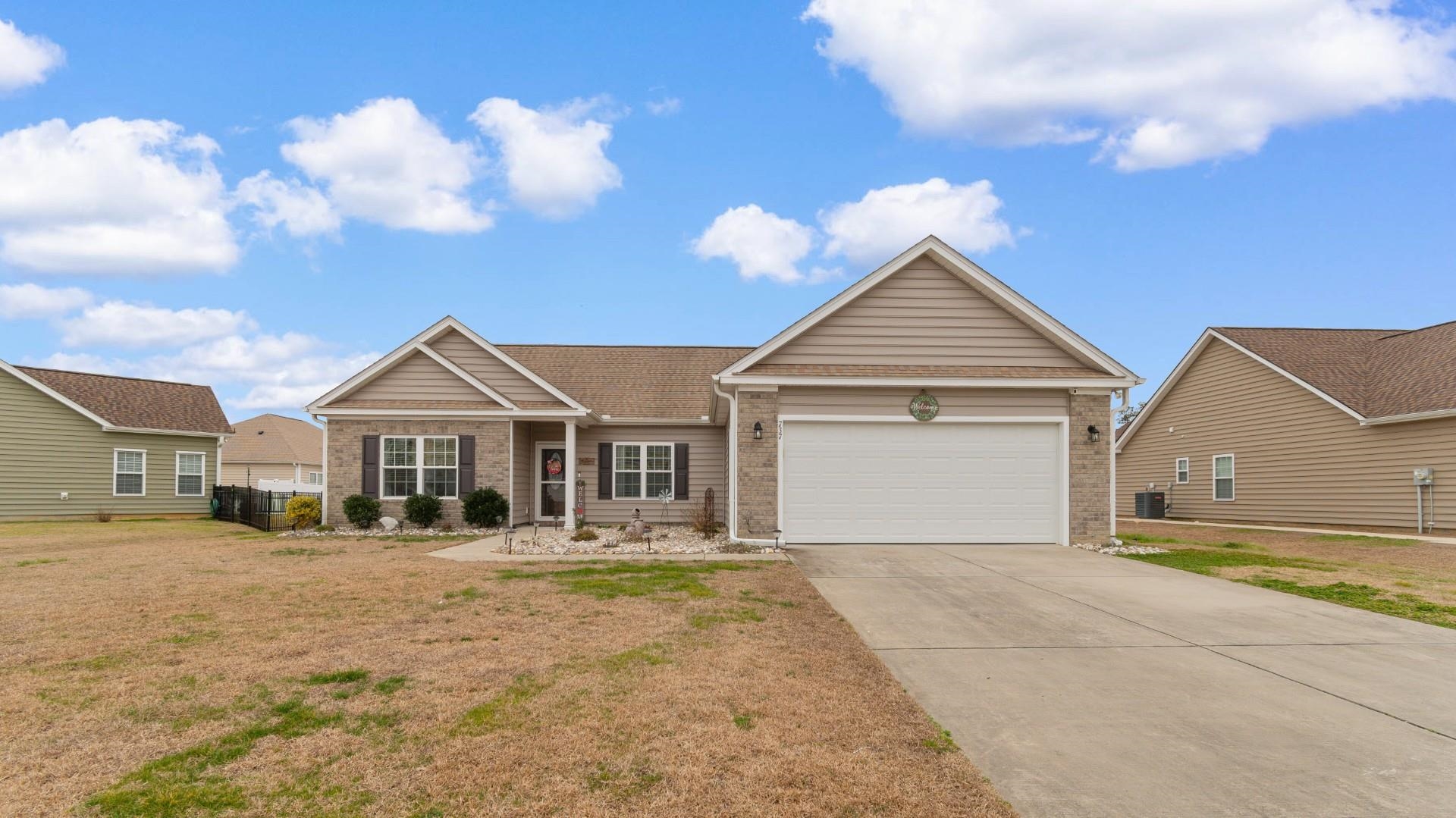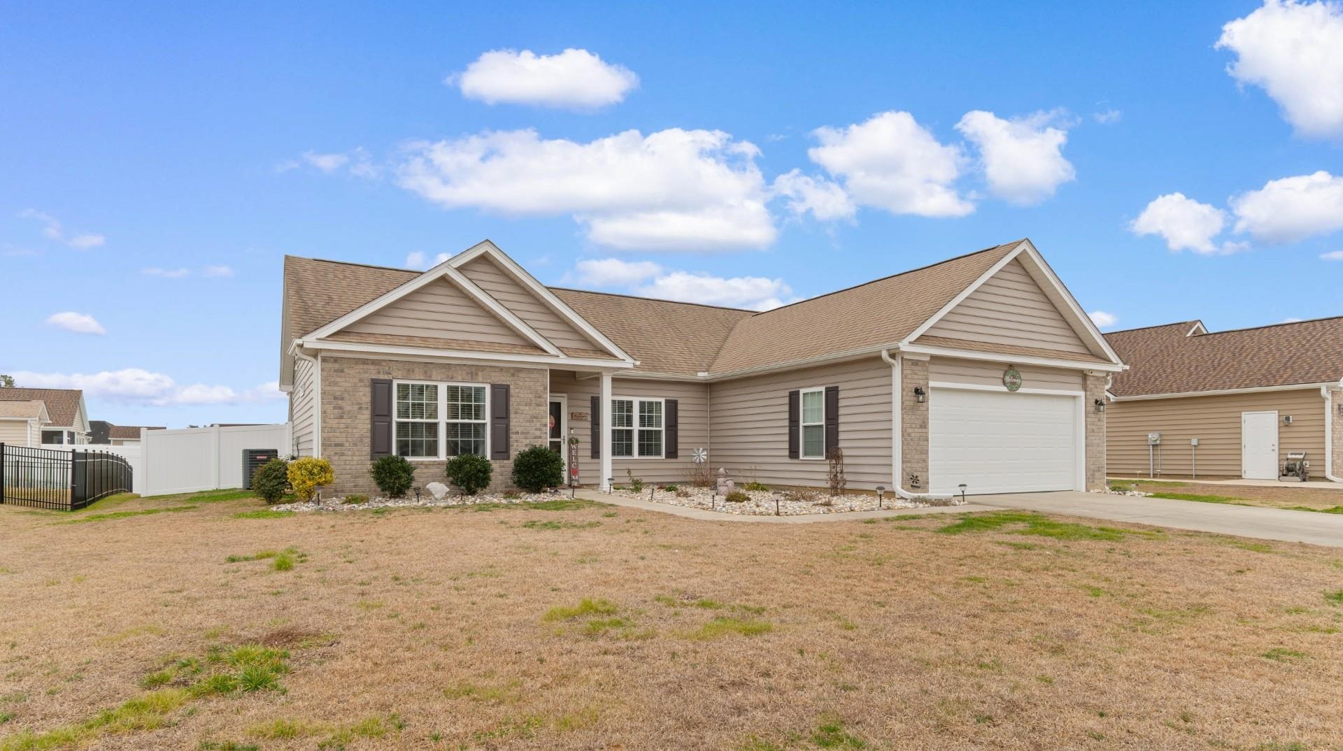 Charming 3-bedroom, 2-bath home with a desirable split floor plan and 2-car garage. Cathedral ceilings highlight the open main living area, paired with stylish LVP flooring in the main living area. The kitchen features stainless steel appliances and flows seamlessly into the living and dining spaces. The private primary suite offers a walk-in shower, while the screened-in patio and fully fenced backyard provide the perfect space to relax or entertain. Brick accents on the front add great curb appeal. Conveniently located just minutes from downtown Conway and only 30 minutes to the beach.