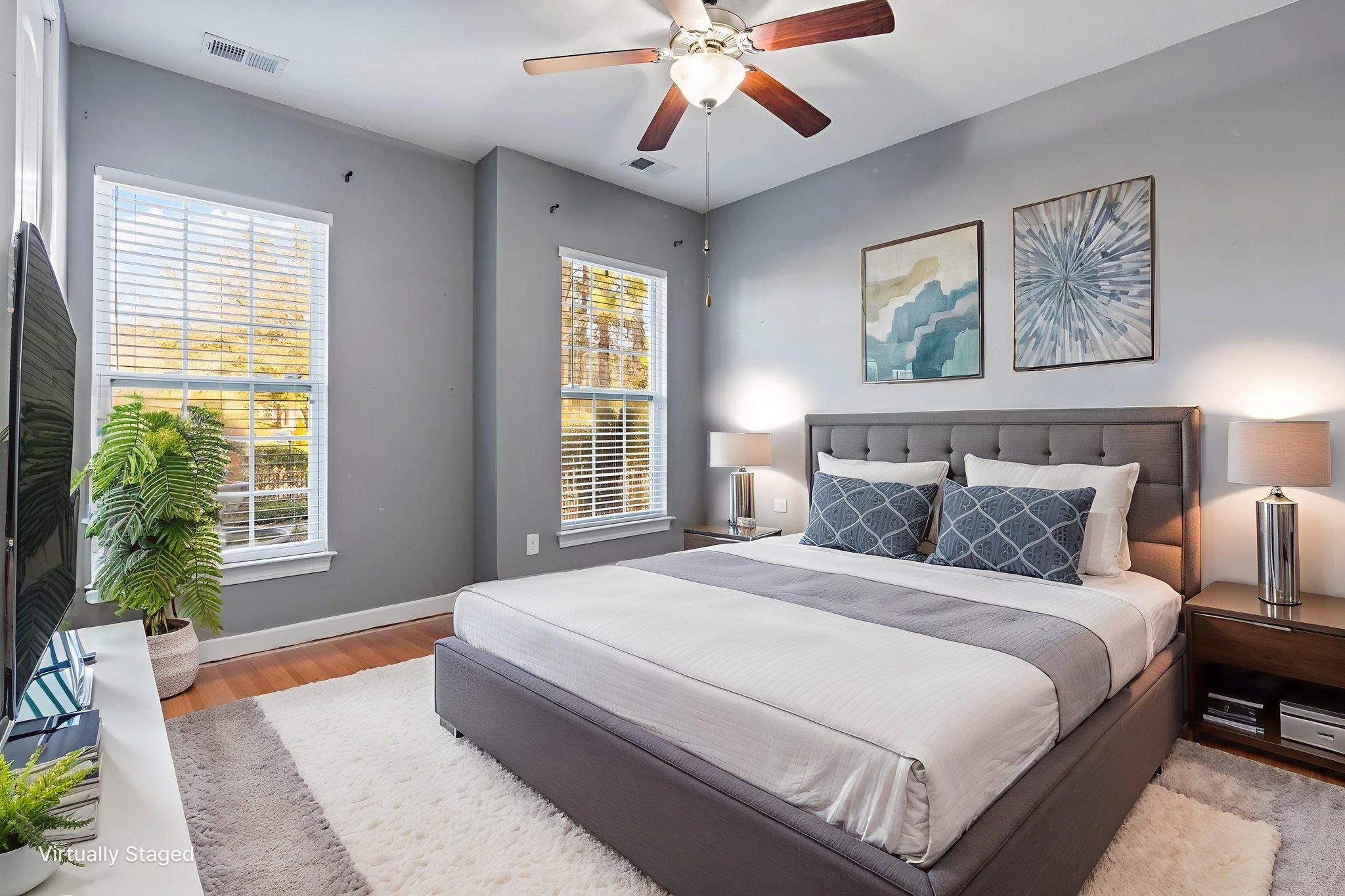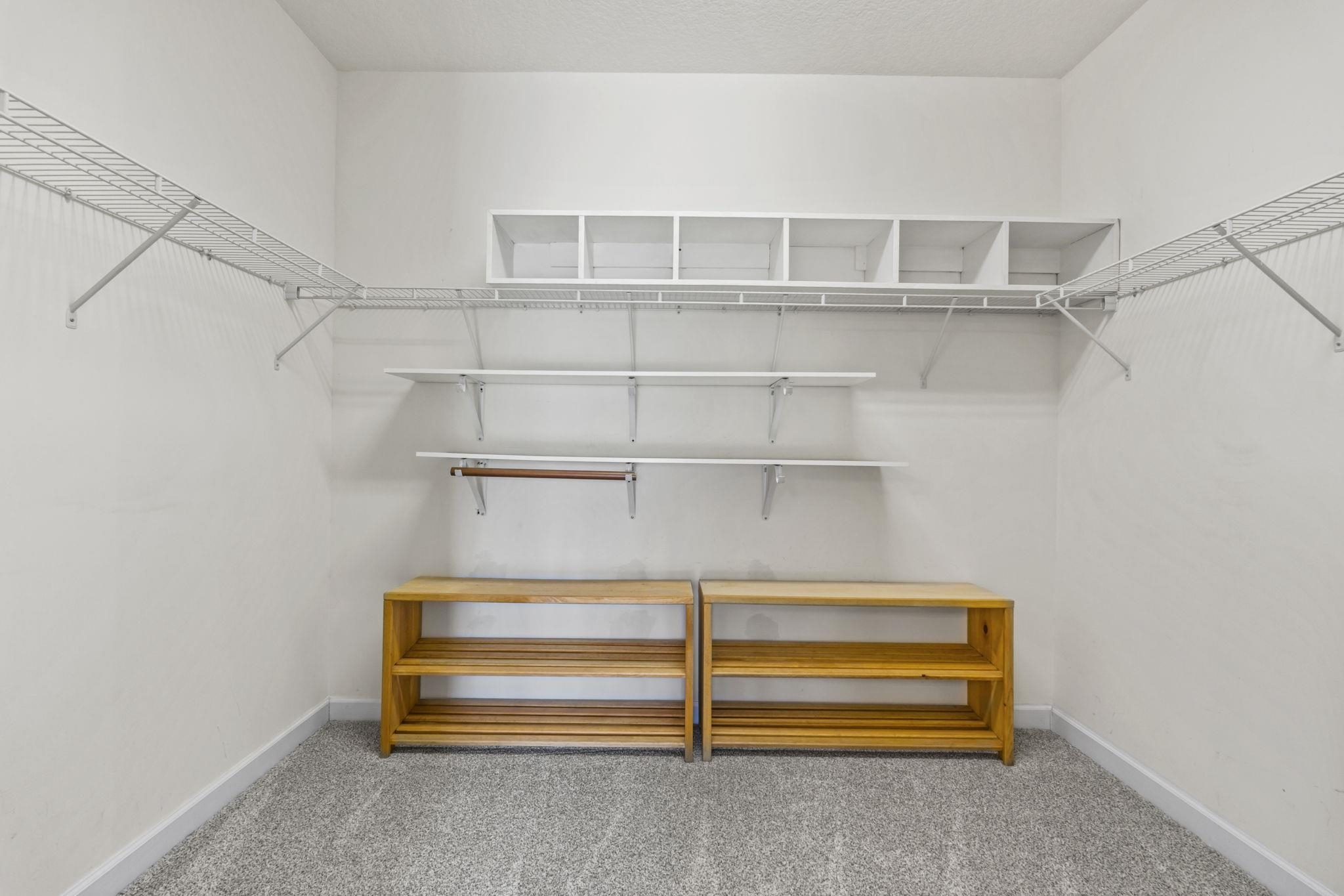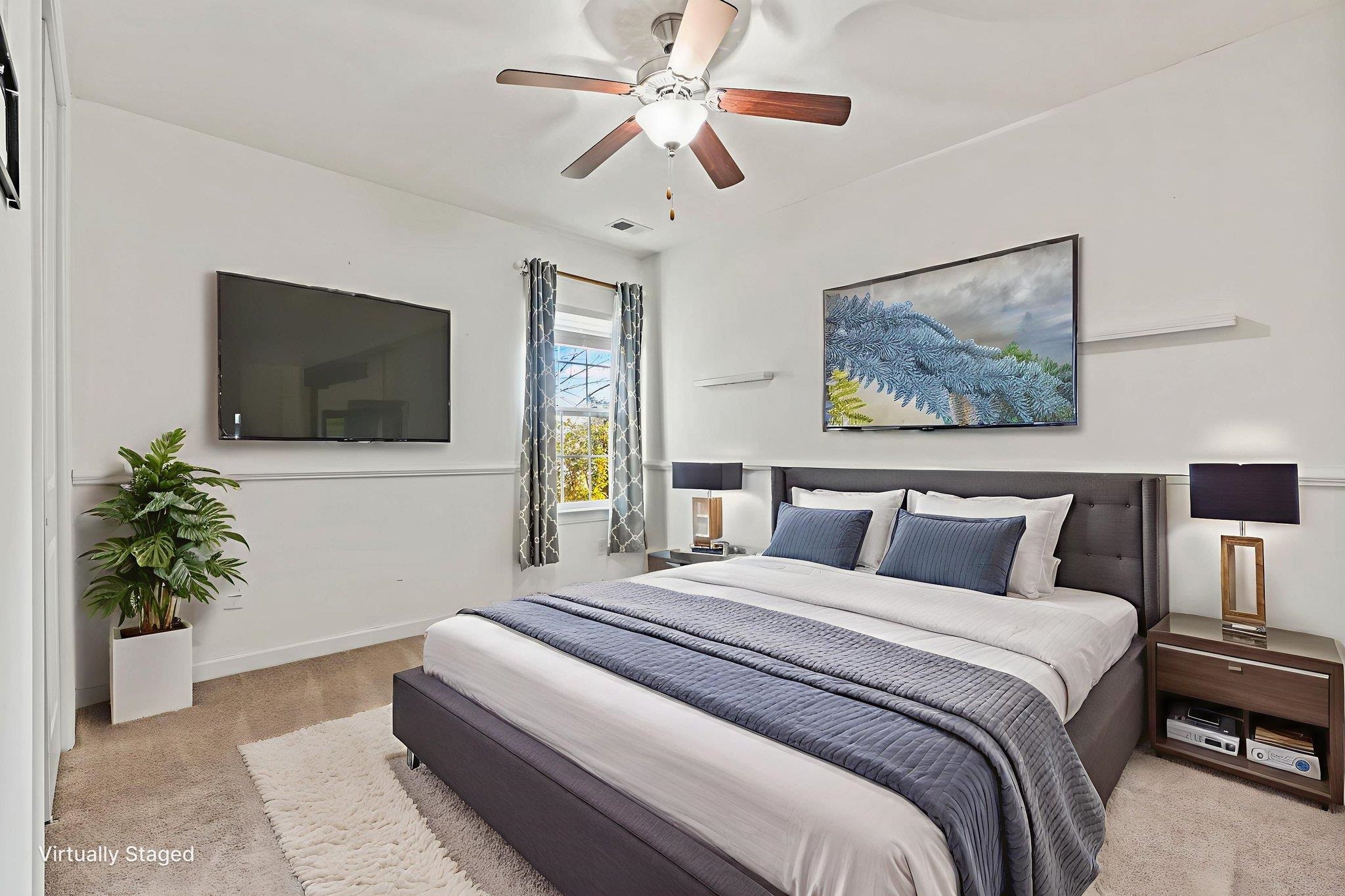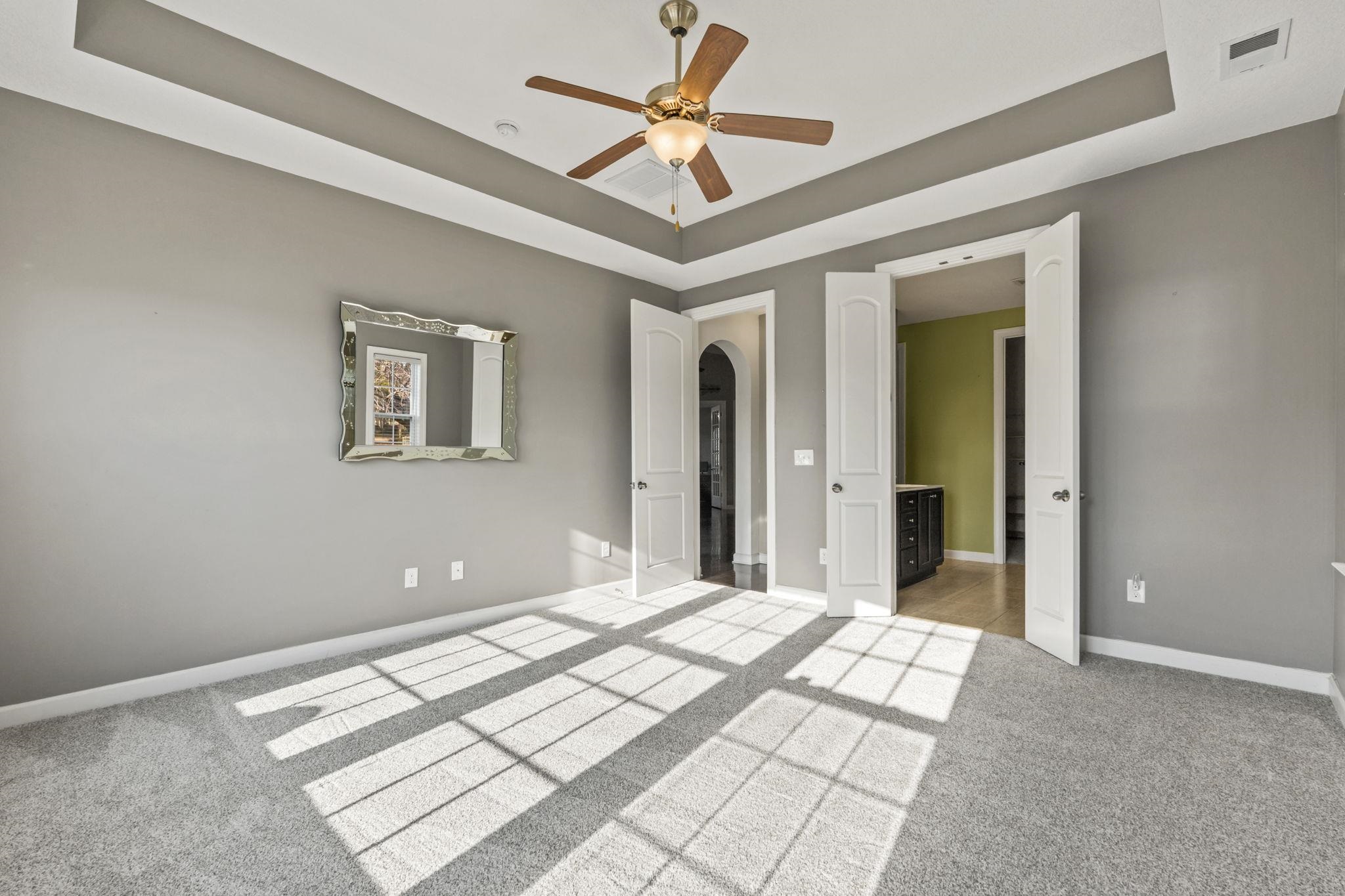 PrimaryBedroom: TrayCeilings, CeilingFans, MainLevelPrimary, WalkInClosets