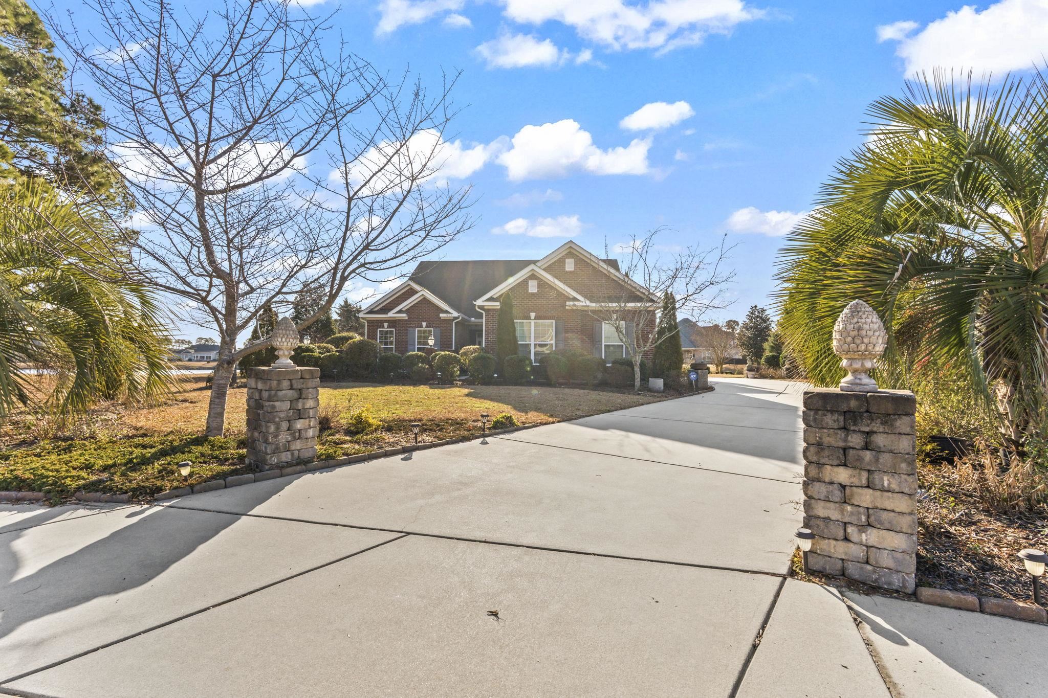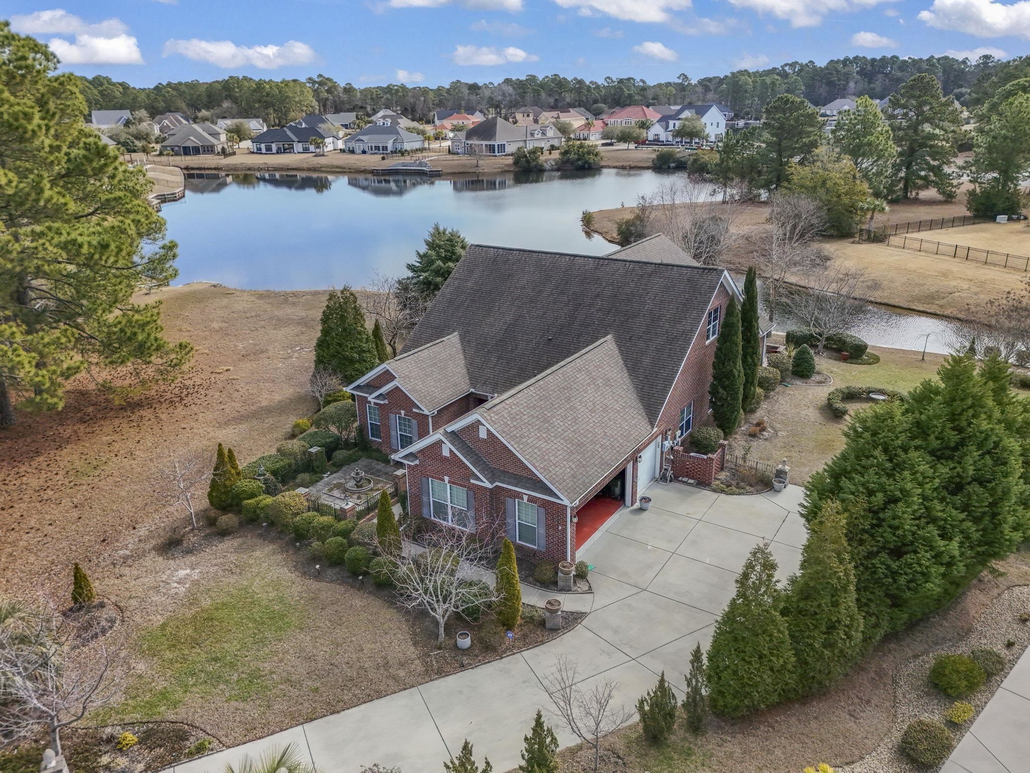 This stunning lakefront home sits perfectly on a peaceful cul-de-sac, offering unmatched privacy, space, and direct water access in Wild Wing Plantation. Enter through the foyer into a thoughtfully designed 3BR/2BA all-brick custom home on over a half-acre with its own private boat slipan exceptional feature for true lakefront living. A courtyard with a soothing fountain welcomes you at the front entry, offering the perfect space for gardeners to create their dream haven. Inside, youll find hardwood floors, vaulted ceilings, a formal dining room, and a home office with French doors. Enjoy lake views from nearly every room, an open floor plan, stainless steel appliances, granite countertops, and a spacious kitchen. The freshly carpeted primary suite includes a walk-in closet, double sinks, and a tiled walk-in shower. A bright Carolina sunroom and a screened porch provide multiple spaces to relax and take in the water views. With a private boat slip, a lake that allows motorized boats, and community amenities including a gated boat ramp and a secured storage area for boats, RVs, and campers, this property offers exceptional convenience for boating and waterfront recreation. An oversized 3-car garage and expansive driveway provide excellent parking and storage. The low-HOA, golf-course community features three pools, tennis, a fitness center, basketball, and miles of scenic lakes to explore. Note: some photos have been virtually staged