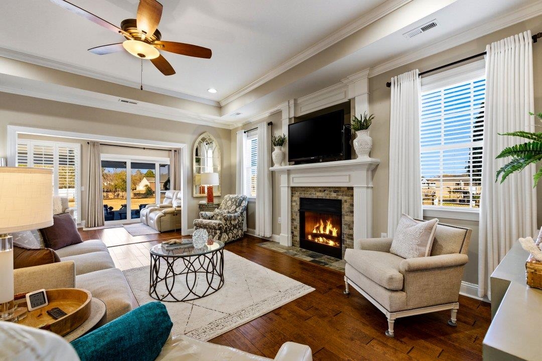 Absolutely beautiful home and shows like a model home. The open floor plan includes the family room, dining, and kitchen; all with beautiful hardwood flooring. The Carolina room looks out onto the screened porch and the large fenced in backyard. There is a wrap around patio with accent lighting, Hardy Board exterior, new roof in 2022, tray ceilings in the family room and the master bedroom. There is accent lighting that is gorgeous at night. There is a designated office with cabinets and desk space. If you need more storage, there is a detached storage building in the rear. The garage has a resurfaced floor, overhead storage racks, heated and cooled storage room, and an extra refrigerator. More for you to see when you come take a look.
