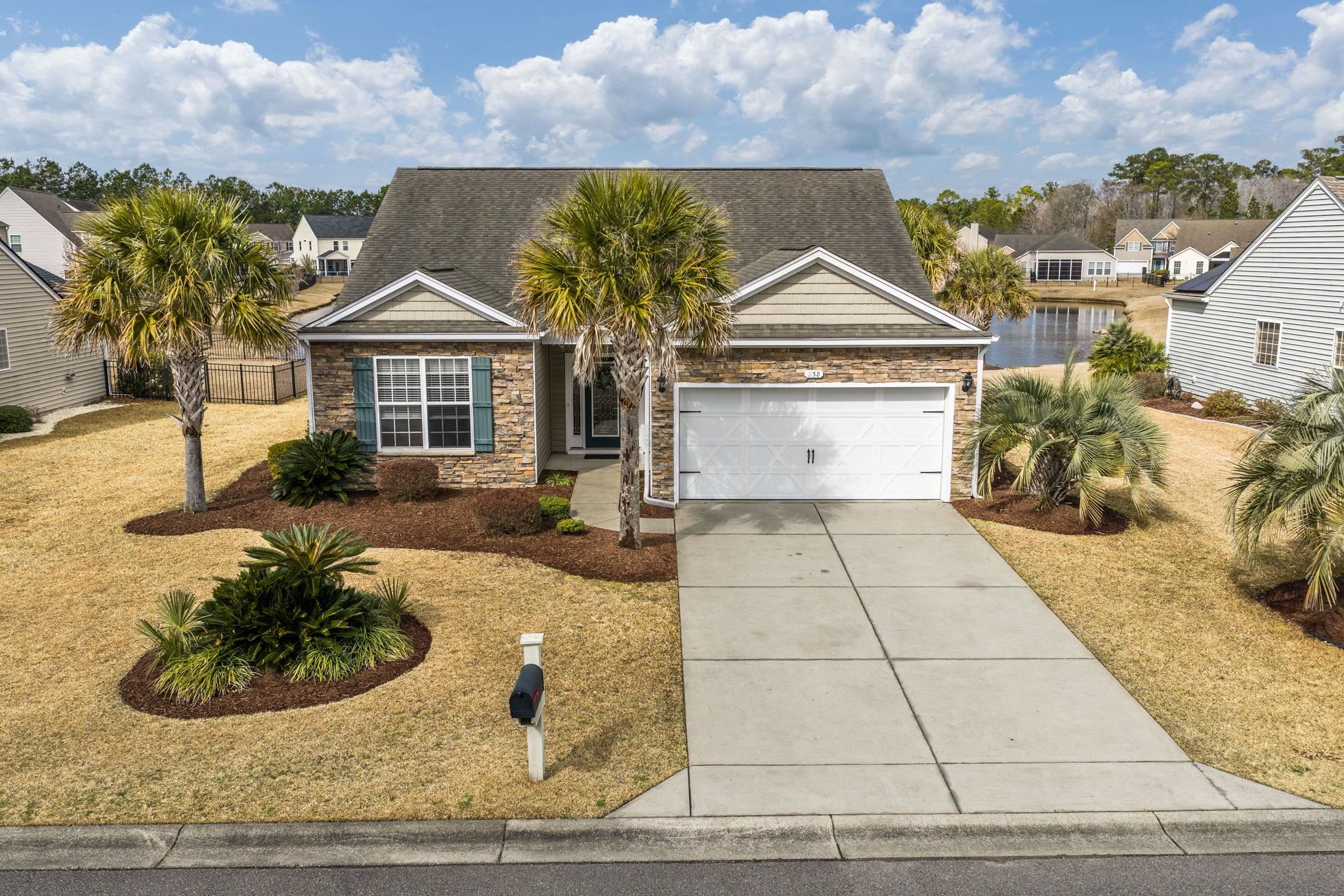 OPEN HOUSE SUNDAY - 12pm - 2pm! Check out this beautiful home located in the Woodbury community. A single level with NO STAIRS that sits on the pond with a gorgeous water view. It is a must see. The home includes 3 bedrooms and 2 bathrooms is on a quiet community - you will love this home. As you pull into the drive, you will enjoy the stone accent, manicured landscaping and palmetto trees that give this home a look of coastal sophistication. The foyer of the home leads you into the heart of the home. The spacious living room and its high cathedral ceilings is the perfect gathering spot to entertain whether you are celebrating holidays, watching football games or just enjoying movie night. Just off of the living room is the fully equipped kitchen and dining area with a full view of the pond. The kitchen has matching black appliances, beautiful wood grain cabinets, breakfast bar and pantry. You will love cooking your favorite family recipes or trying new culinary creations from the latest episodes on the Food Network Channel. The dining area includes chair railing and leads you onto your screened in porch - this allows for your gatherings to spill outdoors to enjoy the great weather for most of the year. You can eat indoors or enjoy dining al fresca on the outdoor patio while watching the sunset. The large primary bedroom includes a tray ceiling and walk-in closet with a private ensuite bathroom with double sinks and a walk-in shower for convenience. The Woodbury community includes great swimming pool - just perfect for an afternoon dip after enjoying a day at the beach, shopping, hitting the links or taking a boat ride down the ICW. Do not miss your chance to see this home and begin living your perfect salt-life at the beach.