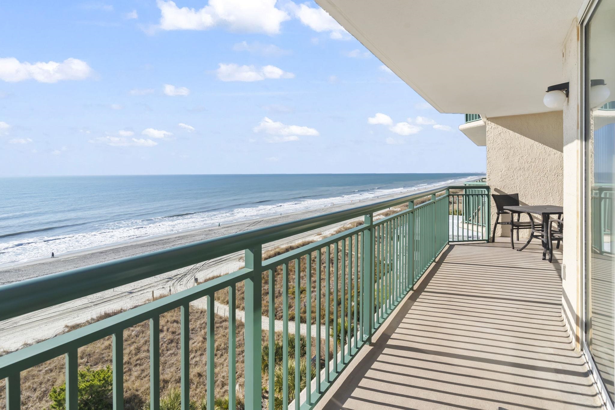 Welcome to your beautifully maintained fully furnished direct oceanfront 3-bedroom, 3-bath condo in the heart of North Myrtle Beach, where sweeping views of the Atlantic greet you the moment you step inside. Used only as a second home, this seventh-floor retreat offers the perfect blend of comfort, style, and coastal living. Enter into a bright, open floor plan enhanced by new LVP flooring throughout and tile in all bathrooms. The spacious kitchen, dining, and living areas flow seamlessly together, ideal for entertaining or simply relaxing while taking in the floor-to-ceiling ocean views. The kitchen is designed for cooks and beach lovers alike, featuring upgraded granite countertops, a new stainless-steel GE dishwasher, GE range, GE Profile microwave with a unique slide-out vent, new flat-panel lighting, and updated brushed-nickel hardware on the laundry and pantry doors. The refrigerator and washer/dryer are included for added convenience. This condo comes fully furnished, including bar stools for the counter-height breakfast bar, a complete dining set, and comfortable living room furniture with a pull-out sofa, flat-panel TV, and sound bar. Step onto the private balcony from the living room, or directly from the oceanfront primary bedroom and enjoy the sound of the waves and the endless horizon. The primary suite features two closets (one perfect as a locked owners closet), a jacuzzi tub, separate shower, double-sink vanity, and updated Moen faucets, hardware, and lighting. The second bedroom offers its own private bath, while the third bedroom includes two full beds. Just outside your front door, youll find a convenient private storage closet for beach chairs and gear. The HVAC was replaced in July 2024, giving you peace of mind for years to come. Resort-style amenities elevate the experience: an oceanfront pool, hot tub, kiddie pool, lazy river, comfortable loungers, fitness room, koi pond, bike rack, and four Green Egg grills for outdoor cooking. Enjoy private direct beach access, each unit has 2 unassigned parking spaces in the parking garage with a covered and climate-controlled walkway to the building. The HOA includes building insurance, internet/cable, water, trash, and pest control. From the lobby, the building offers three elevators. Whether you're searching for a primary residence, a vacation home, or a strong investment property, this condo checks every box. Located close to Barefoot Landing, top-rated restaurants, shopping, golf, and entertainment, its the perfect place to enjoy the best of North Myrtle Beach oceanfront living.