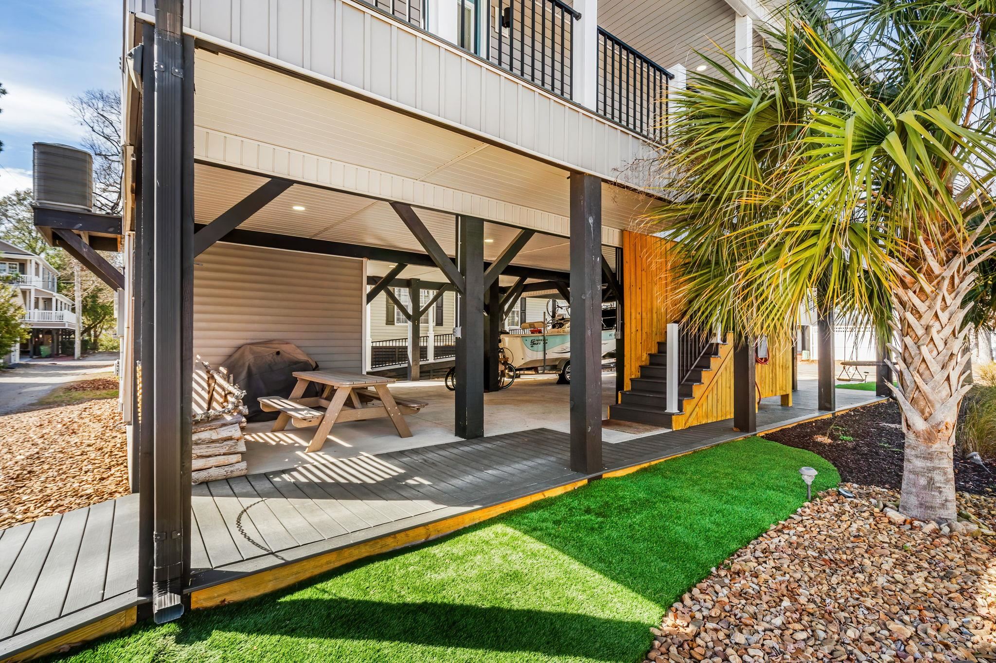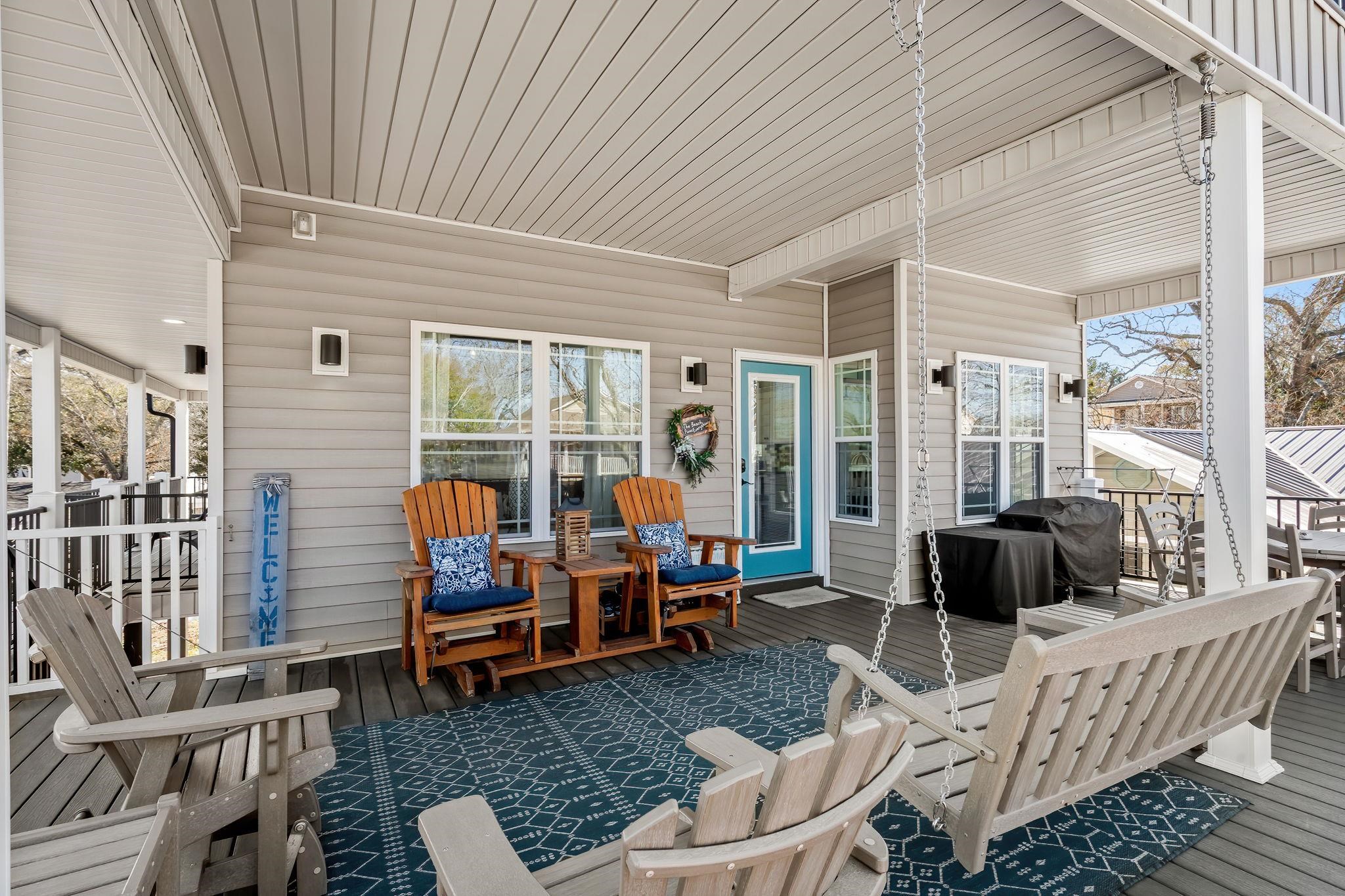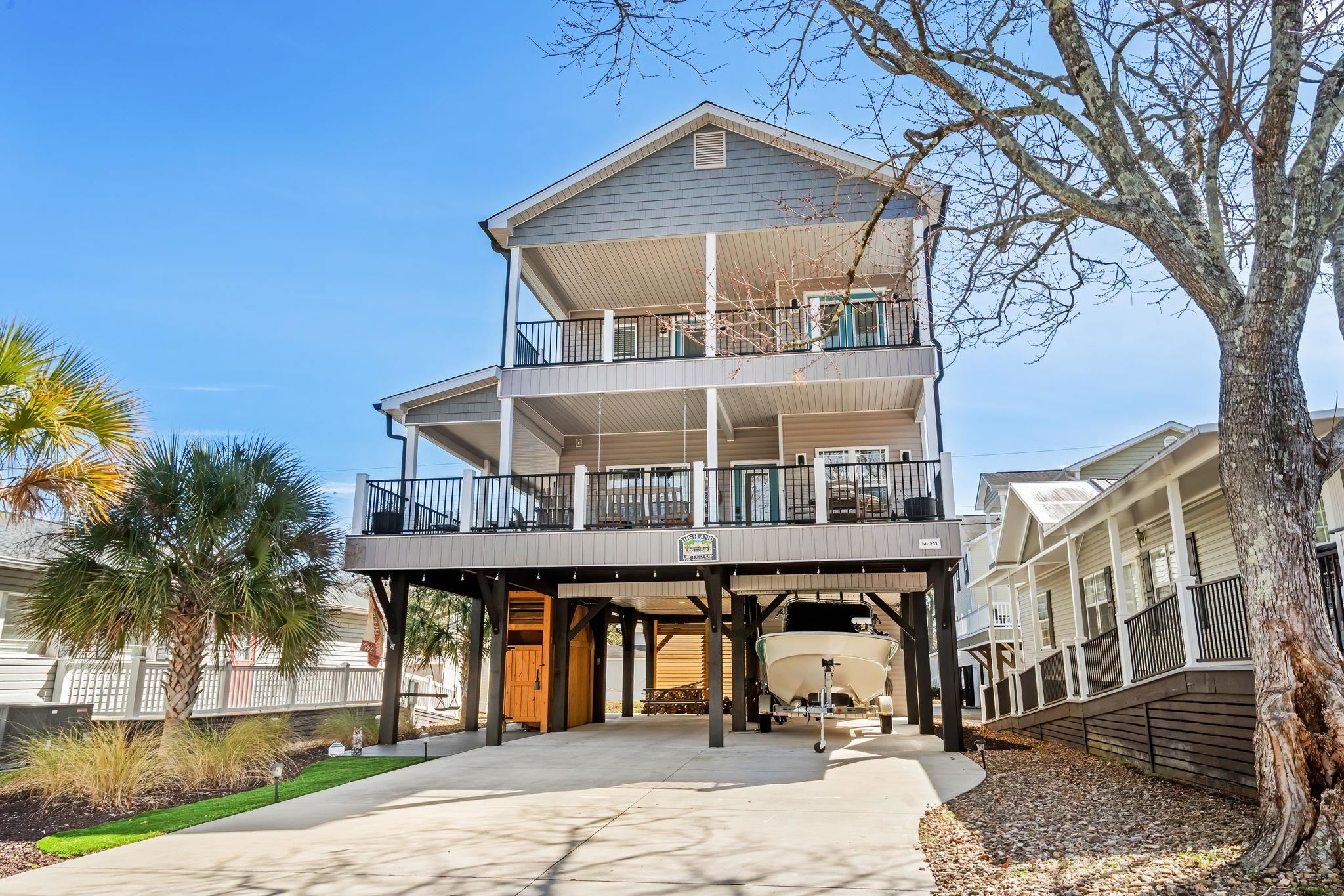 If you've been waiting for an IMMACULATE home on a DOUBLE LOT you found it at MH-203! This 5-bedroom 3.5 bath was built in 2020 and is being sold furnished. Seller spared no expense when building and landscaping this gorgeous property. Going up the covered composite steps brings you to a large covered front deck facing West. Composite decking, composite deck furniture, wood gliders, and a porch swing provide plenty of space to entertain and relax. Inside the entire home has premium LVP flooring, living area has shiplap accent wall and beautiful coastal furniture. Crown molding is found throughout the first floor with chair-rail in the living and dining area. Dining area with large round table flows into the kitchen. Tile backsplash, granite counters, stainless steel appliances, pantry, and island with seating for 4 gives you and your guests plenty of space to eat. 1/2 bath is located off the living room on the way to the primary bedroom with attached full bath. Primary bedroom faces East with a private door to a covered deck providing morning sun and afternoon shade, bathroom has dual sinks, walk-in tiled shower, toilet, and washer/dryer. Upstairs offers 4 more bedrooms and 2 full baths. 2 of the bedrooms have access to the large covered upstairs deck with composite gliders. Bedroom #3 & #4 are on the East side of the house, one has a queen bed and the other has full over twin bunks. Both upstairs baths have granite vanities and tub/shower combos. Crown molding was also installed upstairs to carry the elegance throughout this home. Ground level has a outside shower with hot/cold water and a nice entertaining area with privacy louvers.