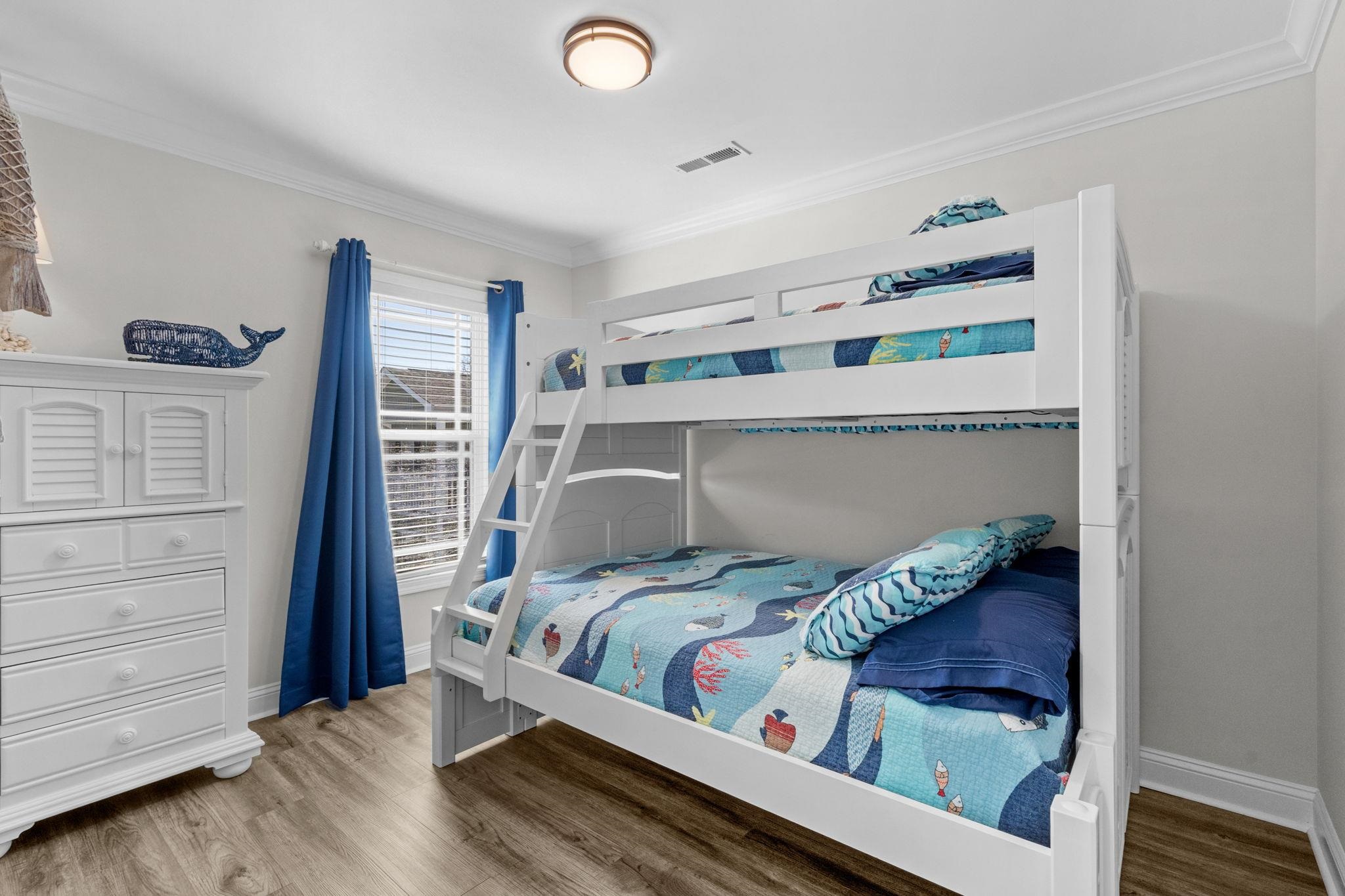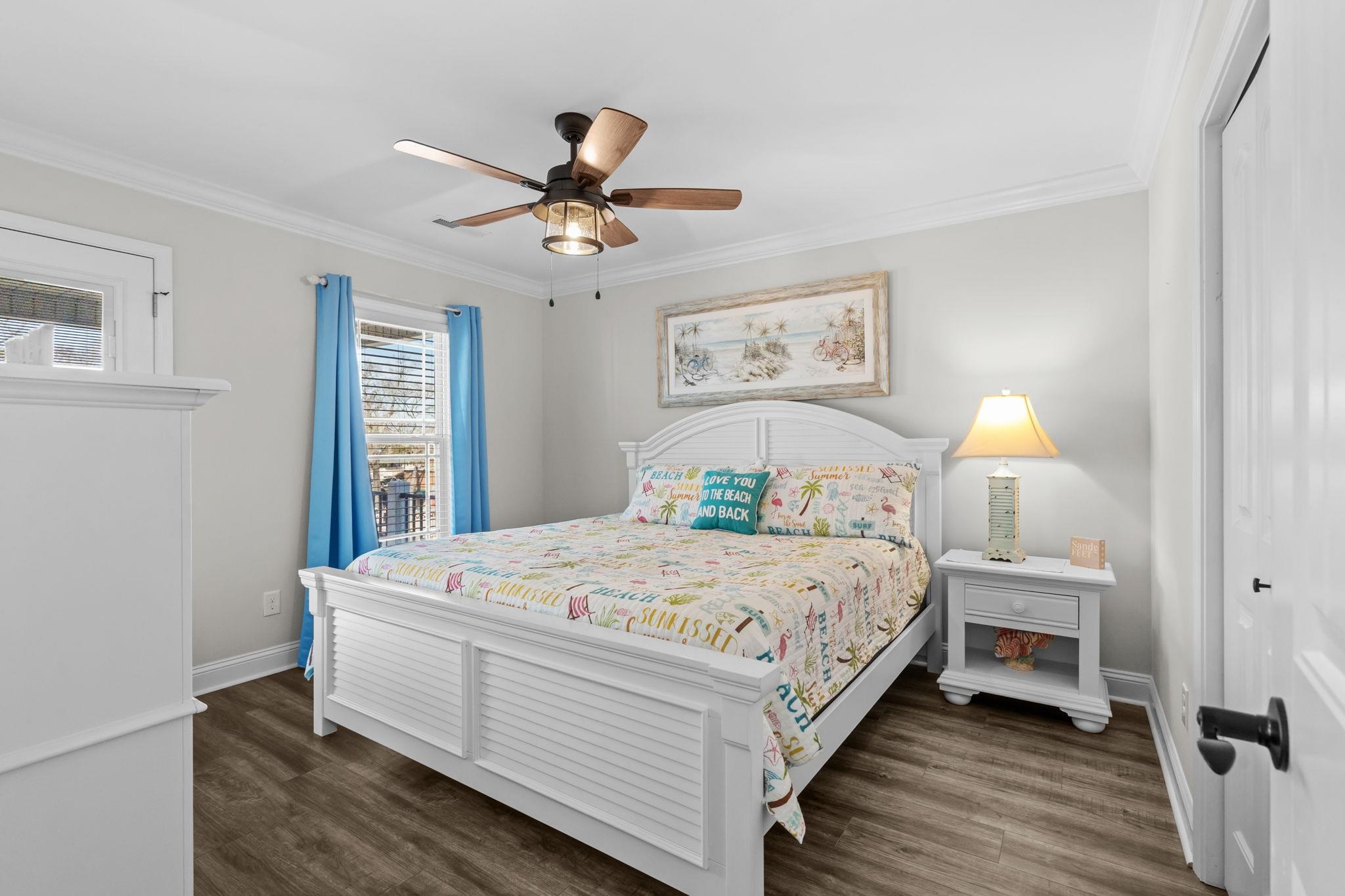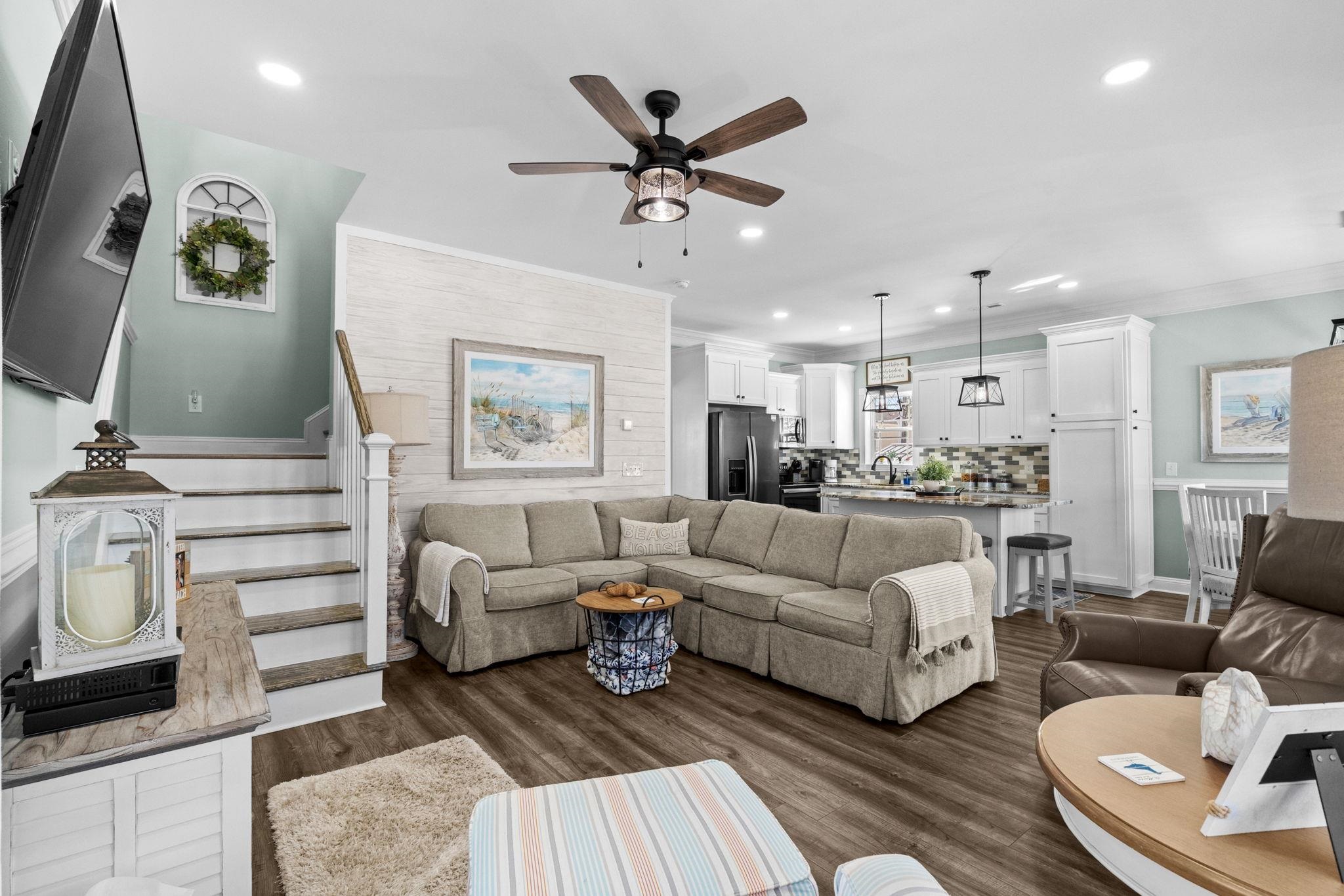 If you've been waiting for an IMMACULATE home on a DOUBLE LOT you found it at MH-203! This 5-bedroom 3.5 bath was built in 2020 and is being sold furnished. Seller spared no expense when building and landscaping this gorgeous property. Going up the covered composite steps brings you to a large covered front deck facing West. Composite decking, composite deck furniture, wood gliders, and a porch swing provide plenty of space to entertain and relax. Inside the entire home has premium LVP flooring, living area has shiplap accent wall and beautiful coastal furniture. Crown molding is found throughout the first floor with chair-rail in the living and dining area. Dining area with large round table flows into the kitchen. Tile backsplash, granite counters, stainless steel appliances, pantry, and island with seating for 4 gives you and your guests plenty of space to eat. 1/2 bath is located off the living room on the way to the primary bedroom with attached full bath. Primary bedroom faces East with a private door to a covered deck providing morning sun and afternoon shade, bathroom has dual sinks, walk-in tiled shower, toilet, and washer/dryer. Upstairs offers 4 more bedrooms and 2 full baths. 2 of the bedrooms have access to the large covered upstairs deck with composite gliders. Bedroom #3 & #4 are on the East side of the house, one has a queen bed and the other has full over twin bunks. Both upstairs baths have granite vanities and tub/shower combos. Crown molding was also installed upstairs to carry the elegance throughout this home. Ground level has a outside shower with hot/cold water and a nice entertaining area with privacy louvers.
