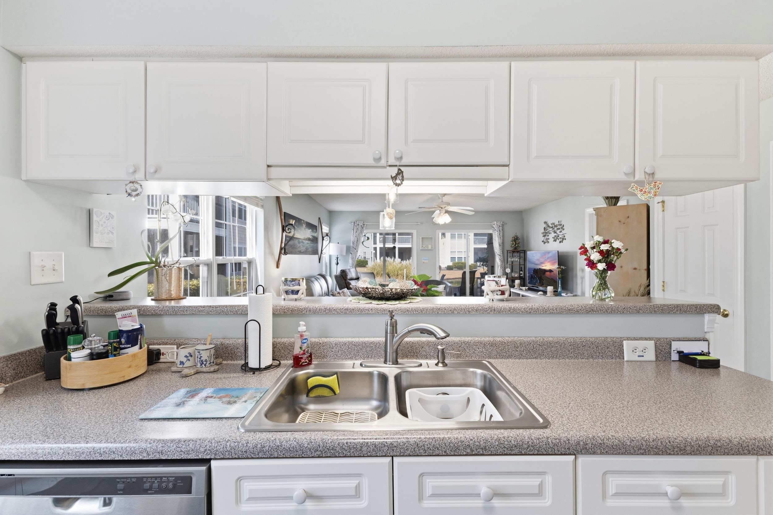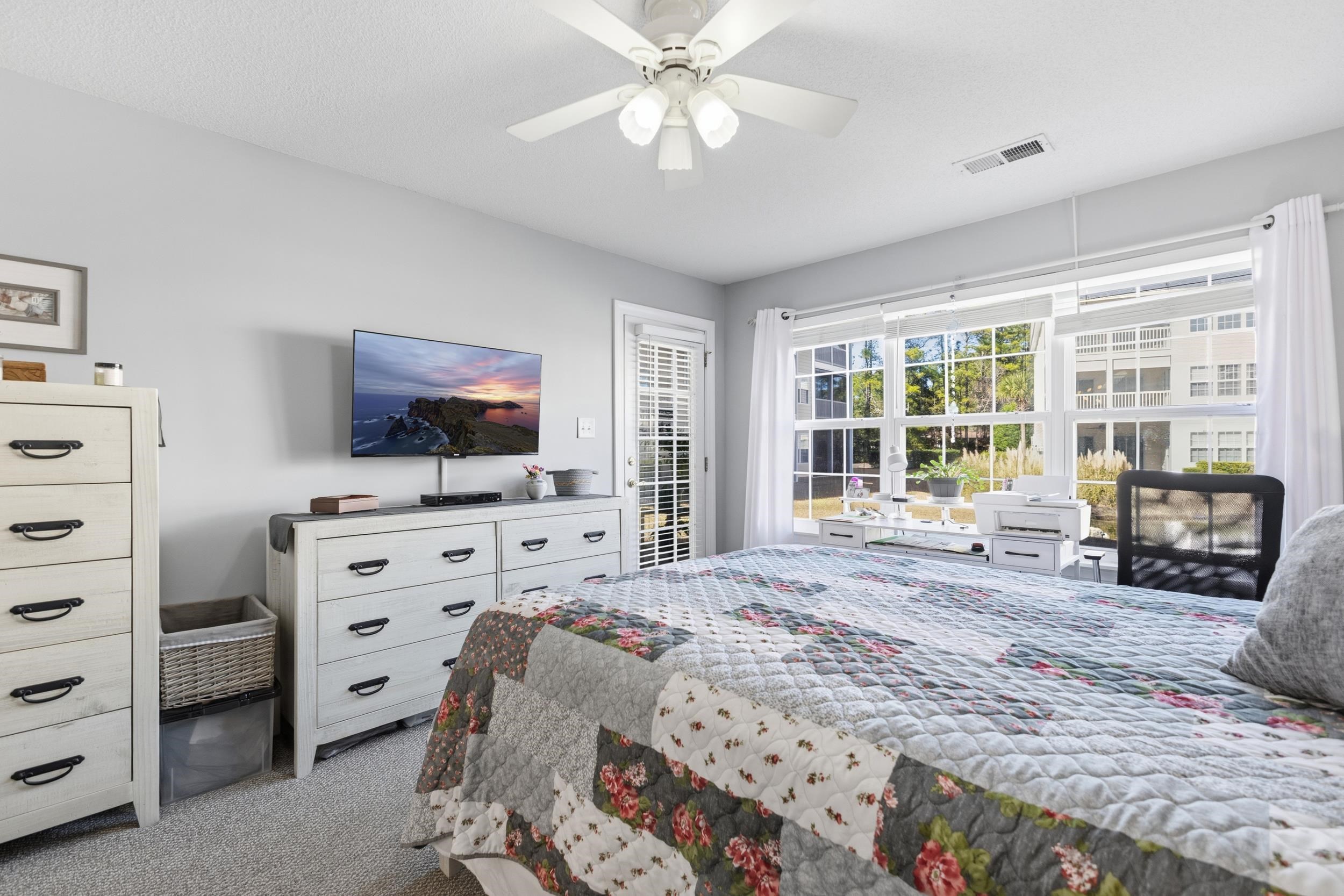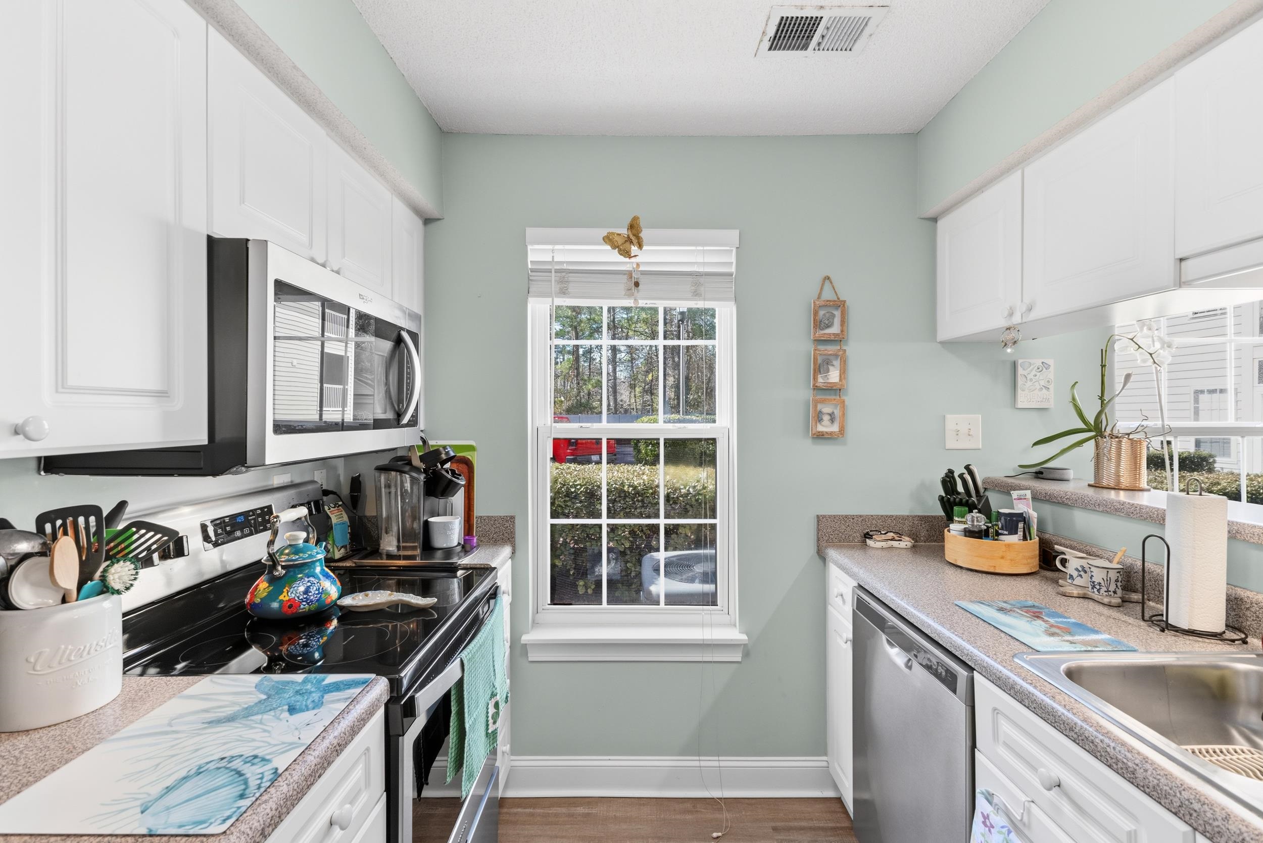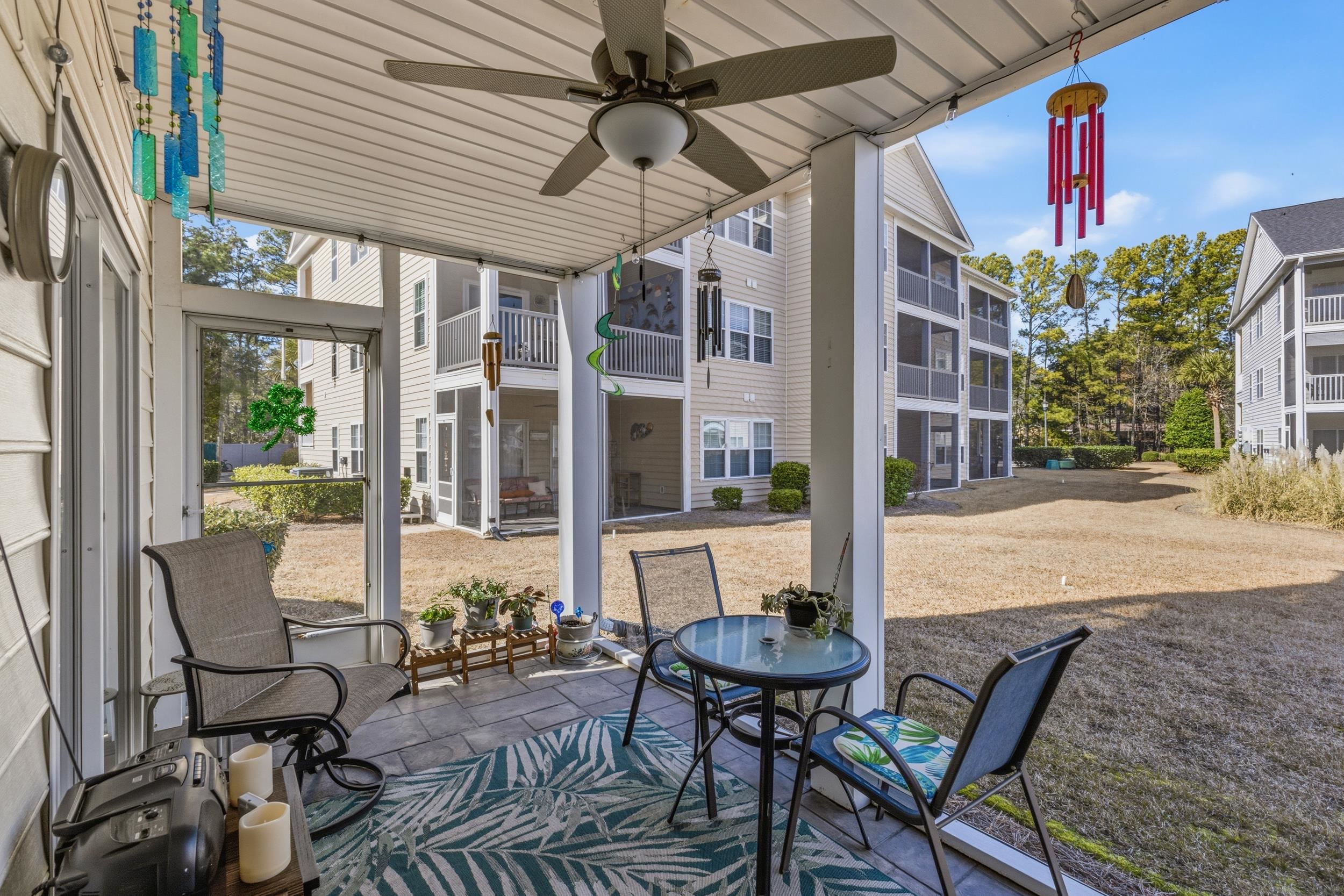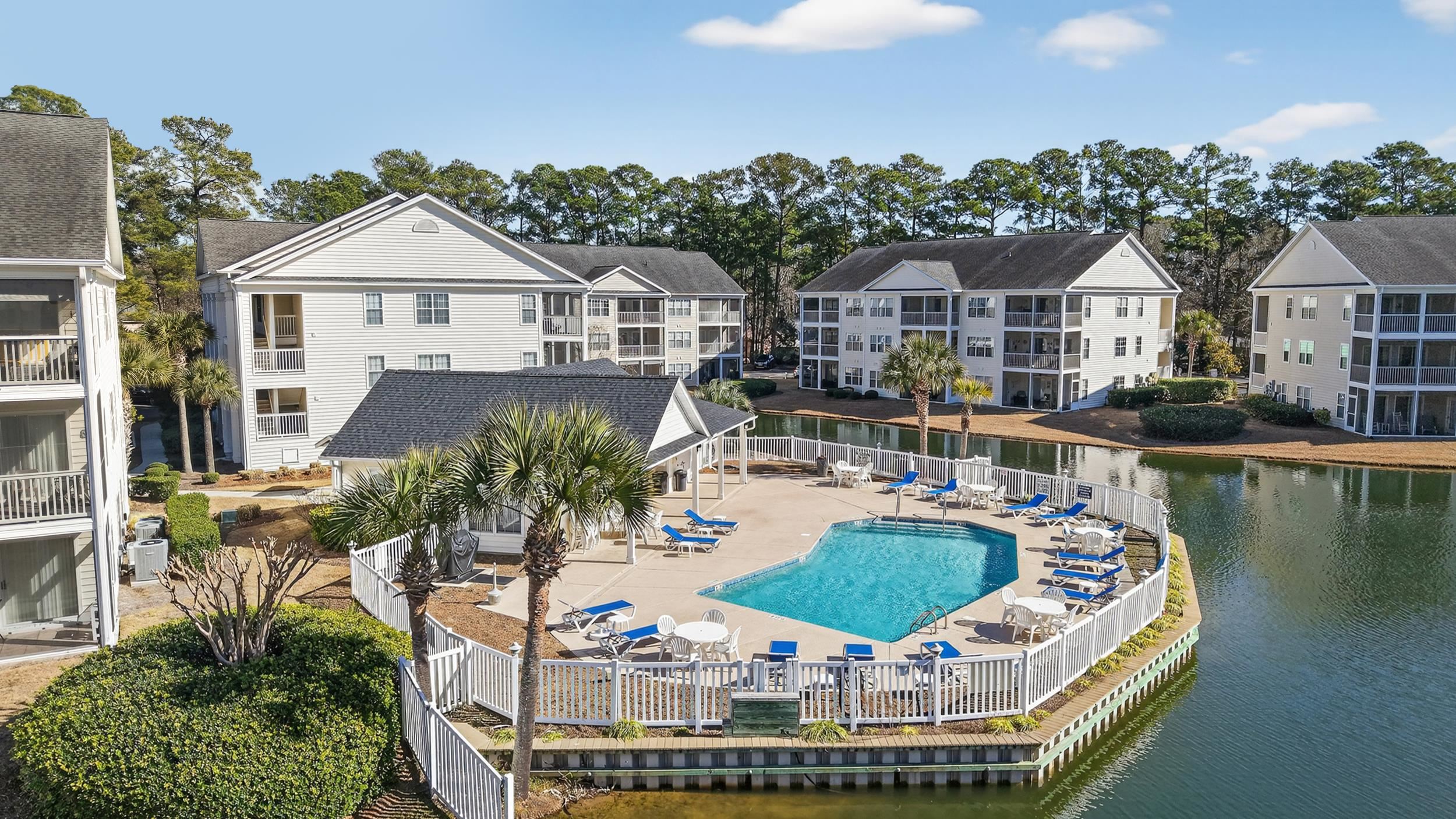 Welcome to this beautifully maintained end-unit, 2-bedroom, 2-bathroom first-floor condo in the heart of Murrells Inlet, located just 1.3 miles from the beach. Situated within a secluded, established neighborhood with mature landscaping, this property offers privacy, convenience, and low-maintenance coastal living. Designed for easy single-level living, the open-concept layout provides a seamless flow between the kitchen, dining, and living areas. Durable LVP flooring runs throughout the entry, kitchen, bathrooms, and living room, delivering both style and functionality. The kitchen features stainless steel appliances, ample cabinetry, and a pantry closet for additional storage. A convenient coat closet near the entry adds everyday practicality. Both bedrooms offer new carpet for comfort. The spacious primary suite includes a walk-in closet and private access to the screened-in rear patio, creating a peaceful retreat with beautiful water views. The secondary bathroom features a walk-in shower, ideal for guests or daily convenience. The screened-in patio extends your living space outdoors and overlooks a serene water setting perfect for morning coffee or relaxing evenings. As an end unit, this condo benefits from additional privacy and natural light. Additional features include a dedicated laundry room with a storage closet, providing extra organization and functionality rarely found in similar units. Residents enjoy community pool access and a quiet atmosphere just minutes from beaches, golf courses, marinas, dining, shopping, and the Murrells Inlet MarshWalk. Whether youre seeking a primary residence, second home, or investment opportunity, this well-appointed first-floor end unit offers comfort, storage, water views, and proximity to the coast all in one desirable package. All measurements and square footage are approximate and not guaranteed. Buyer responsible for verification.