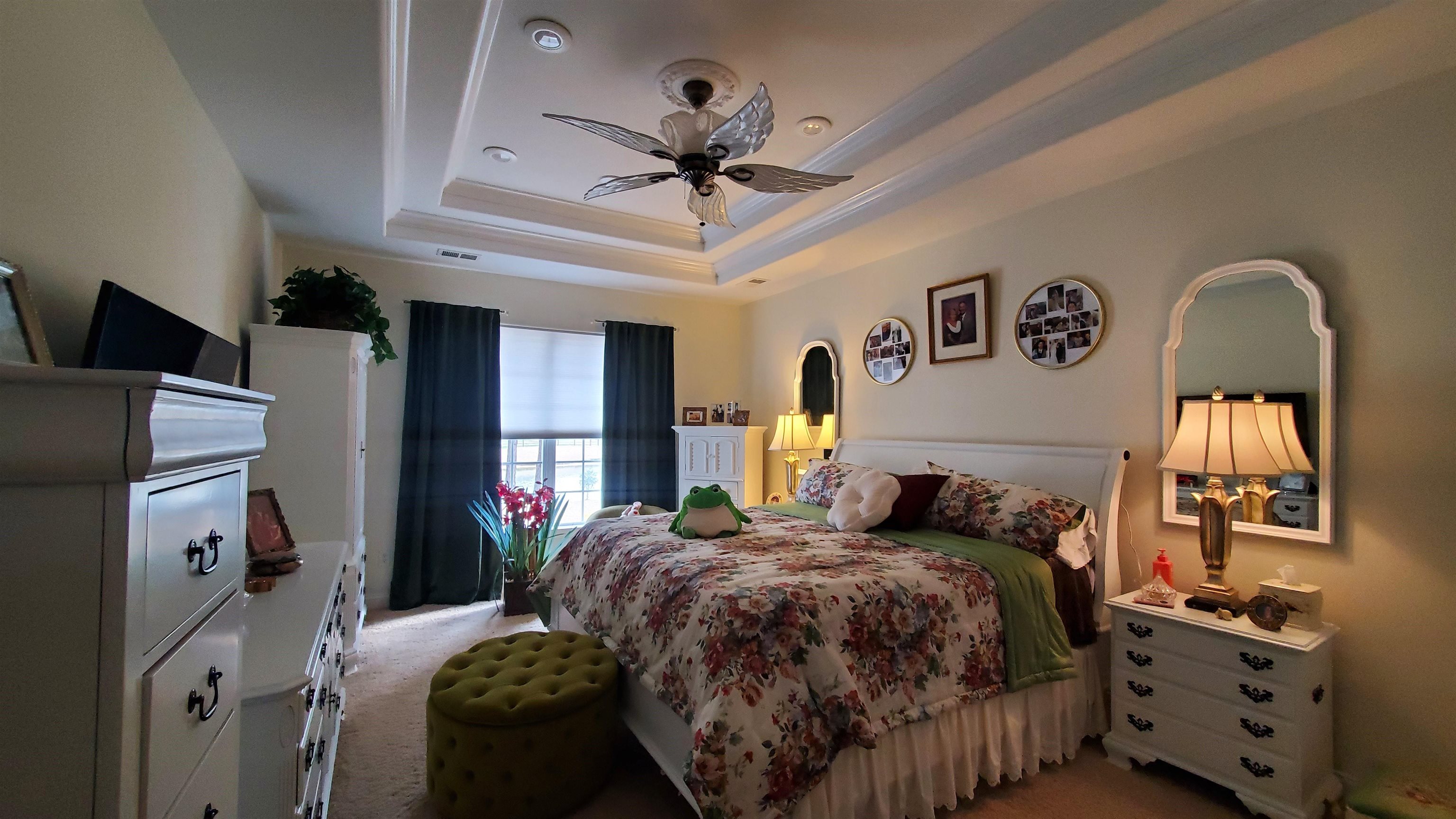 PrimaryBedroom: TrayCeilings, CeilingFans, LinenCloset, MainLevelPrimary, WalkInClosets