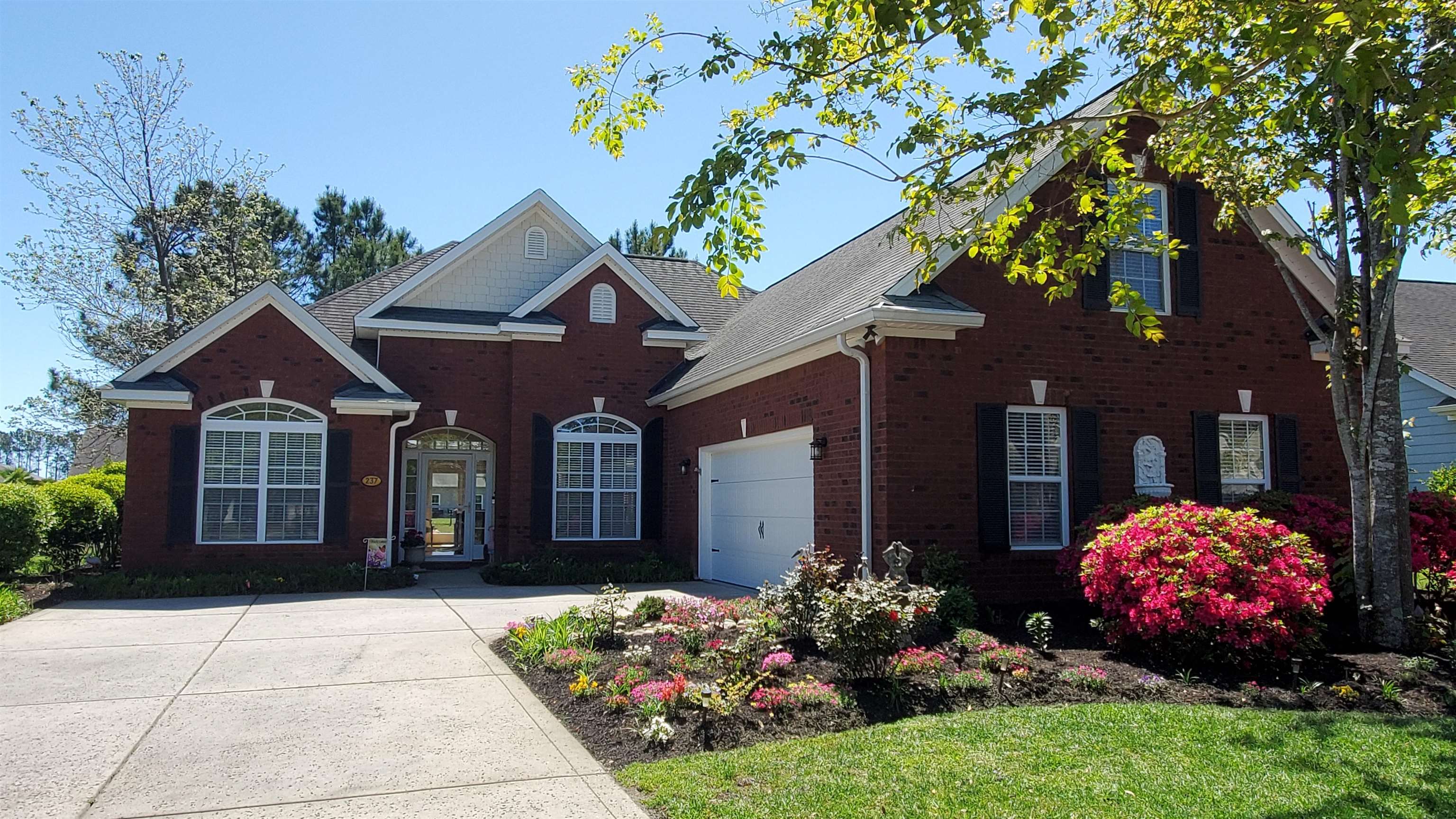 Beautifully landscaped & fountain-lined entrance leads to the gated Saint David's section of Windsor Plantation. This brick front 3BR/3Bath home has it all! Fresh Paint inside & out, Pond view & numerous perennial garden landscaped areas thru-out property. Upgrades thru-out this lovely home include French Doors, Transom, Side-Light & Eyebrow-Arch windows, Cathedral & Presidential Tray ceilings, columns, bullnose corners and extended square footage of climate-controlled Garage, Bonus Room & Kitchen Breakfast Room w/Bay Window. Upgraded Lighting fixtures, ceiling fans, Hardwood flooring, tile & carpet. Kitchen countertops & backsplash have recently been upgraded to Quartz. In addition to the Breakfast Room there is a breakfast bar, pantry & Stainless-Steel appliances. Formal DR with columns & elegant LR, both have 12'ceilings with double trays. French Door from LR leads to custom designed patio overlooking the pond. Primary BR suite with sitting area has Presidential tray ceiling & full Bath with vanity & double sinks and has floor to ceiling tiled Shower with Bench Seat and a large walk-in closet. This split floor plan offers privacy for guests with the 2nd BR & full Bath with additional linen/closet storage in hallway. Just off entry is the 3rd BR/Office with French Doors & Cathedral Ceiling. Upstairs is the extended Bonus Room & the 3rd full bath with floor to ceiling tile shower with bench seat. Long driveway allows space for multiple vehicles with courtyard entry to heated/cooled garage. Home warranty offered. Across the street is the Community Amenity Center Clubhouse with Fitness room, Kitchen, gathering room w/FP, 3 season Porch, Saltwater Pool, Spa Hot Tub & shallow pool with shade water feature as well as a bath house. Windsor Plantation is a natural gas community and close to major roads, golf and entertainment, shopping, restaurants and the beach!