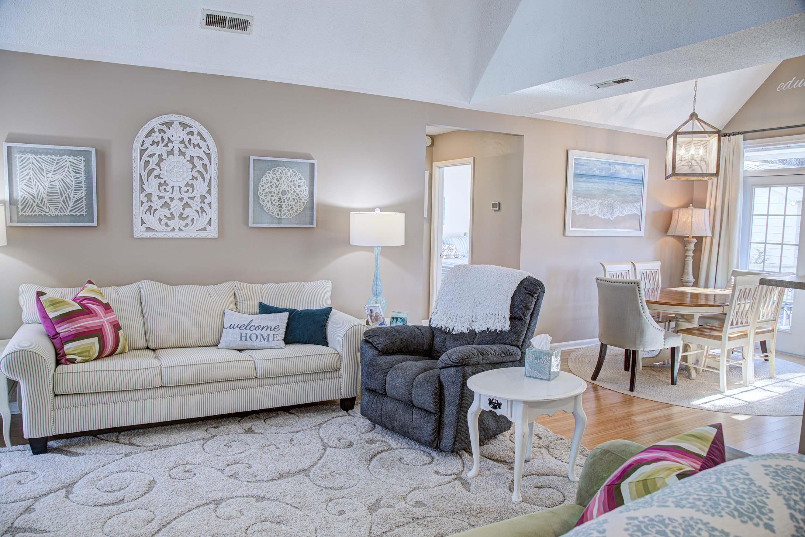 Located in the highly desirable Golden Mile area of Myrtle Beach, this charming 3-bedroom, 2-bath home is just a short walk or easy golf cart ride to the beautiful Atlantic Ocean making everyday beach access part of your routine. Whether youre seeking a full-time residence or a second home, this property offers the relaxed coastal lifestyle Myrtle Beach is known for. Inside, the bright and open floor plan features vaulted ceilings, bamboo wood flooring, and a cozy wood-burning fireplace that adds warmth and character. The kitchen includes solid surface countertops, ample cabinetry, and generous workspace, opening to the dining area with direct access to the deck and patio, perfect for indoor-outdoor living. Recent improvements include a new hot water heater and an HVAC system that is regularly inspected and professionally maintained. Outside, enjoy a private fenced yard with storage shed, along with abundant parking that includes a front turnaround, heated garage with insulated door, and carport. Short-term rentals are not permitted in the City of Myrtle Beach, preserving the residential feel of this well-established neighborhood.