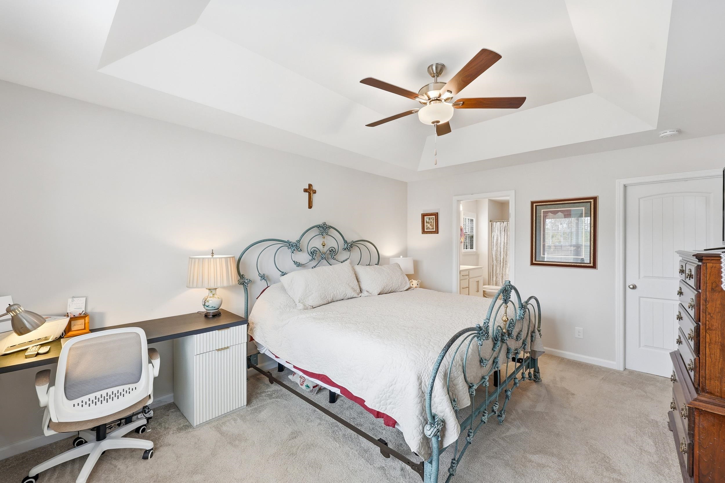 PrimaryBedroom: TrayCeilings, CeilingFans, MainLevelPrimary, WalkInClosets