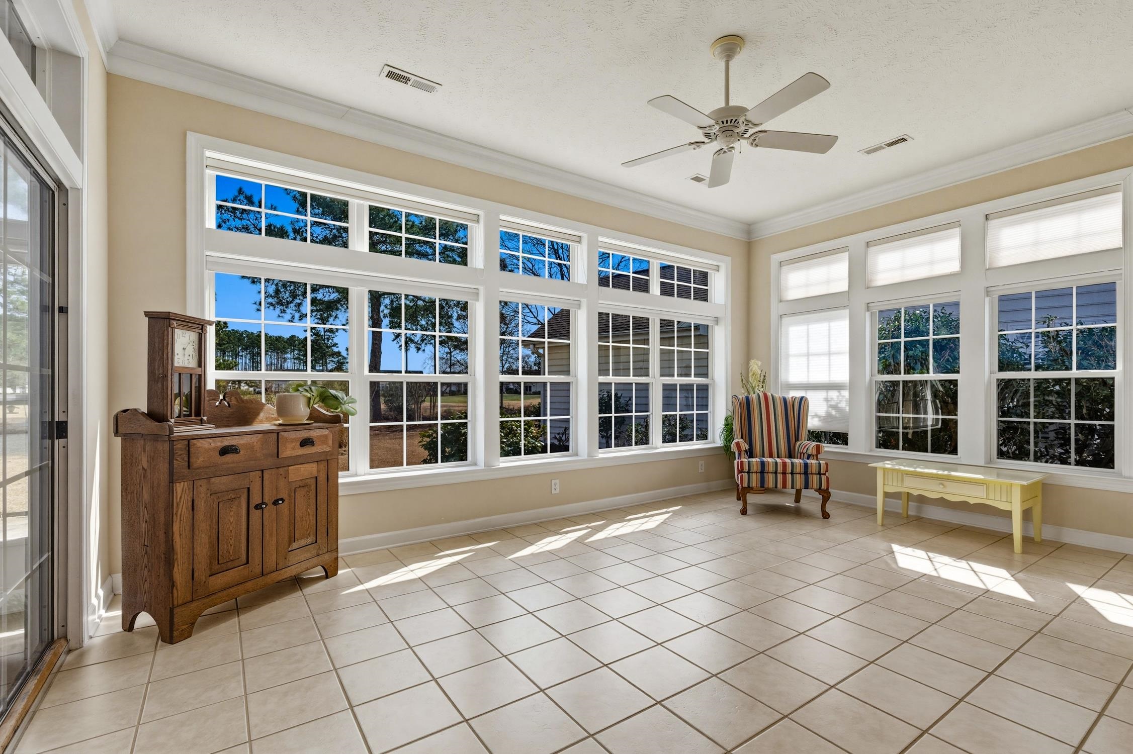 Welcome to this beautifully designed 4 bedroom, 2 bath home with a 2 car garage, ideally situated on one of the premier lots in Pebble Creek at The International Club. From the moment you step inside, you will notice the architectural detail that defines a true Sunbelt home. Transom windows fill the entry, living room, sunroom, and primary suite with natural light. Ten-foot ceilings, a graceful archway, pocket doors, and thoughtful design elements create a sense of elegance and openness throughout. The split bedroom floor plan offers privacy, with the primary suite tucked away from the guest bedrooms. The main living area flows seamlessly into a screened porch that has been enclosed for year round enjoyment. Just beyond pocket doors, the kitchen features solid surface countertops, a tile backsplash, fully trimmed cabinetry, and abundant cabinet space. The kitchen opens to an expansive sunroom, while a decorative archway leads from the living area to the formal dining room, perfect for hosting gatherings. A spacious laundry room and half bath are conveniently located just off the kitchen. The main level includes the primary suite and two guest bedrooms. Upstairs, the bonus room serves as the fourth bedroom but easily adapts to a home office, fitness room, playroom, or additional den. In addition to the 2 car garage, attached storage provides the perfect space for yard tools, coolers, and beach chairs. The views are simply spectacular. From the sunroom and enclosed porch, enjoy sparkling pond views with the golf course just beyond, close enough to appreciate, yet positioned perfectly for privacy. Residents of Pebble Creek enjoy outstanding amenities including a large community pool, fitness room, bocce ball and horseshoe courts, corn-hole, playground, covered picnic area, and a clubhouse complete with a fully equipped kitchen and gathering room. Conveniently located near shopping, dining, entertainment, golf courses, water sports, and just minutes from the famous Murrells Walk Inlet Marsh, this treasure is just a short drive to the beautiful blue Atlantic Ocean and white sandy beaches. Do not miss your opportunity to call this exceptional property home. Come find your own place in the sun today!