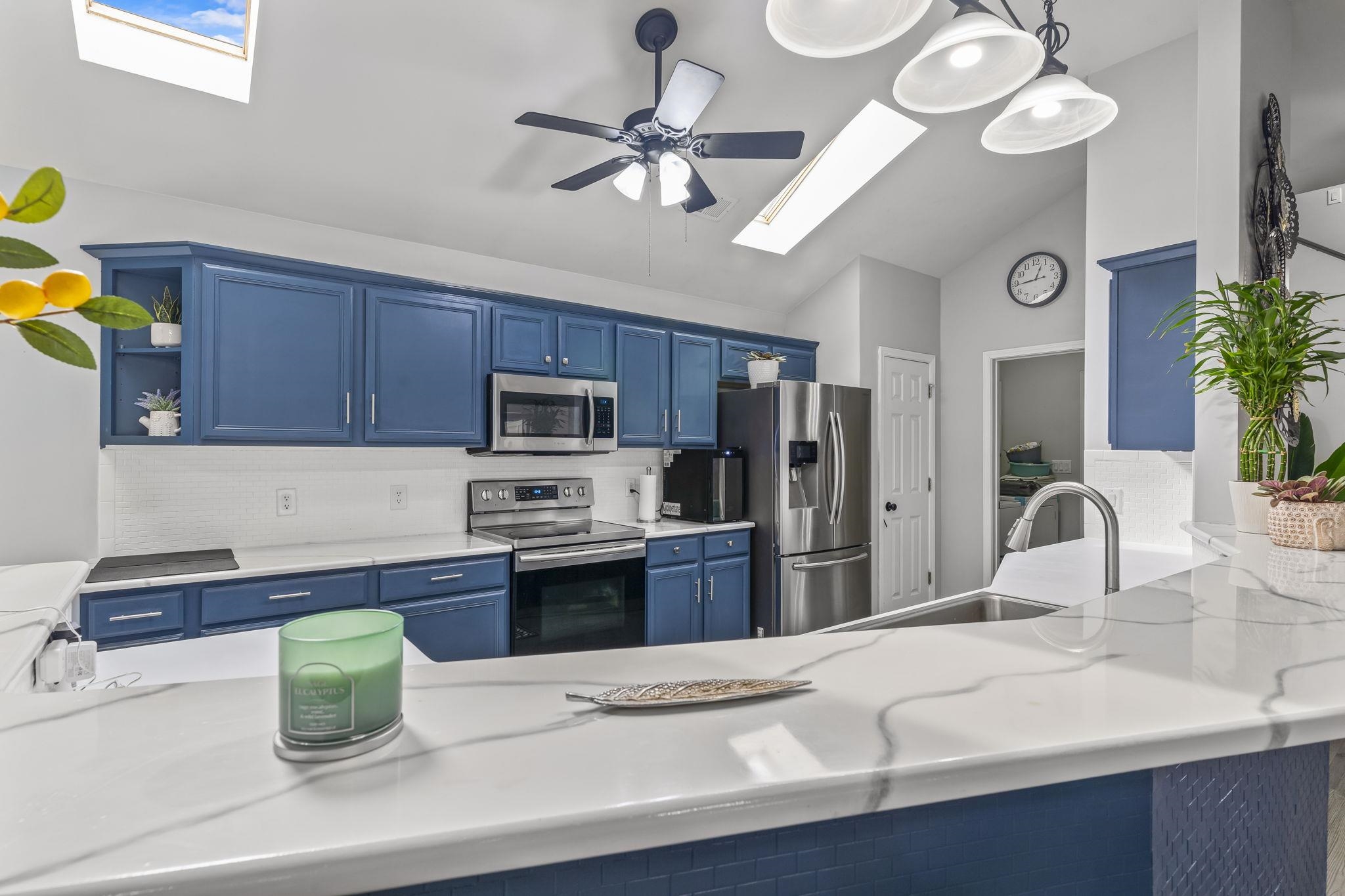 Beautifully updated 4 bedroom, 3 bath home on a huge .25 corner lot just minutes to the beach! Open floor plan with 12 foot ceilings and skylights for lots of natural light. Huge family room with a gorgeous fireplace, LVP flooring, and plenty of room for entertaining. Spacious kitchen is open to the family room and features stainless steel appliances, solid surface countertops and separate eatig area. First floor master bedroom and bath, with double sinks, tiled shower and a private exit to a hot tub area. Secondary bedrooms are large and the bonus room boasts it's own full bath. Outside, you'll find a luxurious, fenced entertaining area. Close to the beach, Market Common, many fine restaurants and shopping. Don't miss this one!
