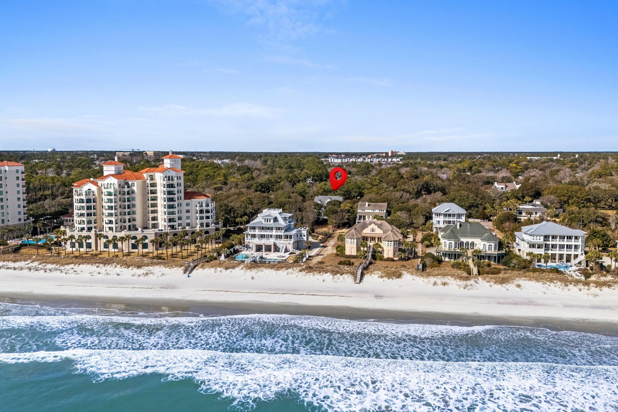 Oceanview and Dunes Cluban exceptional blend of coastal luxury and relaxed living. This magnificent, almost 9000 sq. ft. residence is crafted with extraordinary attention to detail inside and out, offering sweeping ocean views from multiple vantage points throughout the home. Updated and renovated to bring the trends into 2026, must-see kitchen and master bedroom/bathroom enhancements. Come through the gates and try to take it all in...the mature landscaping with gorgeous like oaks, the ocean breeze and salt air, and the peaceful sound of the waves, a few steps from your backyard. Step onto the welcoming front porch and into an impressive foyer that opens to a grand great room featuring floor-to-ceiling custom windows, built-ins, and a gas fireplace. To the left, a spacious office showcases custom cabinetry, wainscoting, and exquisite crown molding. To the right, a formal dining room comfortably seats twelveperfect for entertaining, holidays, and family gatherings. The gourmet kitchen is a chefs dream, complete with custom cabinetry, beautiful quartz countertops, expansive prep space, and premium stainless steel appliances, including a warming drawer, Sub-Zero refrigerator, and Thermador gas range. The adjoining keeping room offers ocean views and easy access to the homes outdoor living spaces. An elevator or elegant staircase provides access to all levels. The second floor features a loft with ocean views and a split bedroom layout. Each bedroom opens onto a generous balcony overlooking the backyard and the Atlantic beyond. The top floor is designed for entertainment and comfort, boasting a stunning media room with surround sound, theater lighting, and a retractable screenideal for movie nights or game days. A card table area and a convenient kitchenette make this level perfect for guests or a mother-in-law suite, complemented by two additional bedrooms. Could also be a perfect spot for a private gym! Perfectly situated on the largest rear lot in the Dunes Oceanfront area, this estate is a rare offeringexperience the best of coastal living in one of the area's most premier locations.