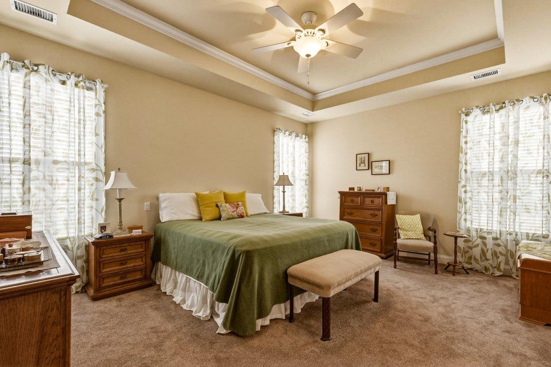 PrimaryBedroom: TrayCeilings, CeilingFans, LinenCloset, MainLevelPrimary, WalkInClosets