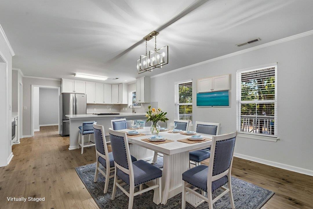 3BR / 2BA plus office - remodeled brick elevated home one block to the ocean in the Tilghman Estates section of NMB and 5 blocks to Main Street. Home features split bedroom plan with two guest bedrooms and hall bath on one end and open kitchen / dining with great room in the middle - master suite with walk in shower and laundry to the other end - office with door and egress window could be used as 4th sleeping room - Home has been updated with new flooring, paint, cabinets, countertops, appliances, etc - oversized two car garage under home with interior stairs - large covered front porch with peak view of ocean and open deck off the rear. No HOA or restrictions so would make great primary residence, 2nd home or vacation rental.