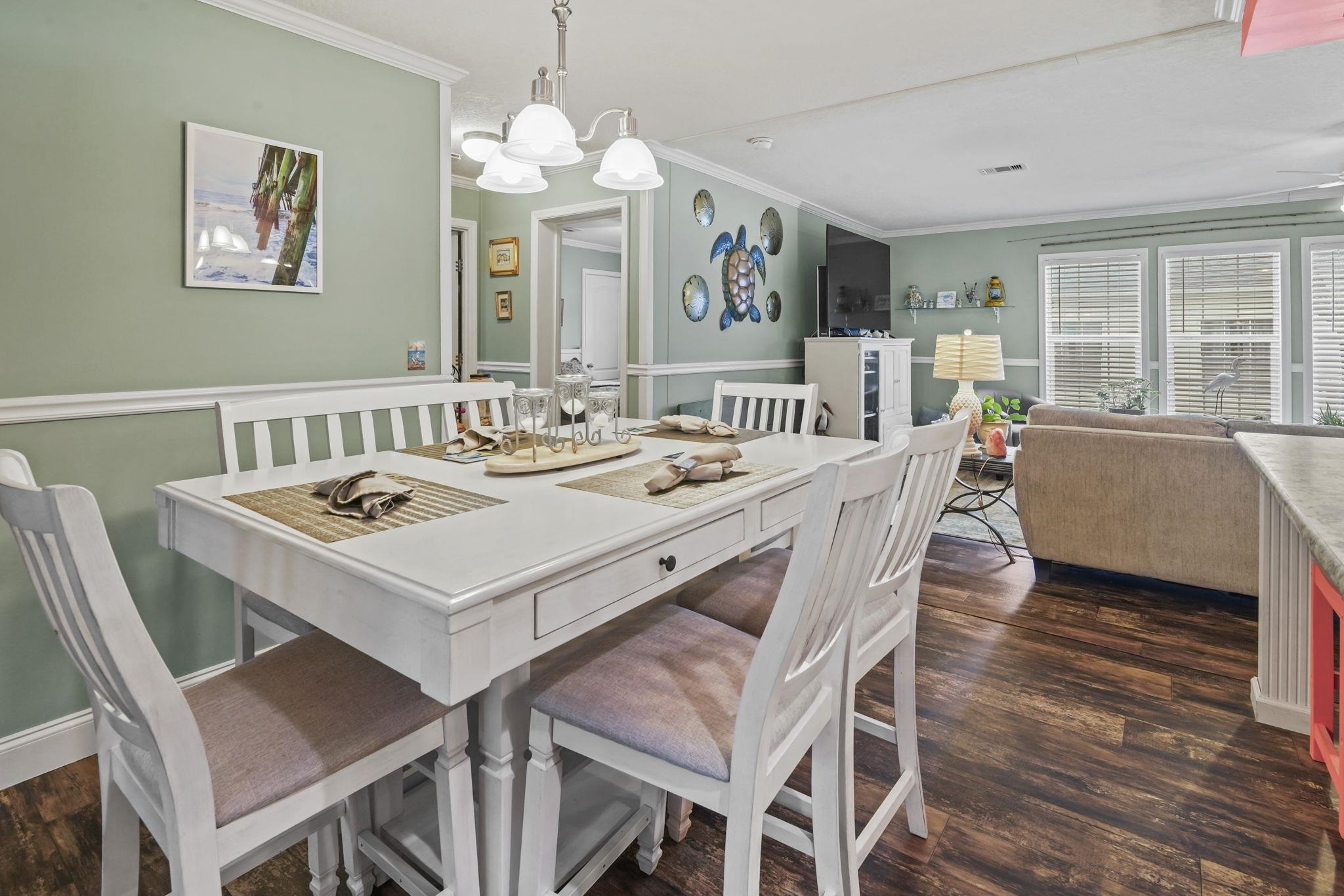 Coastal Living at its Finest! Experience the ultimate beachside lifestyle in this stunning, move-in-ready home located in a convenient golf cart community just one mile from the shore. This beautifully appointed residence features a seamless coastal theme throughout, highlighted by durable LVP flooring and updated lighting and ceiling fans. At the heart of the home, the open floorplan kitchen boasts a large island and stainless steel appliances, perfect for entertaining. The thoughtful split floor plan offers maximum privacy, featuring three spacious bedroomsall with their own walk-in closets. The master suite serves as a private retreat, offering a spa-like bath with dual vanities, a garden tub, and a separate tile shower. The living space extends outdoors to a large covered deck overlooking a meticulously landscaped, fenced-in yard that comes alive at night with automatic dusk-to-dawn lighting. Functional upgrades abound, including a dedicated mud/laundry room, a security system, outside storage building, and the home is wired for a generator for total peace of mind. Whether you are cruising to the beach in your golf cart or relaxing in the coastal breeze on your back deck, this home offers the perfect blend of luxury and location.