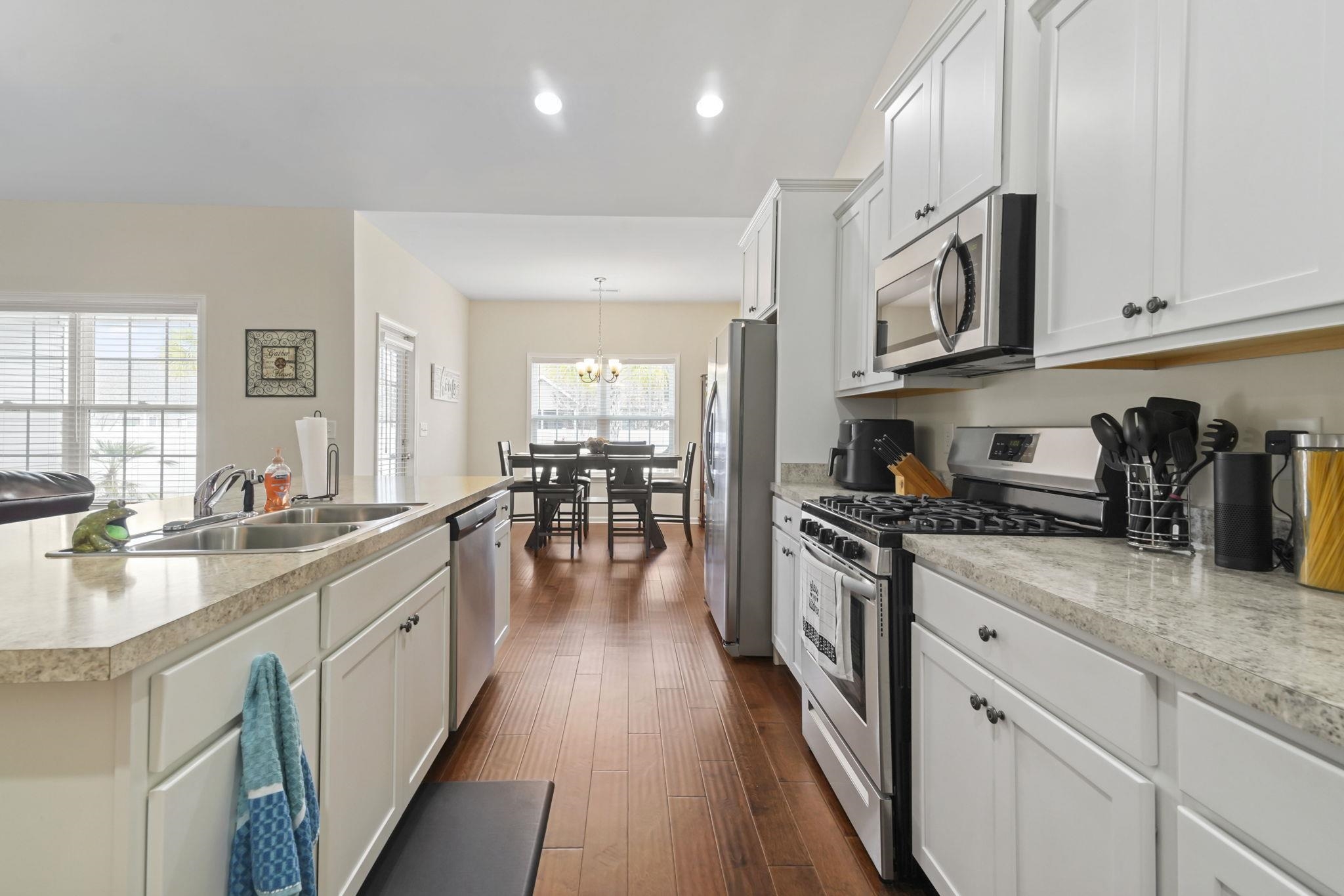 This beautiful, move-in ready home at 4104 Woodcliffe Dr in the sought-after Rivertown Row community offers single-level living with 3 bedrooms, 2 full baths, and a versatile office/bonus room. The open-concept layout features vaulted ceilings and hardwood flooring throughout the main living areas, creating a bright, flowing space connecting the kitchen, dining, and living areas, perfect for everyday life and entertaining. The kitchen includes a large island, pantry, stainless steel appliances, and stylish cabinets. The primary suite overlooks the yard and features a tray ceiling, walk-in closet, and en-suite bath, while all bedrooms include ceiling fans, and bathrooms and laundry are finished with tile flooring. Step outside to enjoy a fully fenced yard with a private in ground pool, covered patio with pool deck, tropical landscaping, palm trees, and decorative edging, offering a private retreat for relaxing or entertaining. Additional highlights include natural gas with tankless hot water, gas heat and stove/oven, energy-efficient windows, upgraded insulation, a fully finished garage with drop-down storage, and a professionally landscaped, sodded yard for low-maintenance living. Conveniently located just minutes from downtown Conway, shopping, restaurants, schools, medical offices, and only 15 miles from Myrtle Beach, this home combines thoughtful upgrades, comfortable design, and a prime location, making it a perfect move-in ready home with a private pool.
