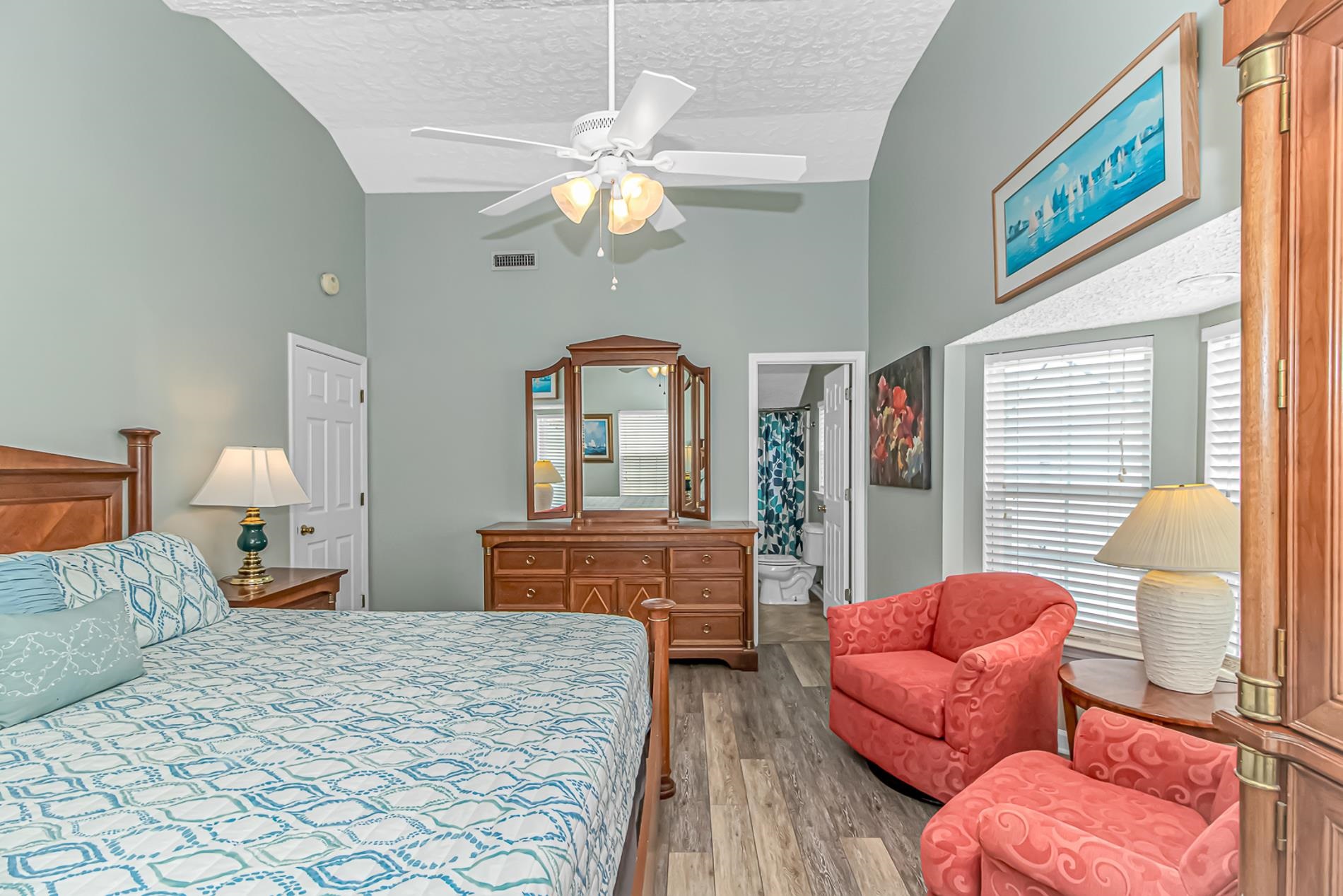 PrimaryBedroom: CeilingFans, VaultedCeilings
