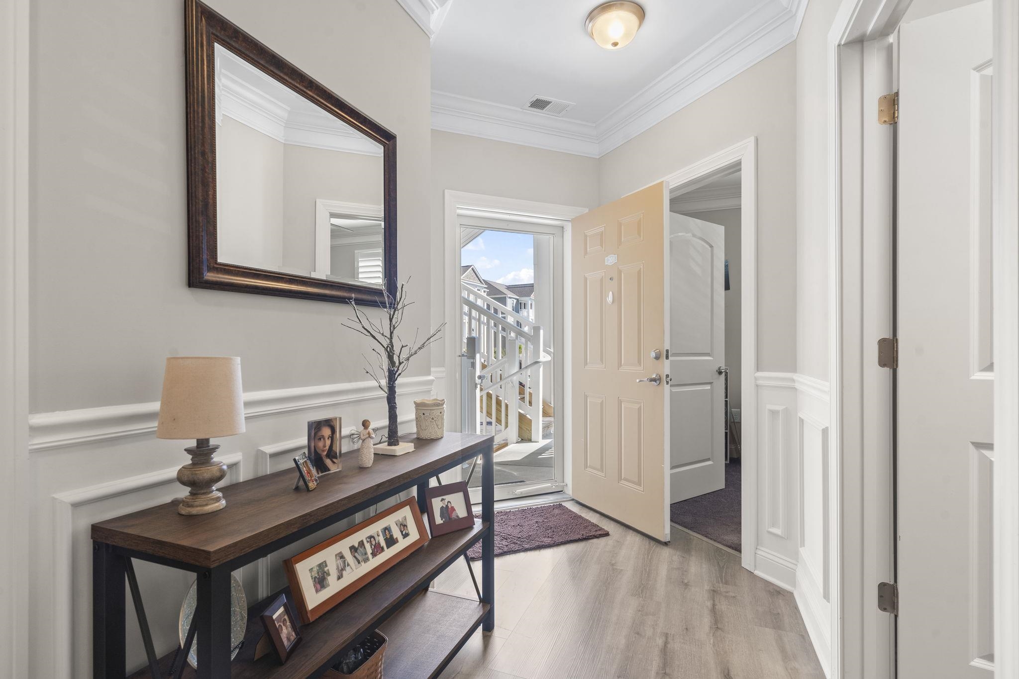 UPGRADES include: Vinyl Flooring and Roller Shades on the balcony, Shower Door in Primary Bathroom, Wainscoting in Dining Area, Recessed Lighting in Primary Bathroom, 2 TV mounts in the Primary Bedroom and Living Room, Cabinets in the Laundry Room, Backsplash in the Kitchen, Ceiling Fans in both Guest Bedrooms and Balcony, Double Crown Molding in all Bedrooms, Storm Door in Entrance, Plantation Shutters on all windows and Roller Shades on the Balcony Doors, added additional Shelving in Guest Bedroom closet. Built in 2024, this exquisite second-floor, end unit combines comfort, style, and convenience, offering an inviting home that feels both sophisticated and warm, and has the benefits from elevator access. Perfectly designed for those who appreciate thoughtful details and a tranquil ambiance, this lovely home features stunning pond views visible from the screened-in porch, making it a serene retreat for relaxation or entertaining. The vinyl flooring and roller shades let you control sunlight and breeze. The spacious living areas are adorned with LVP flooring, while the bedrooms provide plush carpeting for cozy comfort. Every bedroom is detailed with elegant double crown molding, adding a refined touch that elevates the overall aesthetic. The kitchen has modern stainless-steel appliances, paired with a beautiful backsplash that adds texture and visual interest. Whether preparing casual meals or hosting dinner, this area invites culinary creativity within a polished environment. Wainscoting in the dining area adds architectural charm and warmth. The primary bathroom features recessed lighting that creates a clean, inviting atmosphere, and the shower is enclosed with a sleek glass door. Plantation shutters on all windows offers both privacy and a classic style. And an extra bonus, the HOA pays for Internet and Cable! The Village of Queens Harbour II is conveniently close to dining, shopping; Market Common and the Marsh Walk, with the sandy beach just a short drive away.