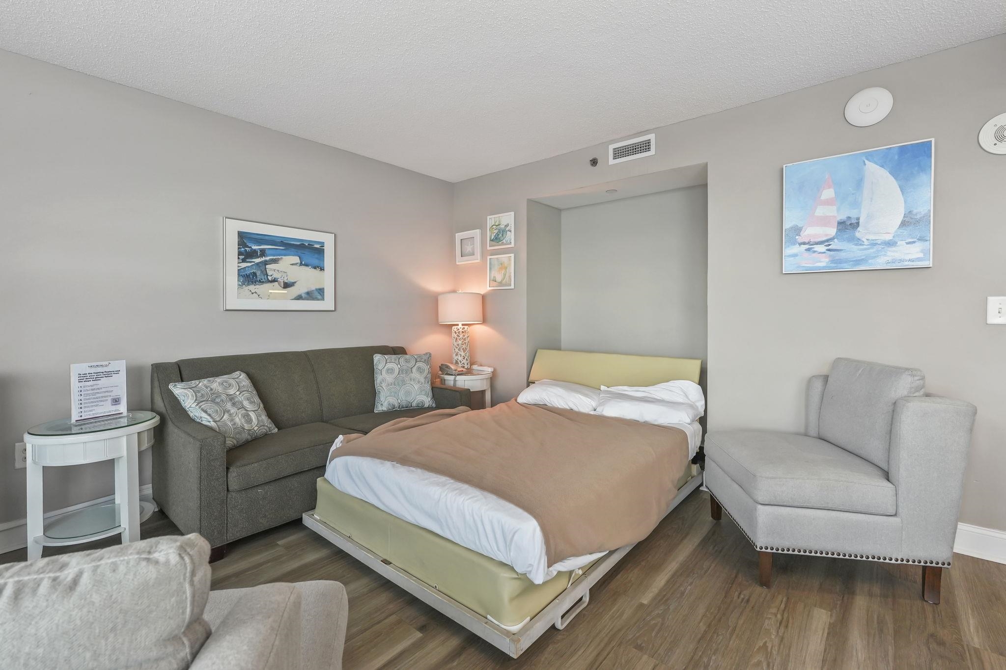 Welcome to this beautifully updated, fully furnished top-floor condominium in the heart of North Myrtle Beach, offering captivating ocean views, breathtaking sunrises, and stunning sunsets. Whether you are seeking a quiet coastal retreat or a well-positioned short-term rental investment, this property presents an exceptional opportunity. Thoughtfully designed with both functionality and efficiency in mind, the open-concept layout maximizes space and comfort. The well-appointed kitchen features elegant granite countertops, updated cabinetry, and ample storage for both personal items and beach essentials. Strategically furnished to accommodate up to six guests, the unit includes a convenient Murphy bed in the living area, maximizing sleeping capacity while preserving living space during the day. Sliding glass doors open to a top-floor balcony, providing elevated views of the beach lifestyle below and a peaceful setting to begin or end your day. The oversized bedroom offers privacy and comfort, while the beautifully updated bathroom showcases granite countertops and modern fixtures, creating a refined coastal feel. This unit includes one parking space on the parking deck. There are excess unassigned parking spaces available at a parking lot conveniently located across the street from the Seaside Resort Inn. Recent improvements include replacing the HVAC system and washer and dryer, ensuring the convenience and peace of mind for owners and guests alike. Seaside Resort offers an array of amenities designed for year-round enjoyment, including newly renovated indoor and outdoor pools, a lazy river, a fitness center, and a covered, easily accessible garage. Ideally situated in the center of North Myrtle Beach, the property is just a short walk to Main Street, known for its unique shopping, dining, and entertainment options. This condominium delivers the perfect blend of location, upgrades, and income potential. Schedule your private showing today to fully appreciate all this exceptional beach property has to offer.