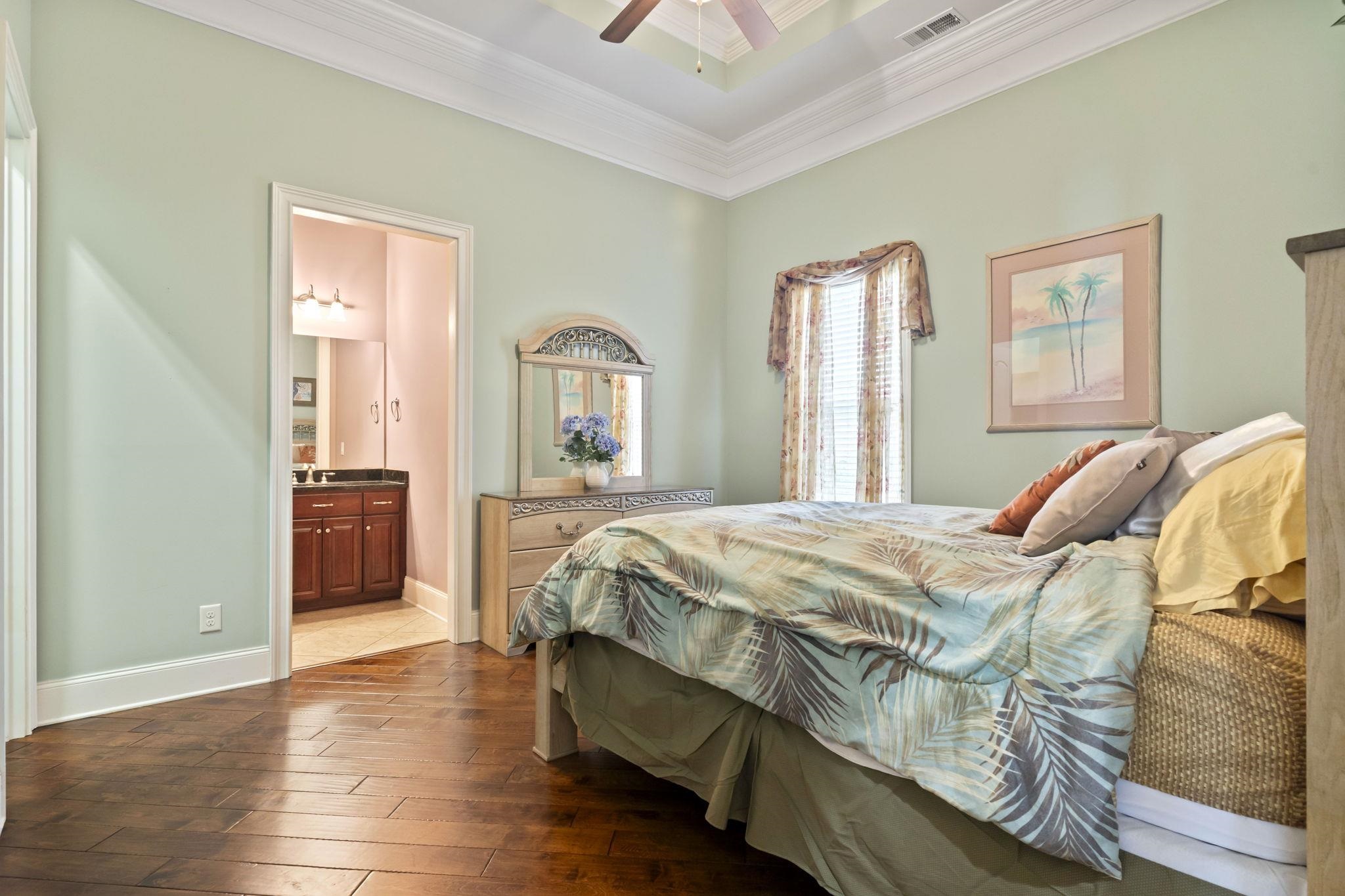 PrimaryBedroom: TrayCeilings, CeilingFans, LinenCloset, MainLevelPrimary, WalkInClosets