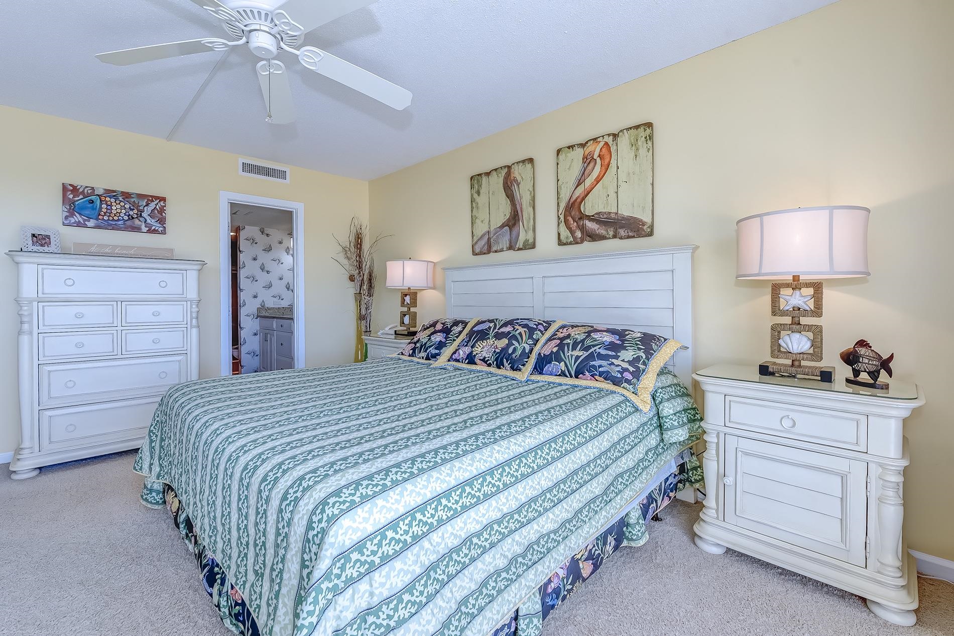 Experience coastal living at its finest in this beautifully maintained residence in Tower South at Ocean Club, perfectly positioned on the highly sought-after south side of the building, offering exceptional natural light and stunning sunset views from the private balcony. Lovingly cared for by the original owner since the buildings inception, this home has never been rented and has been gently enjoyed by family over the years. The pride of ownership is evident throughout, with thoughtful updates, quality furnishings, and a warm coastal aesthetic that complements the surrounding beach environment. The spacious living and dining area is designed to maximize comfort and views, with mirrored accent walls in the living room and primary bedroom reflecting the ocean and sky and bringing the beauty of the beach inside. Large sliding glass doors lead to the private balcony where you can relax while enjoying panoramic sky views and spectacular evening sunsets. The kitchen combines functionality with timeless finishes and features maple cabinetry, granite countertops, a full appliance package, and a breakfast bar overlooking the living area with a convenient pass-through to the dining space. Tiled bathrooms, kitchen, and hallway provide durability and easy maintenance. The bright, coastal-inspired bedrooms offer comfort and generous storage, while the mirrored wall in the primary bedroom reflects ocean views. The south side balcony location is widely considered one of the most desirable positions in Tower South, offering excellent natural light, cooling coastal breezes, and relaxing outdoor space for dining or lounging. Additional highlights include original ownership since construction, never being part of a rental program, gentle family use, and quality furnishings included.