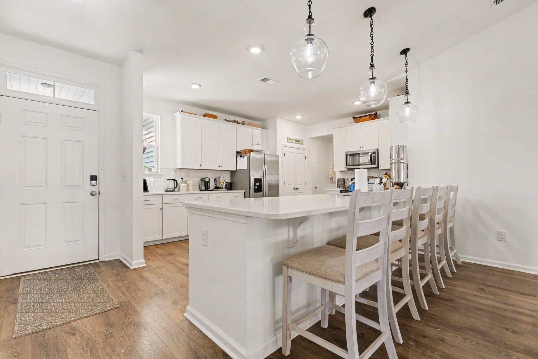This beautiful 3-bedroom, 2-bath ranch-style home is located in the desirable Surfside Plantation community, offering a perfect blend of comfort, style, and convenience. The home features numerous upgrades throughout, including a tasteful tiled kitchen backsplash, shiplap accents in the Carolina room, owner's bedroom, and owner's bathroom, as well as a stylish board-and-batten accent wall in the front bedroom. The dining and great room area is highlighted by a vaulted ceiling, creating an open and inviting living space. Luxury vinyl plank flooring runs throughout the main living areas, while the bathrooms and laundry room feature tile flooring. The kitchen is equipped with stainless steel appliances and an extended quartz countertop, providing ample space for cooking and entertaining. The owner's suite offers a walk-in closet, a beautifully tiled walk-in shower, and a large double-sink vanity. At the rear of the home, the bright Carolina room opens to a covered patio featuring a privacy wall and illuminated posts, creating the perfect space for relaxing or entertaining guests. Ideally situated adjacent to the community pool and clubhouse and overlooking a peaceful pond, this home offers both tranquility and easy access to neighborhood amenities. Conveniently located just minutes from the BEACH shopping, dining, and Myrtle Beach International Airport, this home truly has it all. Don't miss your opportunity to own this charming home! Schedule your showing today