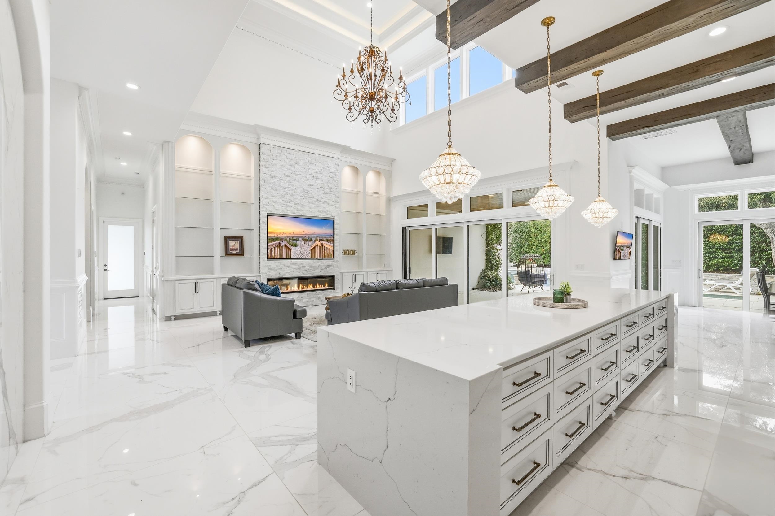 Welcome to 3203 Ocean Blvd. N, a rare opportunity to own a custom luxury home on the prestigious Golden Mile in Myrtle Beach- just across the street from the Atlantic Ocean. Situated on a fully gated corner lot, this Mediterranean-style residence offers 6 bedrooms and 5 full baths and two half baths with nearly 5,000 heated square feet of upgraded living space. The main level features two bedroom suites, a formal office, spacious living areas with two fireplaces, a gourmet kitchen with waterfall-edge counters, two custom islands, large walk in pantry, two oversized refrigerators with one being a Sub-Zero refrigerator, and a new dishwasher. Upstairs includes four additional bedrooms, a loft with built-in office space, and a dedicated media/movie room that comes including the cinema screen , projector and oversized furniture. TVs, washer, dryer, and much of the furniture can convey, including an art-style framed TV in one bedroom. Outdoor living is designed for entertaining with a heated saltwater pool, hot tub, gazebo, fire pit table, outdoor TV, and a fully equipped kitchen featuring a Coyote grill, two-burner cooktop, and ice storage as well as an upscale half bath outdoors with pool access. The backyard also includes an outdoor shower, fresh landscaping mulch, and updated irrigation with a new pump. Additional highlights include a four-car garage with new paver parking area, electric vehicle charging station, new pool heater and pumps, and a fully fenced yard with added puppy guard. This exceptional property combines luxury, privacy, and an unbeatable coastal location close to golf, dining, and shopping.