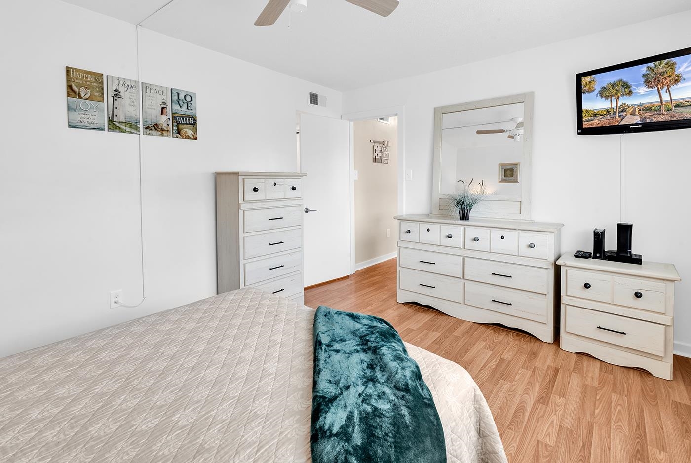Welcome to Oceanbridge Unit C-31, a beautifully maintained, fully furnished, top floor unit featuring 2 bedrooms and 2 baths. Step into a spacious beach condo with an open concept kitchen and living room / dining area perfect for family gatherings. Walk through the large slider out to a balcony overlooking one of the two pools and enjoy the spectacular sunsets. The split bedroom floor plan provides added privacy. Primary bedroom offers large closet, updated ensuite and sunsets from an oversized window. Second bedroom has ocean views and beautiful sunrises. The kitchen has updated cabinets, granite counter tops, equipped with stainless steel appliances, new lighting and washer/ dryer combo.Additional updates include HVAC in 2020, LVP flooring throughout and so much more. Conveniently located steps to the beach, in the sought-after Arcadian section of Myrtle Beach, you'll have easy access to outdoor activities like surfing, fishing, and dolphin watching. Plus, you're just minutes from Broadway at the Beach, Barefoot Landing, Tanger Outlets, shopping, golf, dining, nightlife, theaters, and family-friendly attractions.
