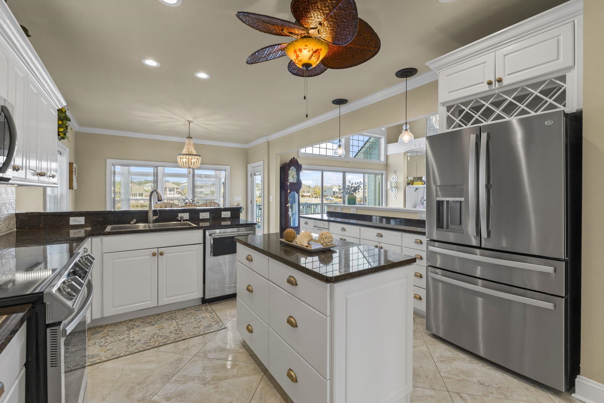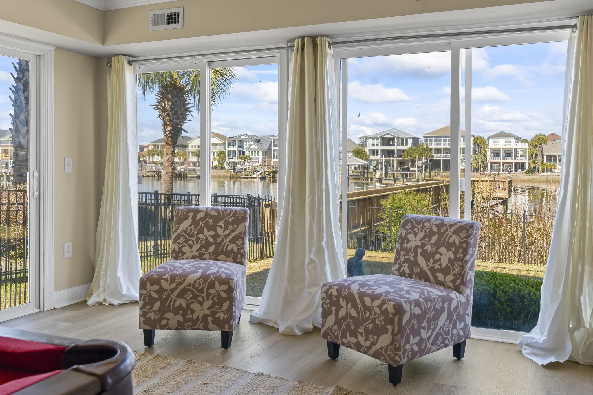 When coastal glam meets southern charm, you will find this stunning estate in Sunset Harbour of North Myrtle Beach. This is your moment to experience the pinnacle of waterfront living as this home is directly on the Intracoastal Waterway, it comes with a shared dock already in place and ready for your boat lift. This is a mariner's dream! Inside, the home radiates sophisticated charm with formal living and dining rooms that greet you upon entering. However, you can't help but be captivated by the views of the Intracoastal Waterway in the wide open classy family room, gourmet kitchen, large breakfast area and cozy Carolina room. This home was truly designed for grand scale entertaining. Also located on the main living floor is one of three primary suites in the home. It is a fabulous space, tremendous in size and so well appointed with high end Alaskan white hardwood floors. Additionally, you will find a 1/2 bath and large laundry service room with tons of storage and space. The marvelous and unique third floor has a catwalk that overlooks the front entry, family room and of course those views of the waterway. You will also find two other large primary suites with attached baths. One of the suites boasts it's own balcony for quiet sunsets, cocktails and yacht watching. There is also a well sized flex space that could easily be converted into a fifth bedroom. We can't forget to mention there is a huge walk in storage area as well. Moving down to the ground level, you have two garages that are large enough to fit all of your toys! A boat, vintage car, motorcycles, golf carts...whatever it is, this home offers that space with ease. You also have a heated and cooled workshop for those who love to be creative and a bonus space fit for a billiard room, guest space, or media room. It's up to you to decide and enjoy. Beyond the workshop is a partially enclosed storage area that could easily be converted into an outdoor kitchen of your dreams. The yard is substantial and your canvas to create your own oasis. And if that dream backyard oasis includes a pool, you won't have to worry about your visitors, because there is a half bath on this ground floor too. So, whether you're heading out for that sunset cruise on the waterway or taking a quick golf cart ride to the beach to watch the sunrise, the best of the coast is at your doorstep with this estate. Being so centrally located in North Myrtle Beach, there are many dining establishments and boutique shopping experiences just a short golf cart ride away. Sunset Harbour offers first class amenities that include a swimming pool, hot tub, day docks, boat launch, gazebo, and recreational vehicle parking. Hurry and call your trusted Realtor partner to schedule your private showing now.