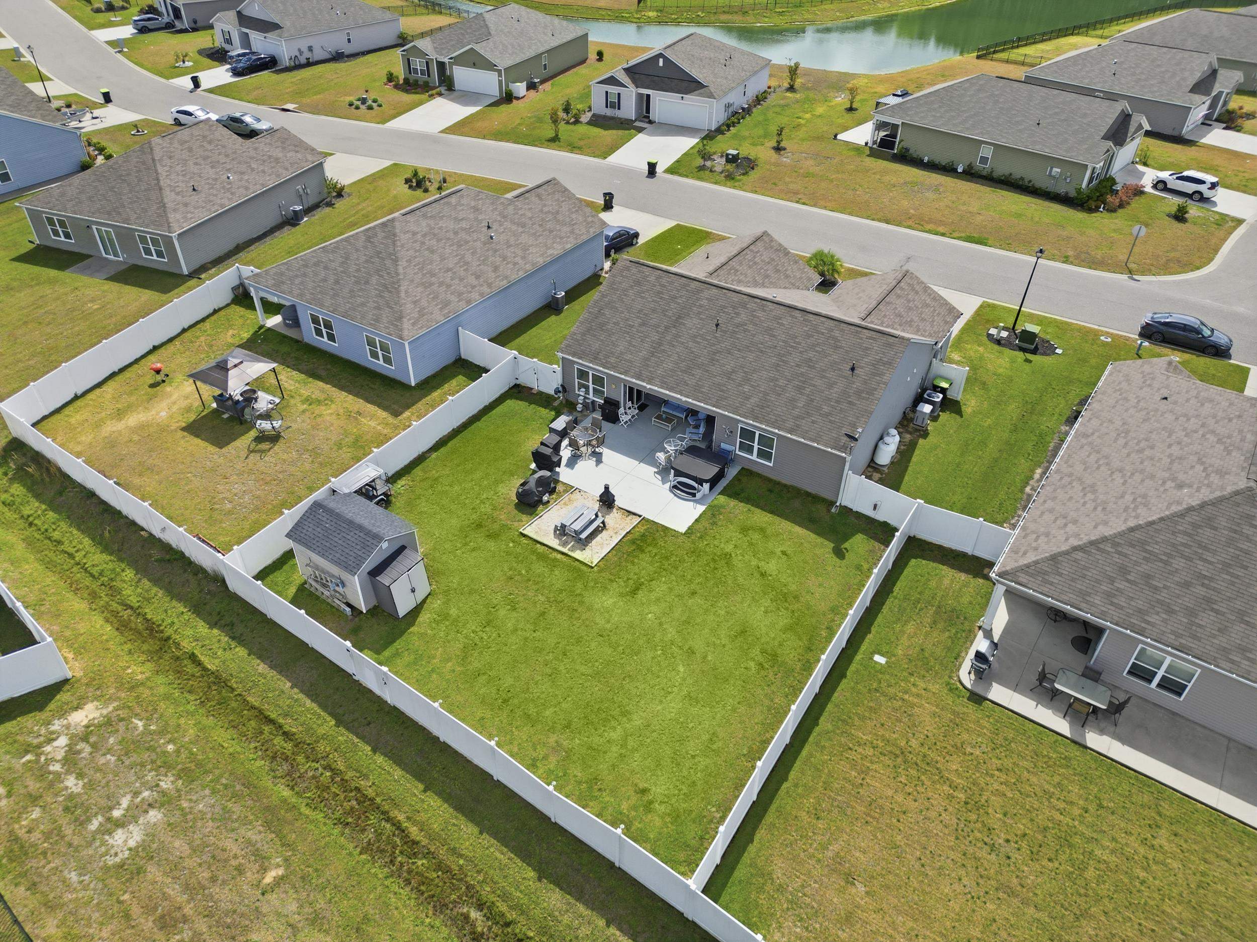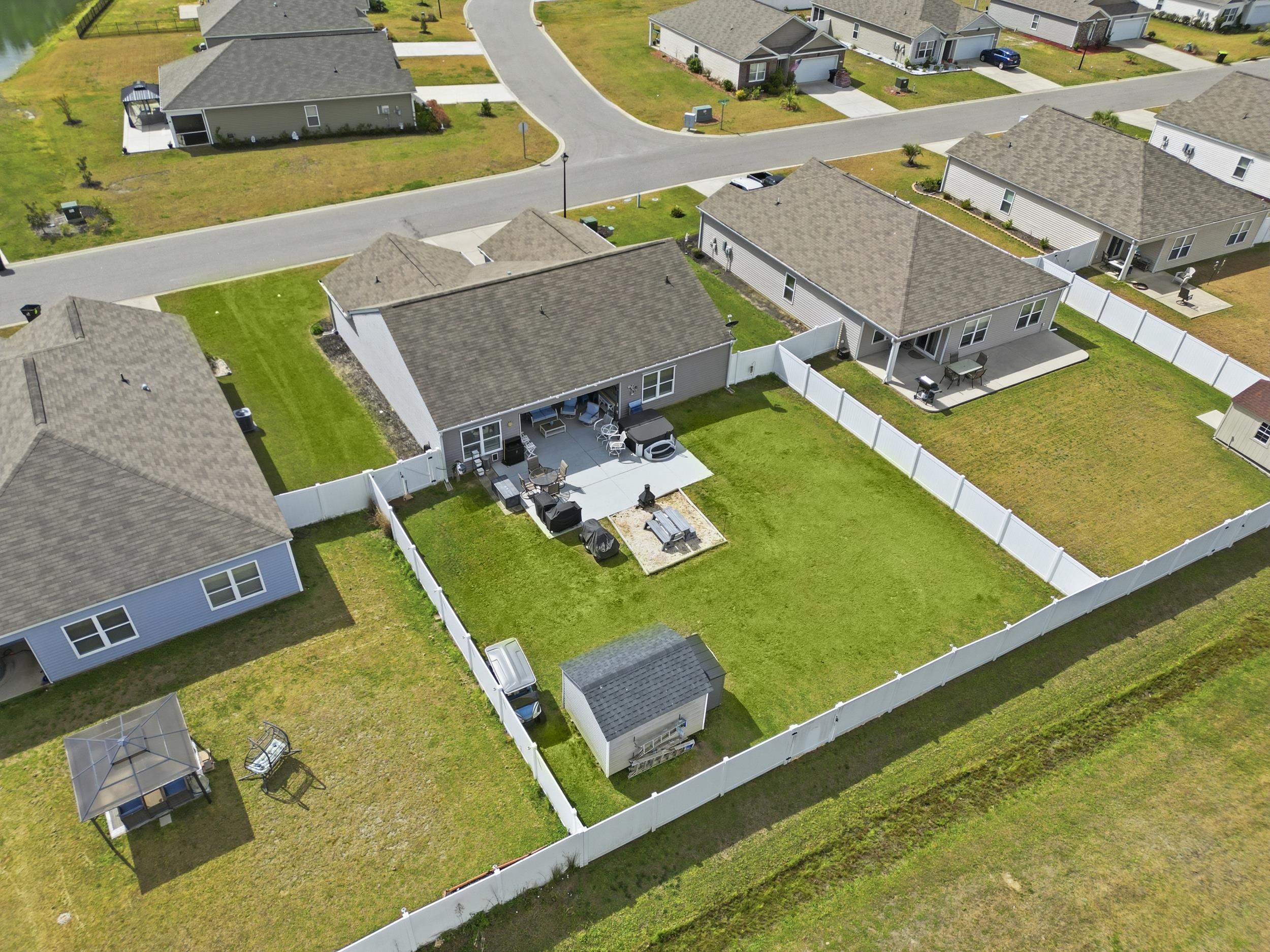 Upgraded and ideally located in the Reserve at Long Bay! This single-level home features a bright open floor plan with spacious living and abundant natural light, plus new LVP flooring and all new ceiling fans throughout. The updated kitchen includes new granite countertops, backsplash, faucet, deep sink, added cabinetry, stainless steel appliances, and a large island with bar seating. The primary suite offers a walk-in closet and fully updated bath with new vanity, tile shower, flooring, and shower head. Two additional bedrooms provide flexibility for guests or a home office, along with a separate laundry area. Outdoor living shines with a covered patio, extended concrete space, hot tub, outdoor dining set, fire pit area, privacy fencing, attached storage, and a detached shed. Additional upgrades include a widened driveway, storm door, hurricane shutters, gutters, whole-house generator with propane hookup, and a security system with 3 cameras. Convenient to shopping, dining, golf, and North Myrtle Beach. Washer, dryer, and refrigerator do not convey. Buyer to verify all measurements and information.