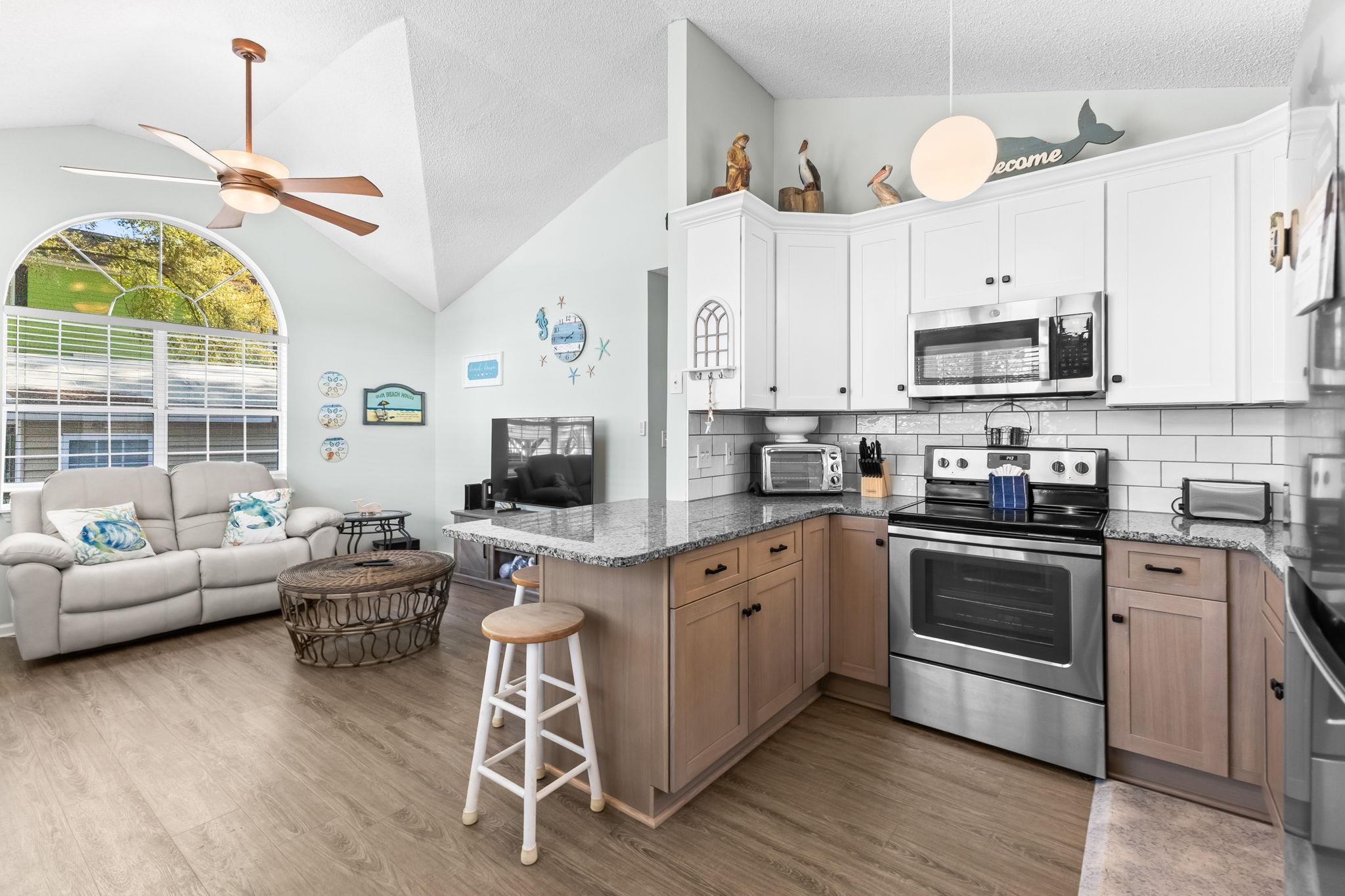 Interior Features: CeilingFans, Furnished, SplitBedrooms, SeparateShower, Vanity, VaultedCeilings, BreakfastBar, BreakfastArea, StainlessSteelAppliances, SolidSurfaceCounters