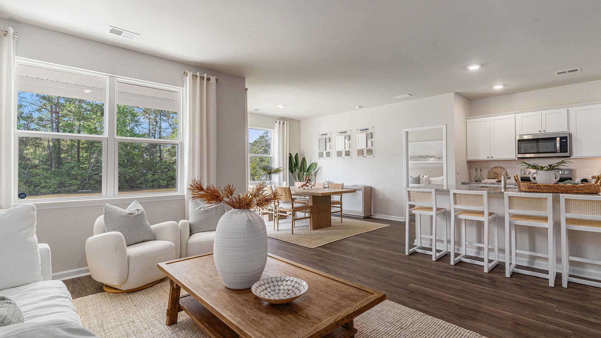 This thoughtfully designed one level home is one of our most popular floor plans! With an open concept living room, dining room and kitchen, this home is bright, spacious, and designed for entertaining guest or comfortably interacting with family. The kitchen features granite countertops, a tile backsplash, 36"" cabinets, a spacious pantry, stainless steel appliances including a refrigerator, and island with breakfast bar! Your primary suite awaits off the back of the home with a spacious walk-in closet and master bath with double sinks, a linen closet and 5' shower. Two secondary bedrooms are at the front of the home providing separation from the primary suite. Enjoy the coastal air from the back porch as you wind down in the evening! 2 car garage with garage door opener. This is America's Smart Home! Each of our homes comes with an industry leading smart home technology package that will allow you to control the thermostat, front door light and lock, and video doorbell from your smartphone. *Photos are of a similar Aria home. Pictures, photographs, colors, features, and sizes are for illustration purposes only and will vary from the homes as built. Home and community information, including pricing, included features, terms, availability and amenities, are subject to change and prior sale at any time without notice or obligation. Square footage dimensions are approximate. Equal housing opportunity builder.