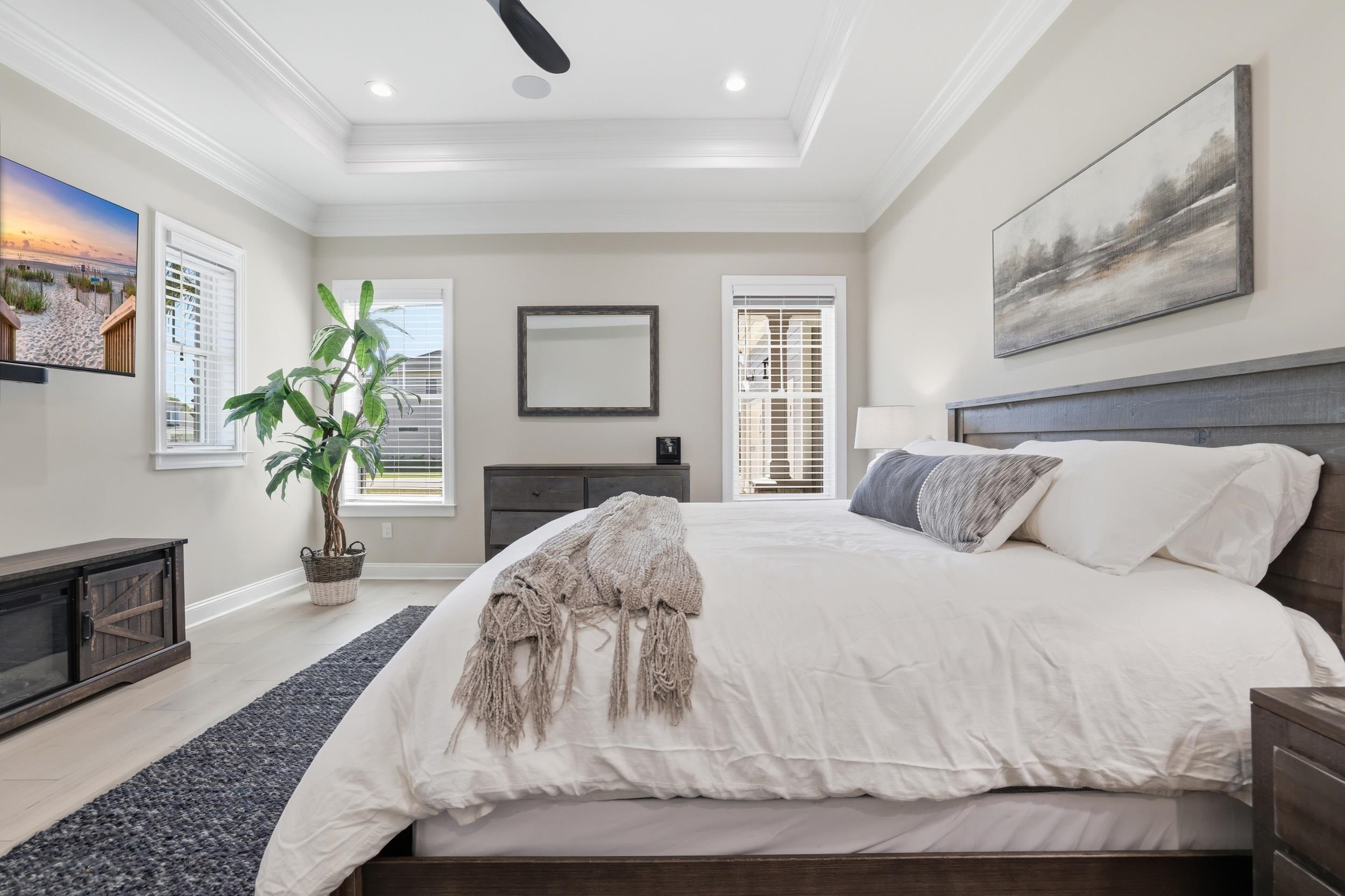 PrimaryBedroom: TrayCeilings, CeilingFans, MainLevelPrimary, WalkInClosets