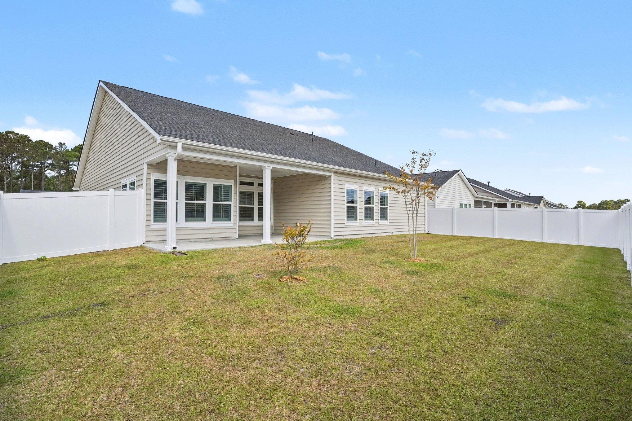Stunning single-story, Lexington floor plan by Lennar, built in 2025 and located on a desirable CORNER LOT in Hidden Pines. This move-in ready home features an open-concept layout with vaulted ceilings, office/ den that could easily be closed off for privacy, a spacious Great Room, and a gourmet kitchen with a large island, granite countertops, tile backsplash, and stainless-steel appliances including a gas range. Enjoy both a formal dining area and a bright breakfast nook. The private primary suite offers a walk-in closet and a spa-like bath with dual vanities and a fully tiled glass-enclosed shower. Outdoor living is equally impressive. Enjoy the covered lanai overlooking a fenced, private backyard, perfect for relaxing, entertaining, or accommodating pets. The rare three-car garage offers ample space for vehicles, a golf cart, or even a workshop. Upgrades include plantation shutters, modern lighting and 240Volt 50Amp electric service in Garage for Stage 2 EV Charger. Community amenities feature a pool, fire pit, community garden and walking trails, all in the Carolina Forest school district and conveniently located near shopping, dining, golf, and less than 10 miles to the beach. Modern features such as natural gas, a tankless water heater, and the advantages of newer construction complete the package.