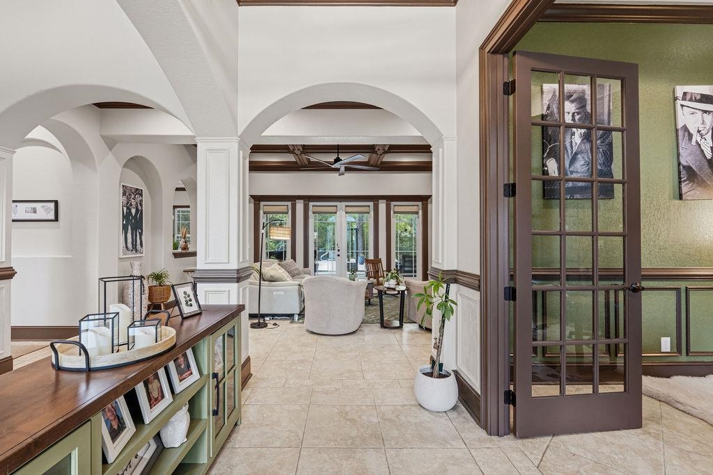 FamilyRoom: BeamedCeilings, TrayCeilings, CeilingFans, Fireplace