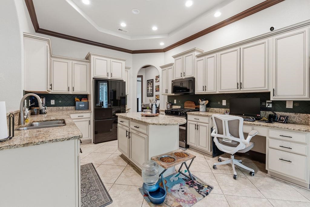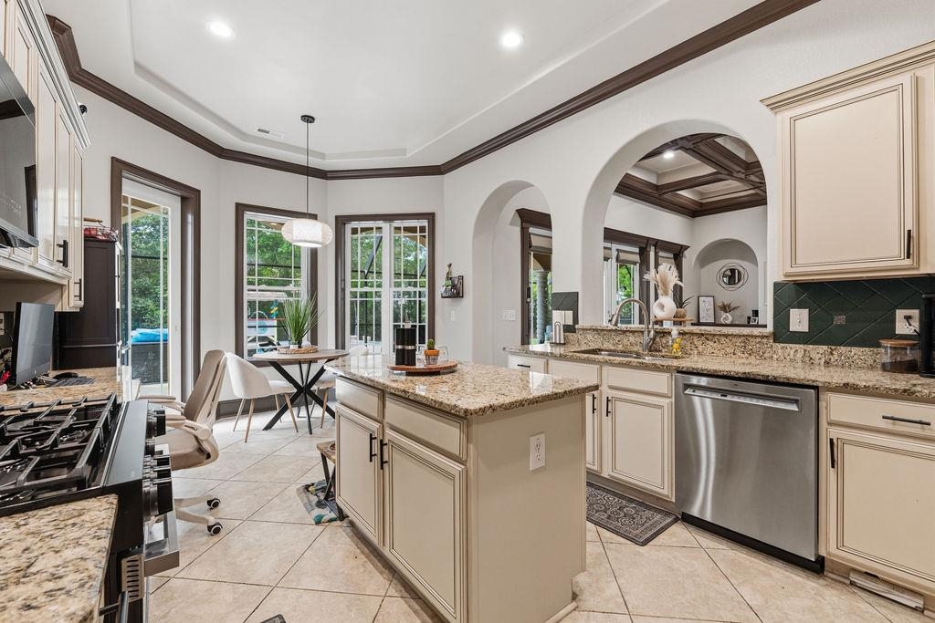 Interior Features: Attic, TrayCeilings, CeilingFans, CentralVacuum, DualSinks, Fireplace, MainLevelPrimary, PullDownAtticStairs, PermanentAtticStairs, SplitBedrooms, SeparateShower, Vanity, WalkInClosets, WindowTreatments, BreakfastBar, BedroomOnMainLevel, EntranceFoyer, KitchenIsland, StainlessSteelAppliances, SolidSurfaceCounters
