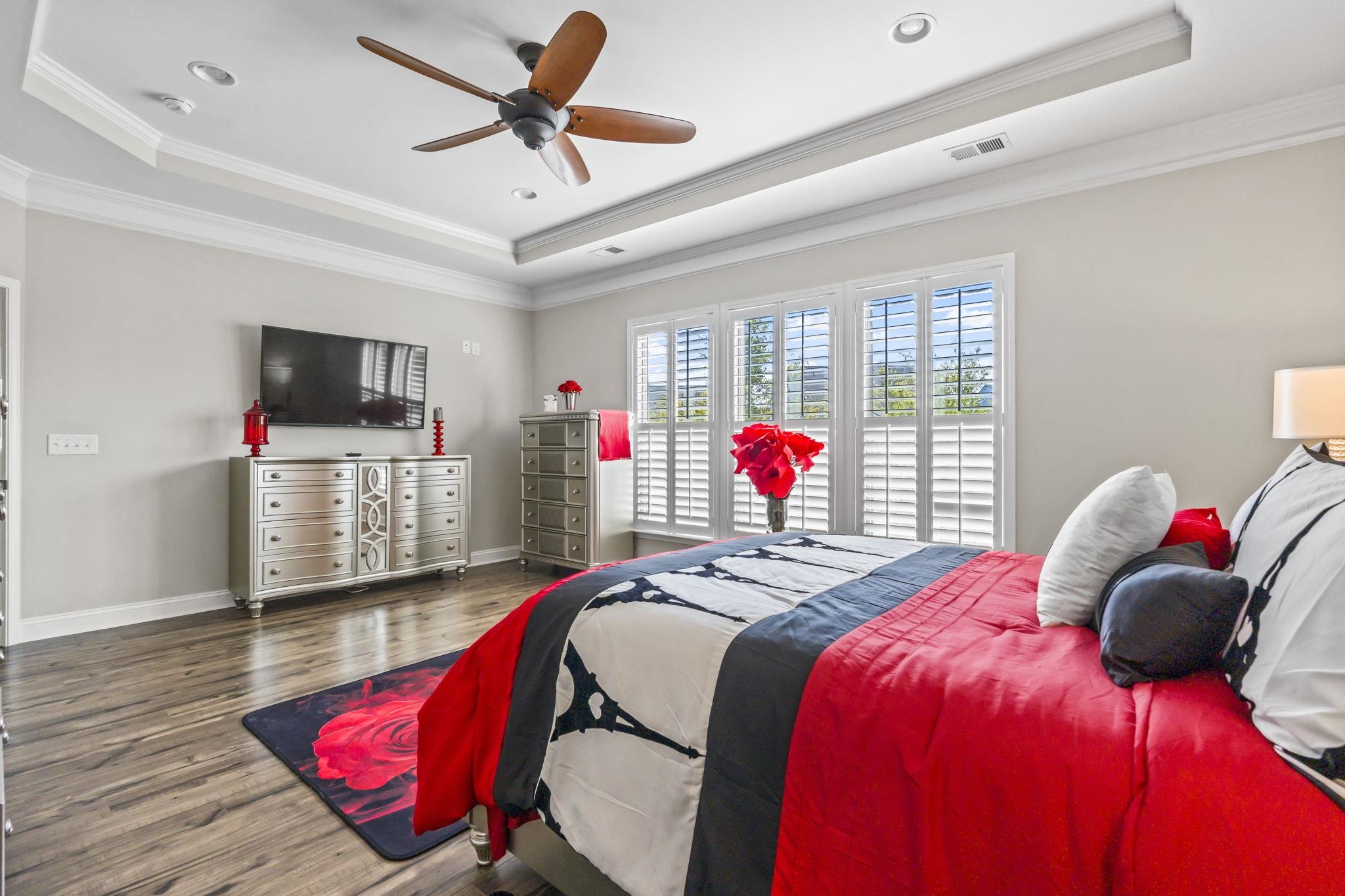 PrimaryBedroom: TrayCeilings, CeilingFans, MainLevelPrimary, WalkInClosets
