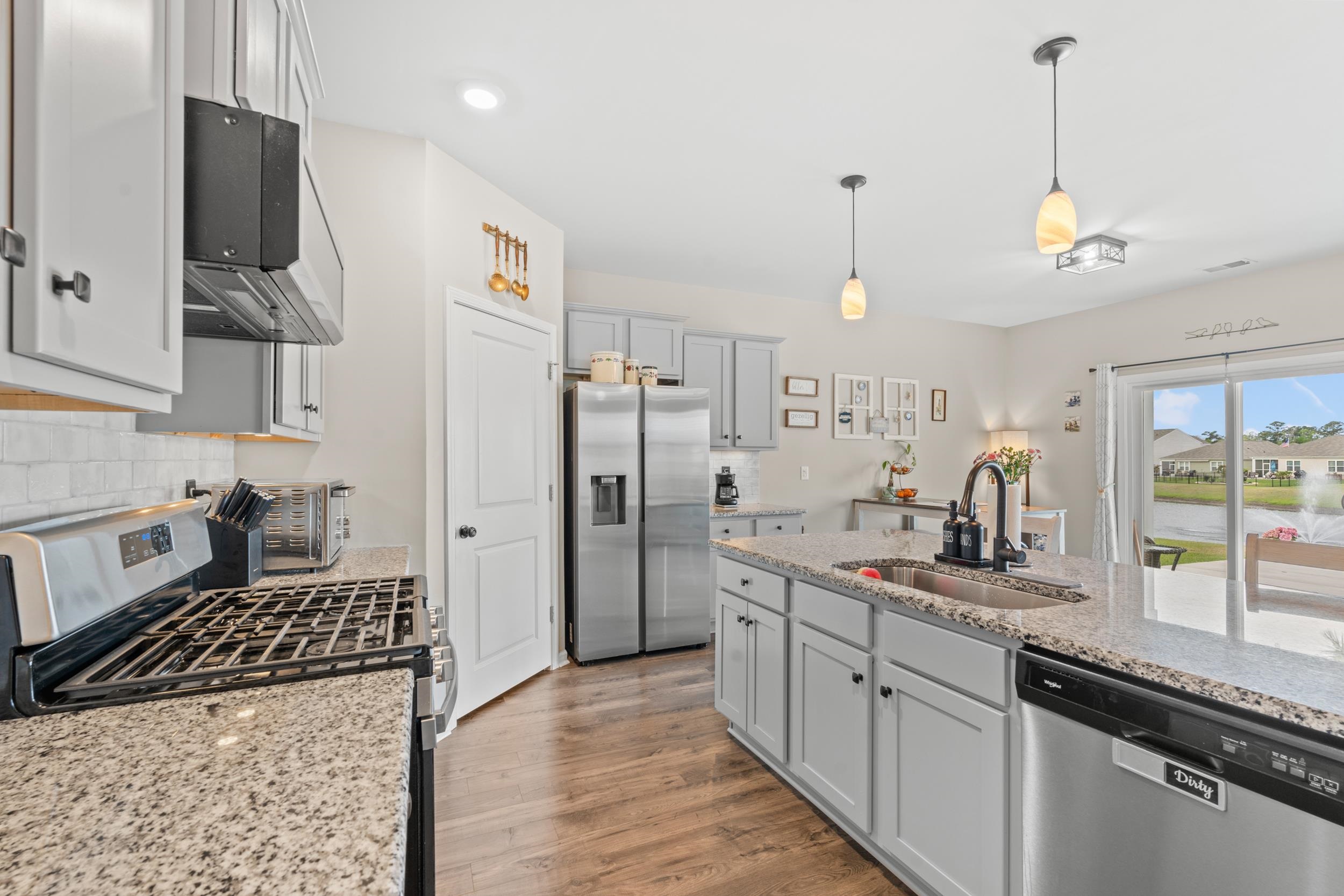 This beautiful Cali floor plan is a desirable layout that is one of the best sellers. You'll fall in love with this floor plan in this sought-after natural gas community. This home features an open concept living room and kitchen that are great for entertaining. You will be able to visualize yourself hosting an event from this kitchen featuring stainless steel appliances, including a gas range with a custom stove hood and exterior vent. This home features 9'ceilings, 36"" painted cabinets, a tankless water heater, granite countertops, tile backsplash in the kitchen, laminate wood floors flowing throughout the main living space, extended concrete patio overlooking the pond. The garage has been finished, painted and has a polysporic floor. There's a full house surge protector, an automatic sensor for HVAC, and a sprinkler system with a Rain Bird App and sensor.