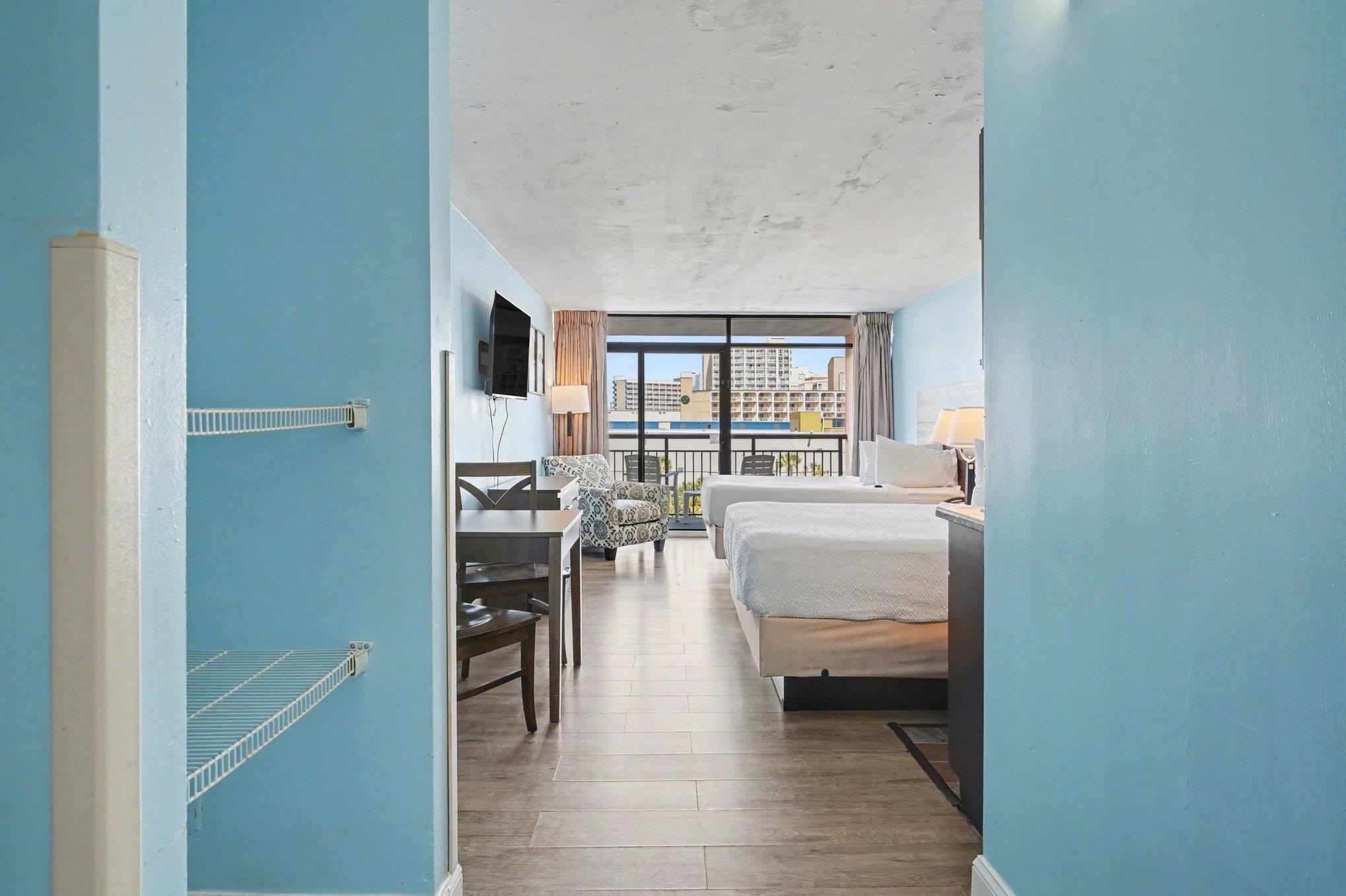 Oceanview efficiency unit in Landmark Resort Phase II, fully updated in 2025 with new LVP flooring throughout, two queen beds, a new accent chair, updated furnishings, custom interior paint, and a freshly painted interior. This furnished condo features a well-appointed kitchenette with granite countertops, a mini-fridge, and a microwave. Step onto the private balcony to enjoy stunning ocean and lazy river views. This unit is ideal as a primary residence, vacation getaway, or investment property with strong rental potential. Landmark Resort offers an array of amenities, including indoor and outdoor pools, a lazy river, fitness center, on-site dining, and laundry facilities, all with low, all-inclusive HOA fees. Conveniently located in the heart of Myrtle Beach, just minutes from premier golf courses, shopping, dining, and entertainment along the Grand Strand.