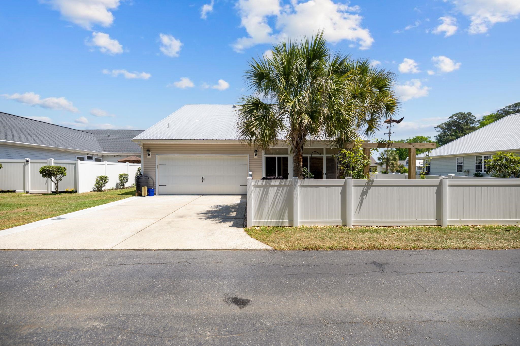 Step into a 3-bedroom, 2-bath home with a rear facing two-car garage in Silver Fox Landing! This home feels like a private retreat from the moment you arrive, where timeless details, smart design, and coastal charm come together. From the start, youll notice the inviting curb appeal, complete with a durable metal roof, a welcoming front porch perfect for morning coffee. Inside, plantation shutters throughout add a touch of classic elegance while offering both style and function. A bright foyer leads into a spacious living room with soaring vaulted ceilings, creating an open, airy feel ideal for both relaxing and entertaining. The thoughtfully designed split-bedroom floor plan offers privacy, with the primary suite conveniently located on the first floor. The owners retreat features a tray ceiling, walk-in closet, and a private ensuite bath with double vanity, soaking tub, and separate shower. At the center of the home, the kitchen shines with stainless steel appliances, a breakfast bar, and a dining area accented with wainscoting and abundant windows that flood the space with natural light. A separate laundry area adds everyday convenience. Out back, the lifestyle truly comes to life with an all-seasons Carolina room that opens to a beautifully landscaped, fully fenced backyard which is your own outdoor oasis with mature palm trees, a patio for gatherings, and a charming stone pathway that invites you to unwind. Located in a community with a pool and close to everything the area has to offer, this home delivers the perfect blend of comfort, style, and easy coastal living, book your showing today!